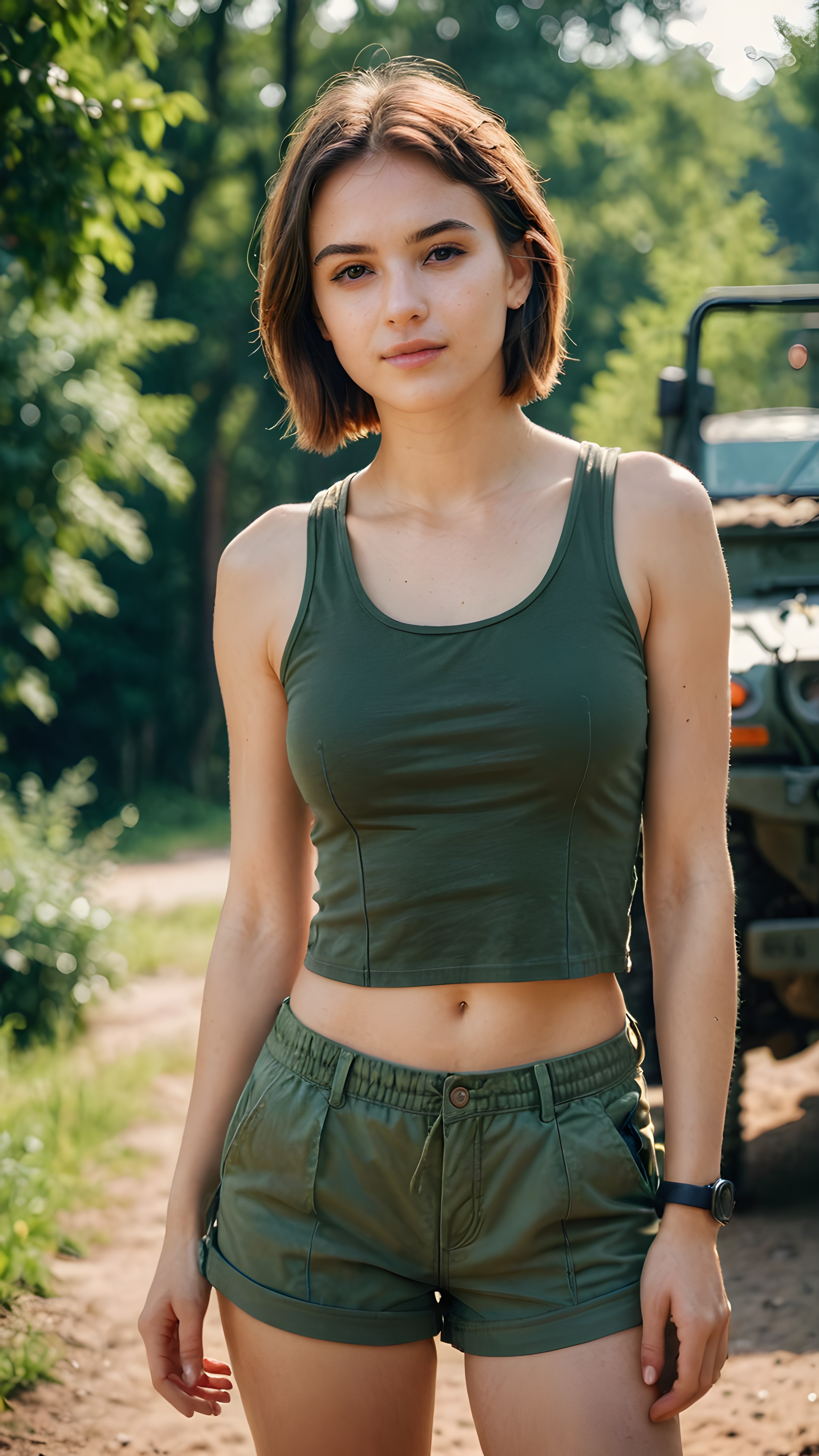 a cute young army girl, thin dressed in a cropped tank top, short pants