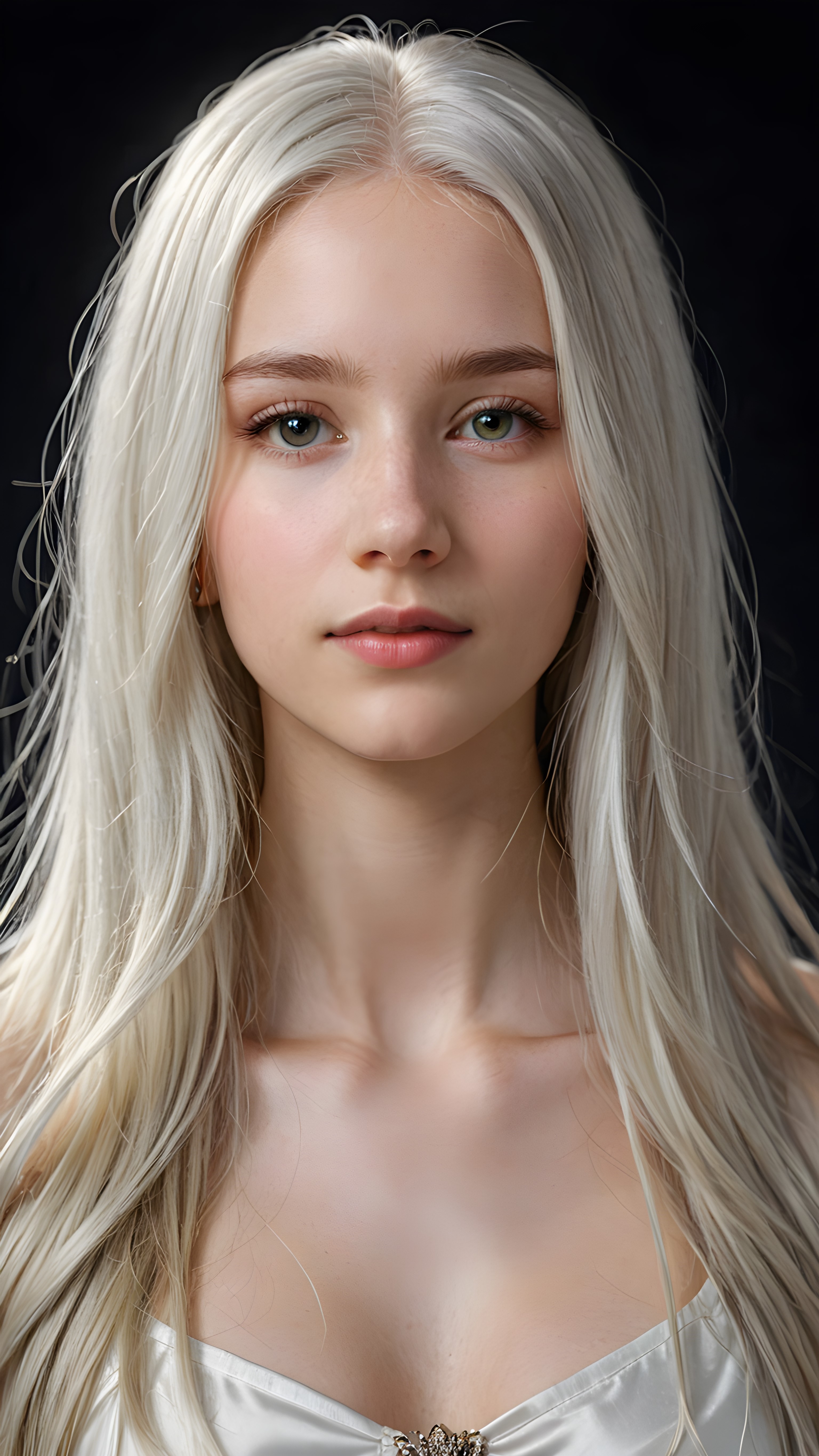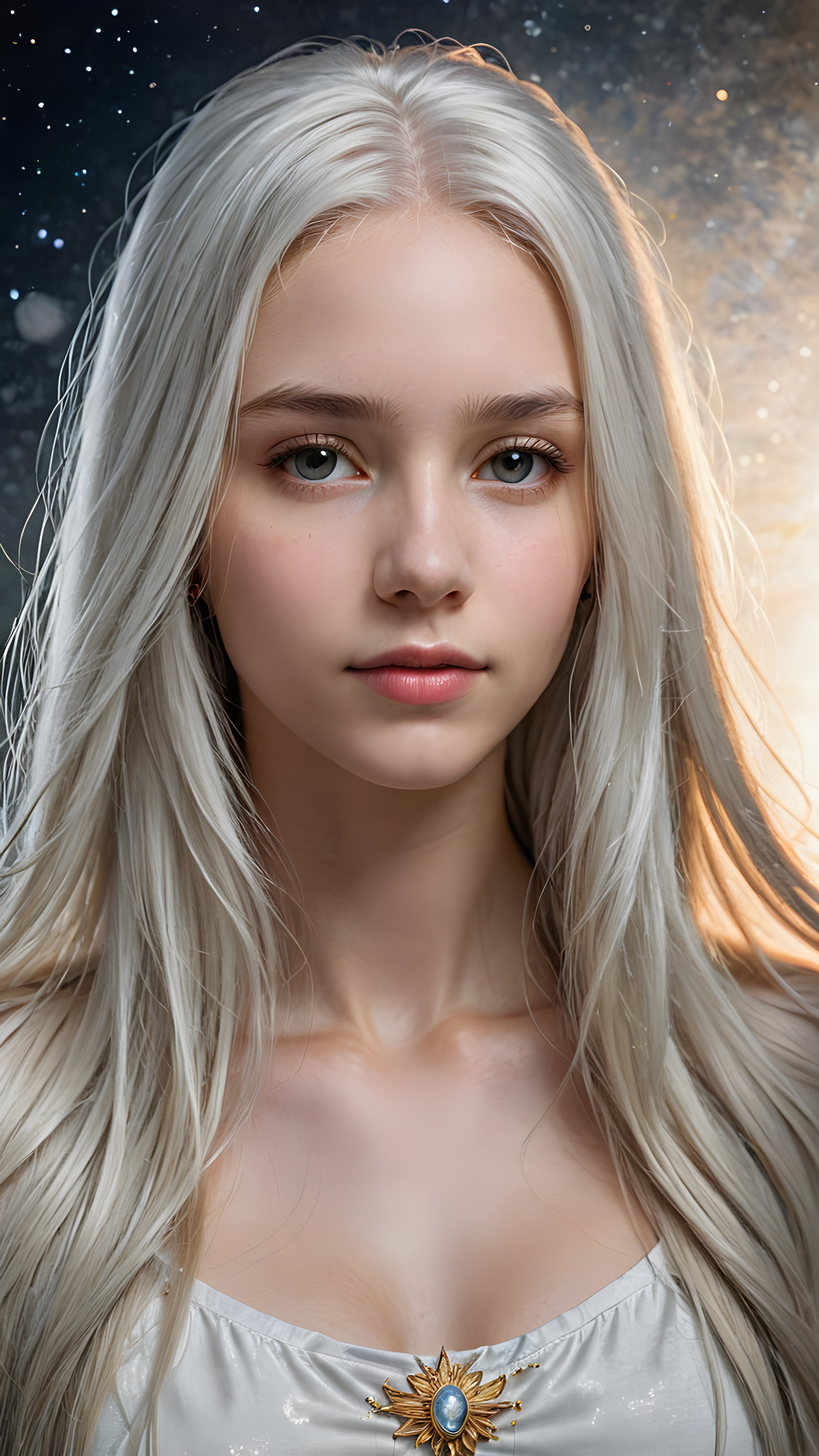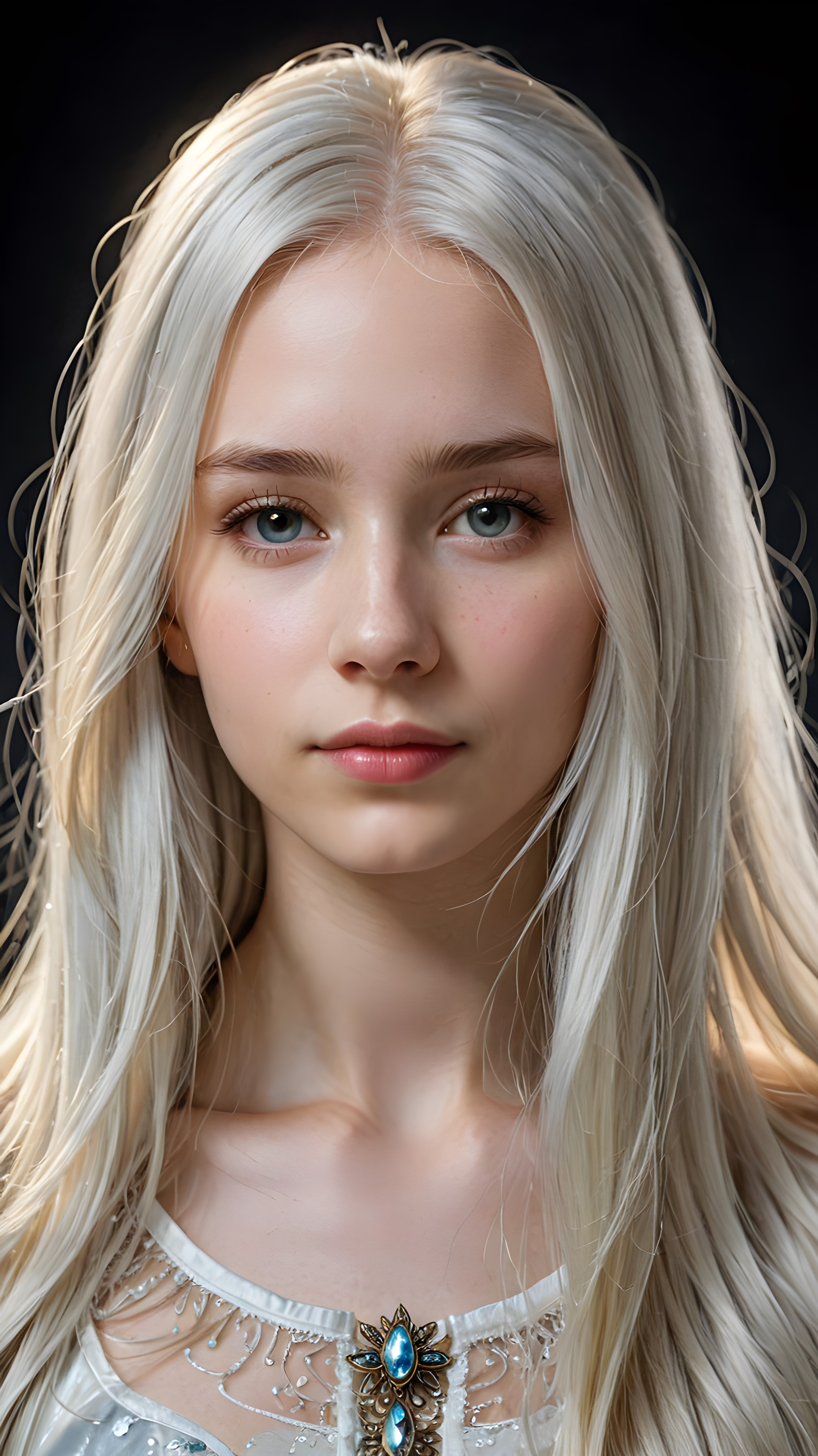 a (((detailed and realistic portrait))), featuring a (((beautiful teen girl with extremely long straight white hair))), with a gently diffused glow that casts, an ethereal halo around her form, illustrating a sense of (otherworldly mystery) and fantasy that defies the ordinary