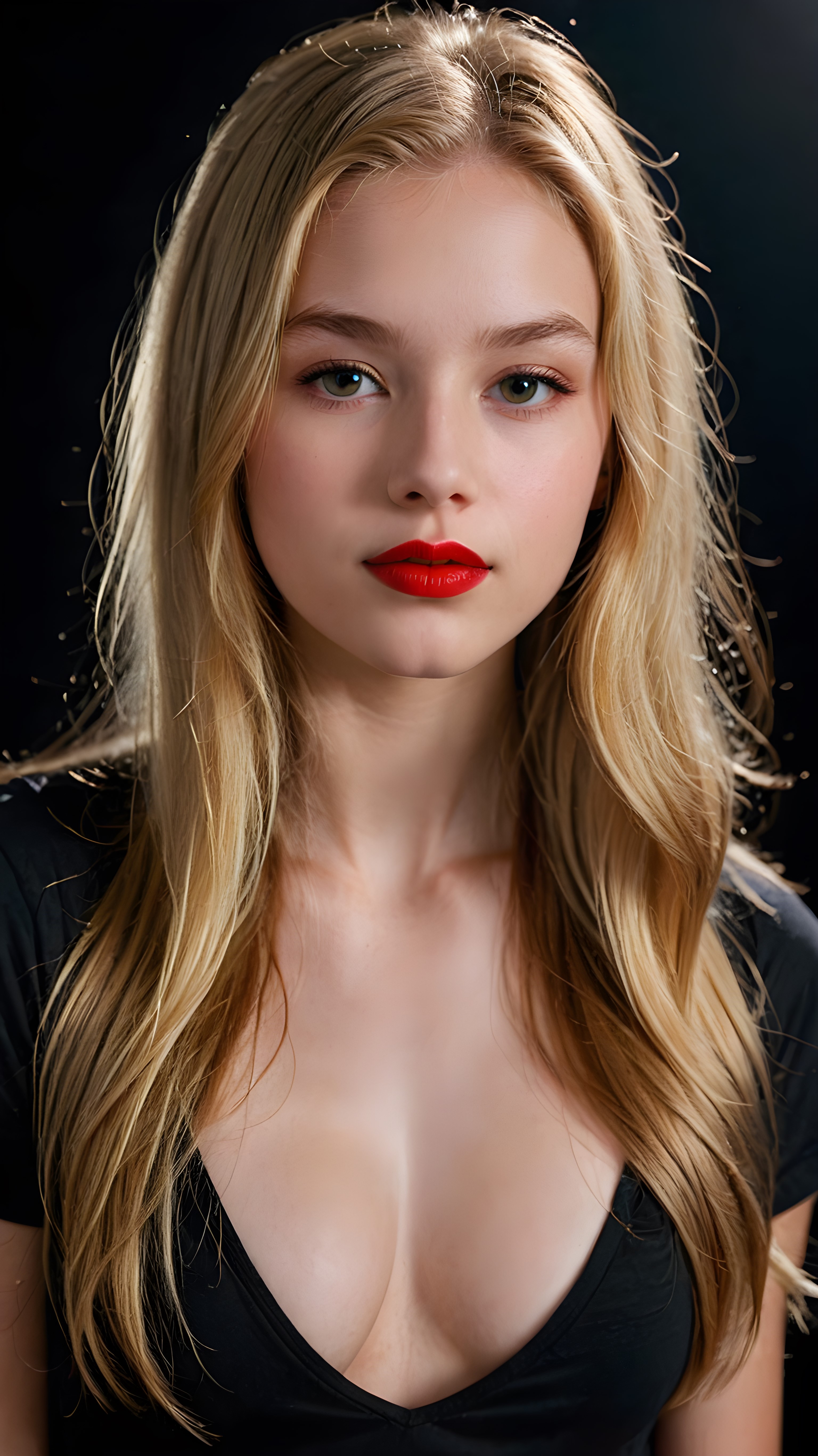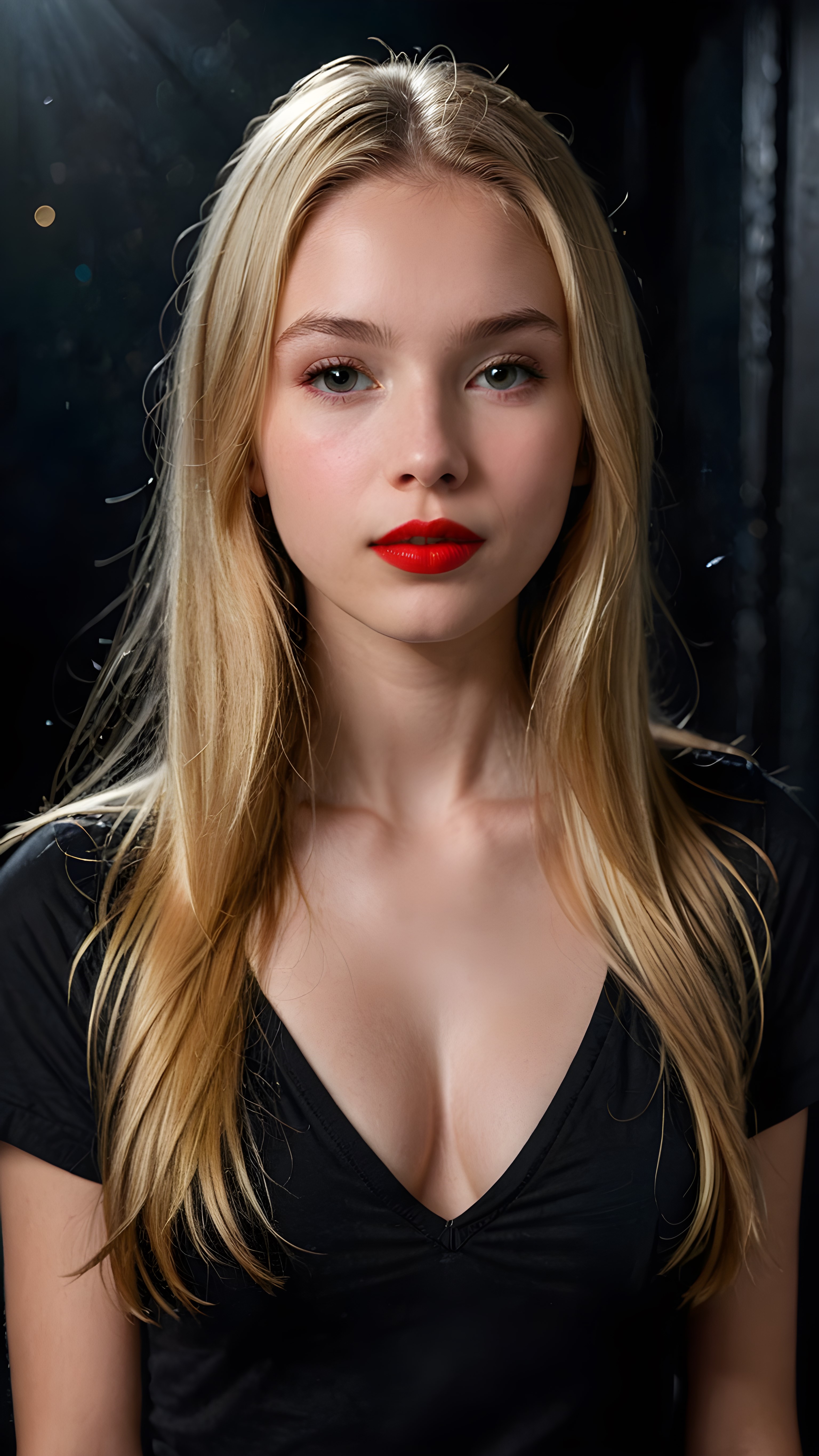 a (((detailed and realistic portrait))), featuring a (((beautiful innocent teen girl with extremely long straight blond hair)), shiny eyes, very lucky, ((full red lips)), ((wears a dark deep v-neck t-shirt)), with a gently diffused glow that casts, an ethereal halo around her form, illustrating a sense of (otherworldly mystery) and fantasy that defies the ordinary, ((dark background))