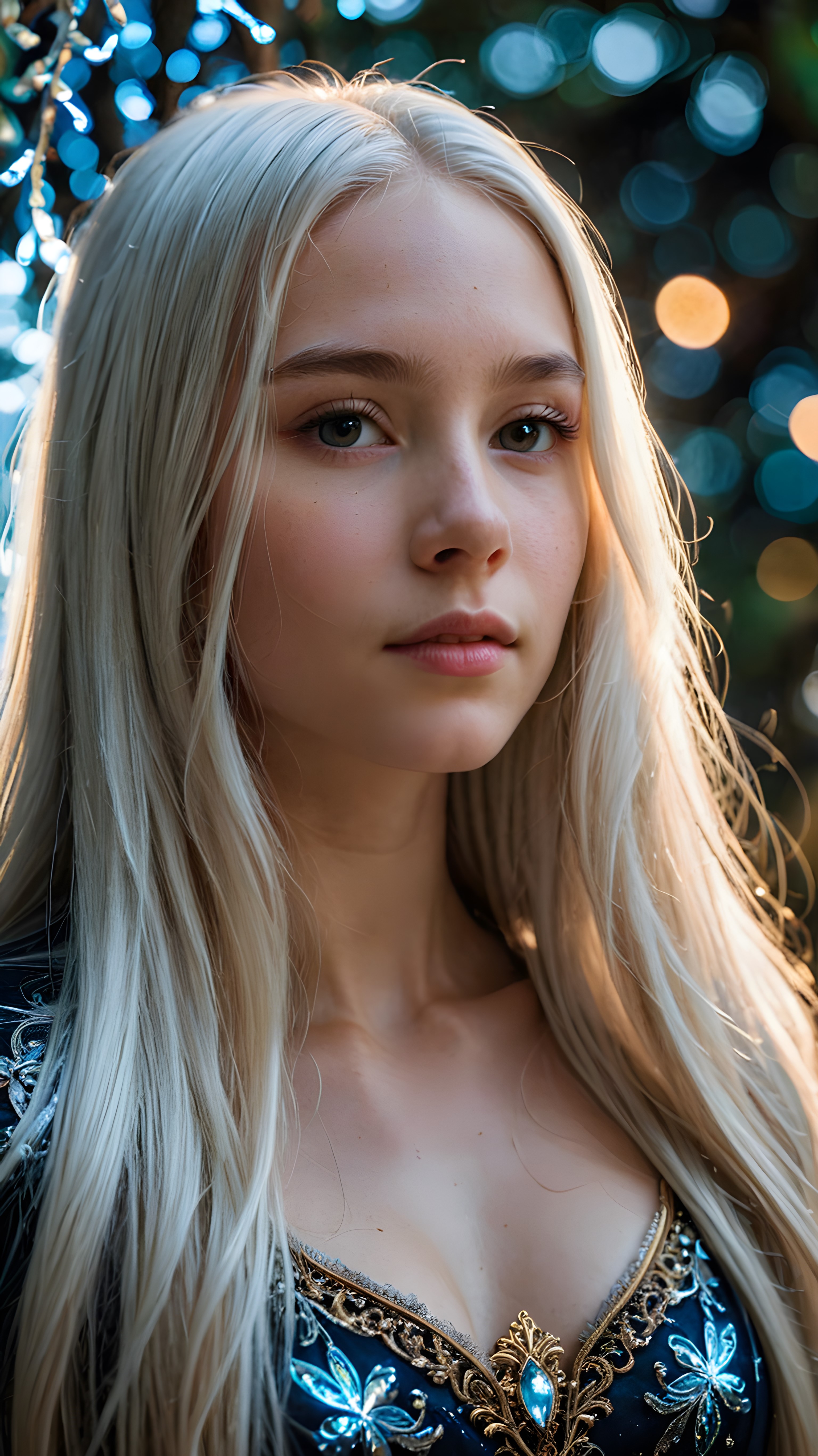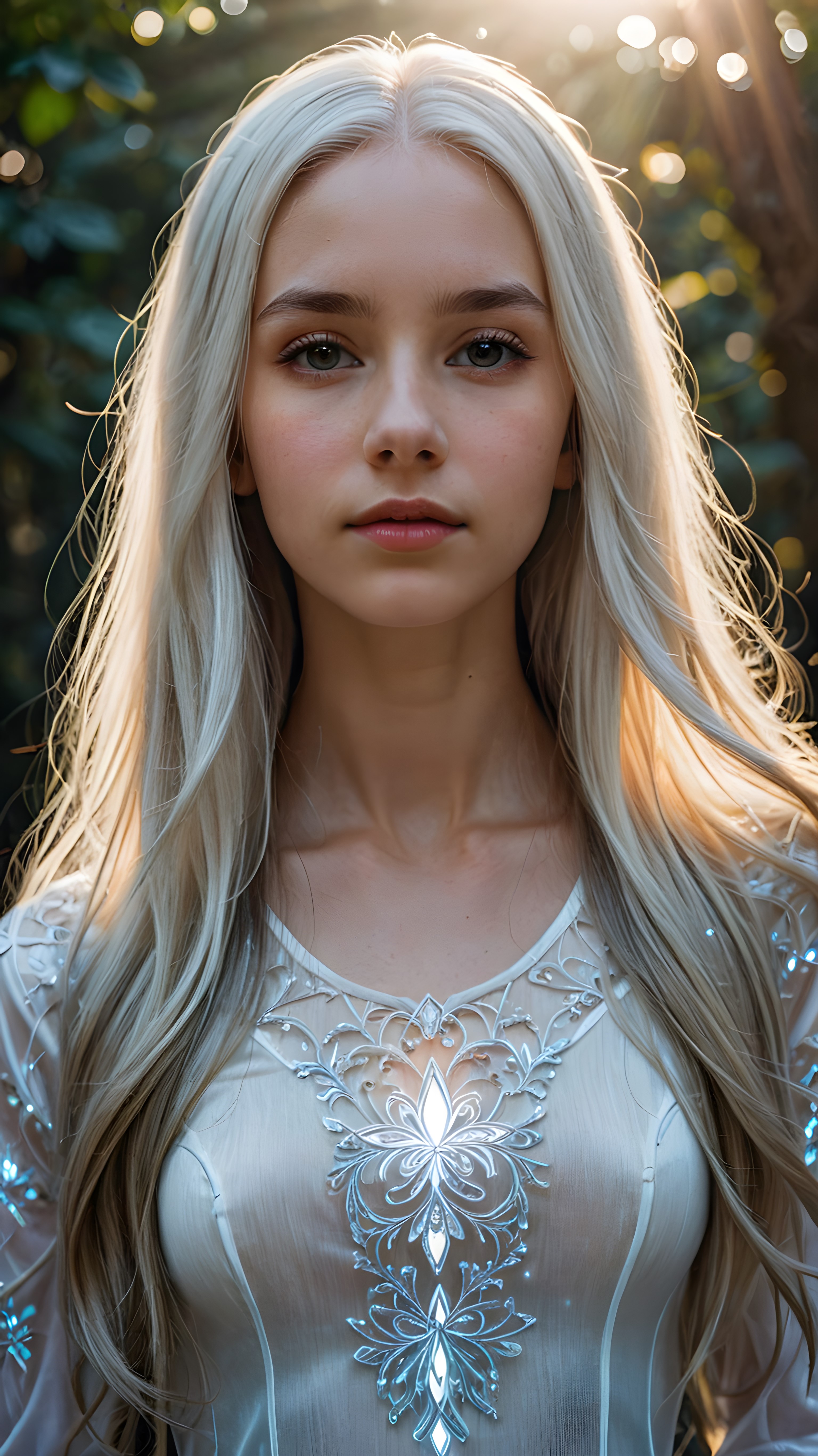 a (((detailed and realistic portrait))), featuring a (((beautiful teen girl with extremely long straight white hair))), emanating a (((glowing, ethereal light))), indicative of (magical abilities). Her features are (((sharp and clear))), with (realistic proportions) and (hyper-detailed, intricate patterns). The scene is (well lit) and (natural), with (bioluminescent details) that give off a sense of (otherworldly mystery) and fantasy that defies the ordinary