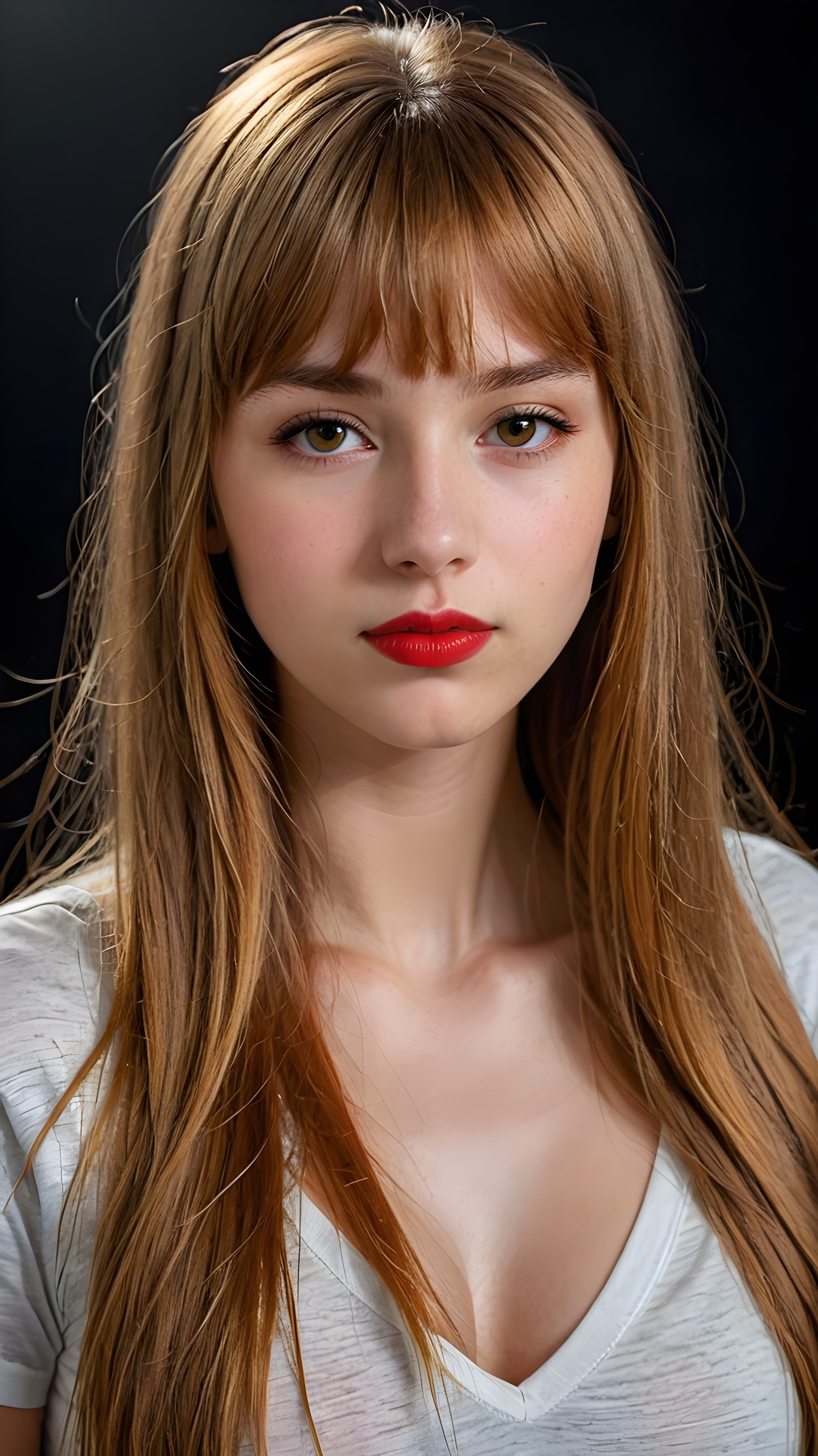 a (((detailed and realistic portrait))), featuring a (((beautiful innocent teen girl with extremely long straight amber hair, bangs frame her face))), shiny eyes, ((full red lips)), ((wears a deep v-neck t-shirt)), with a gently diffused glow that casts, an ethereal halo around her form, illustrating a sense of (otherworldly mystery) and fantasy that defies the ordinary, ((dark background))