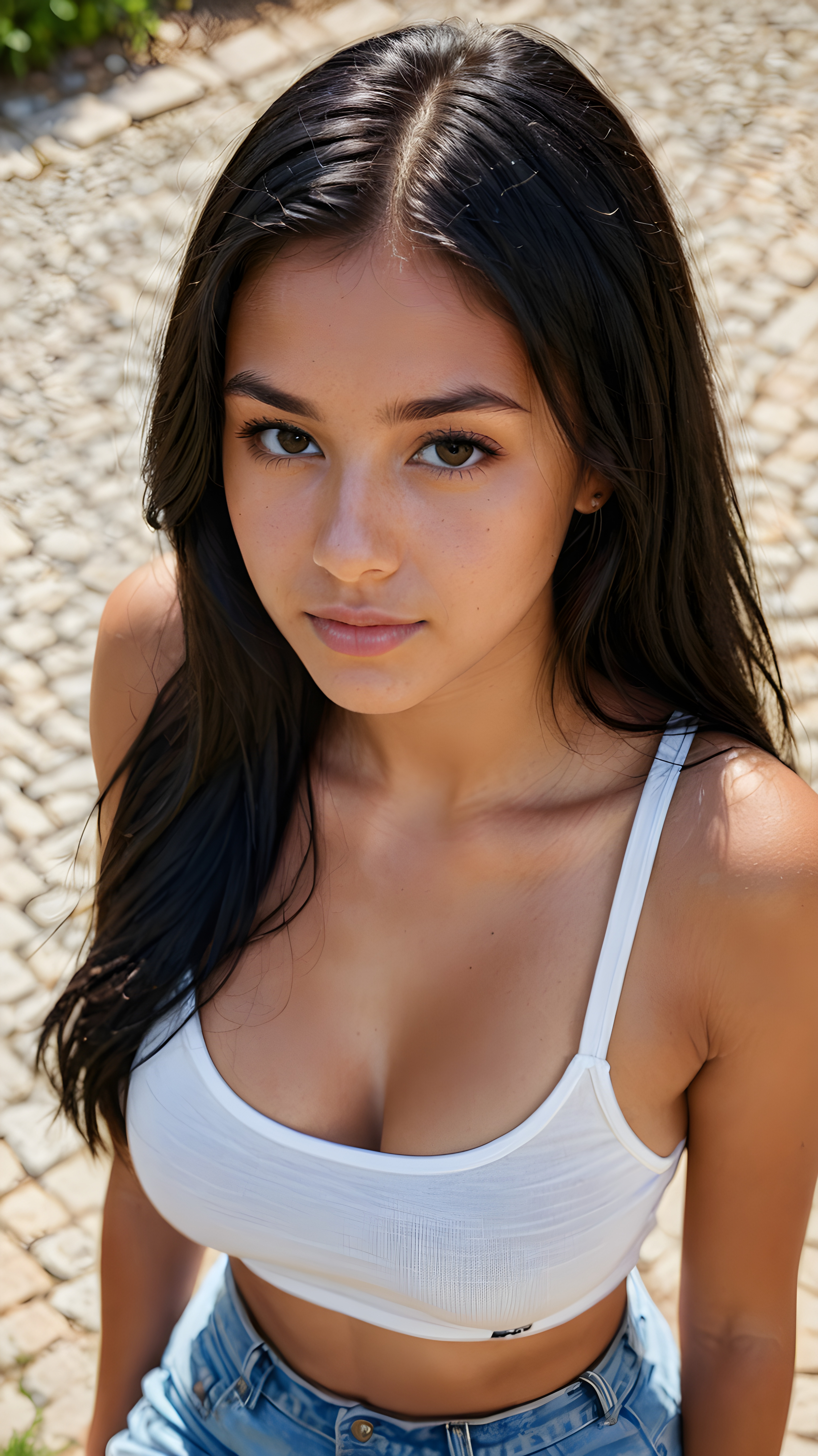 a cute young tanned well busty teen girl filmed from above, tank top, long black hair