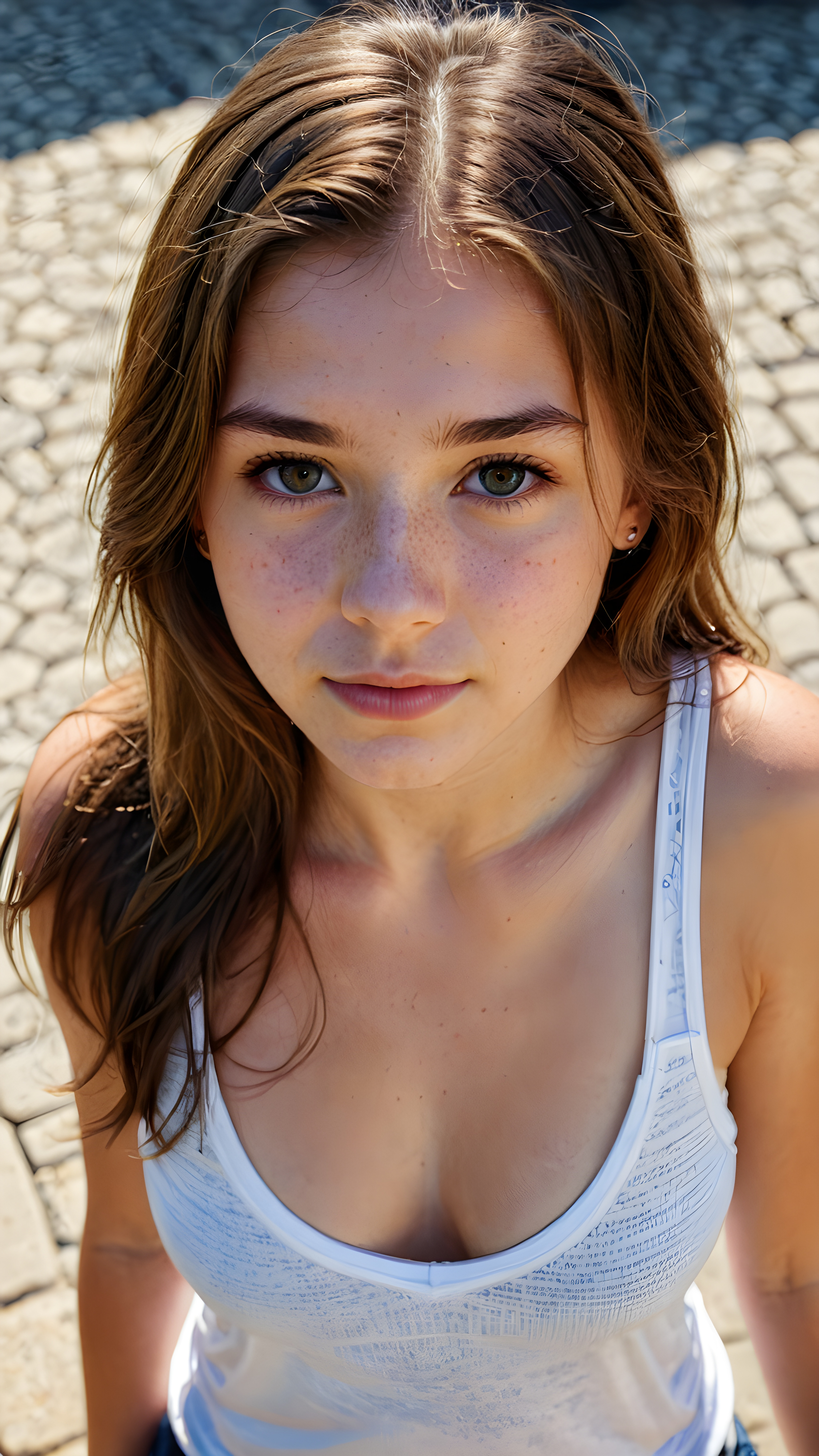 a cute young tanned busty teen girl filmed from above, tank top, long hair