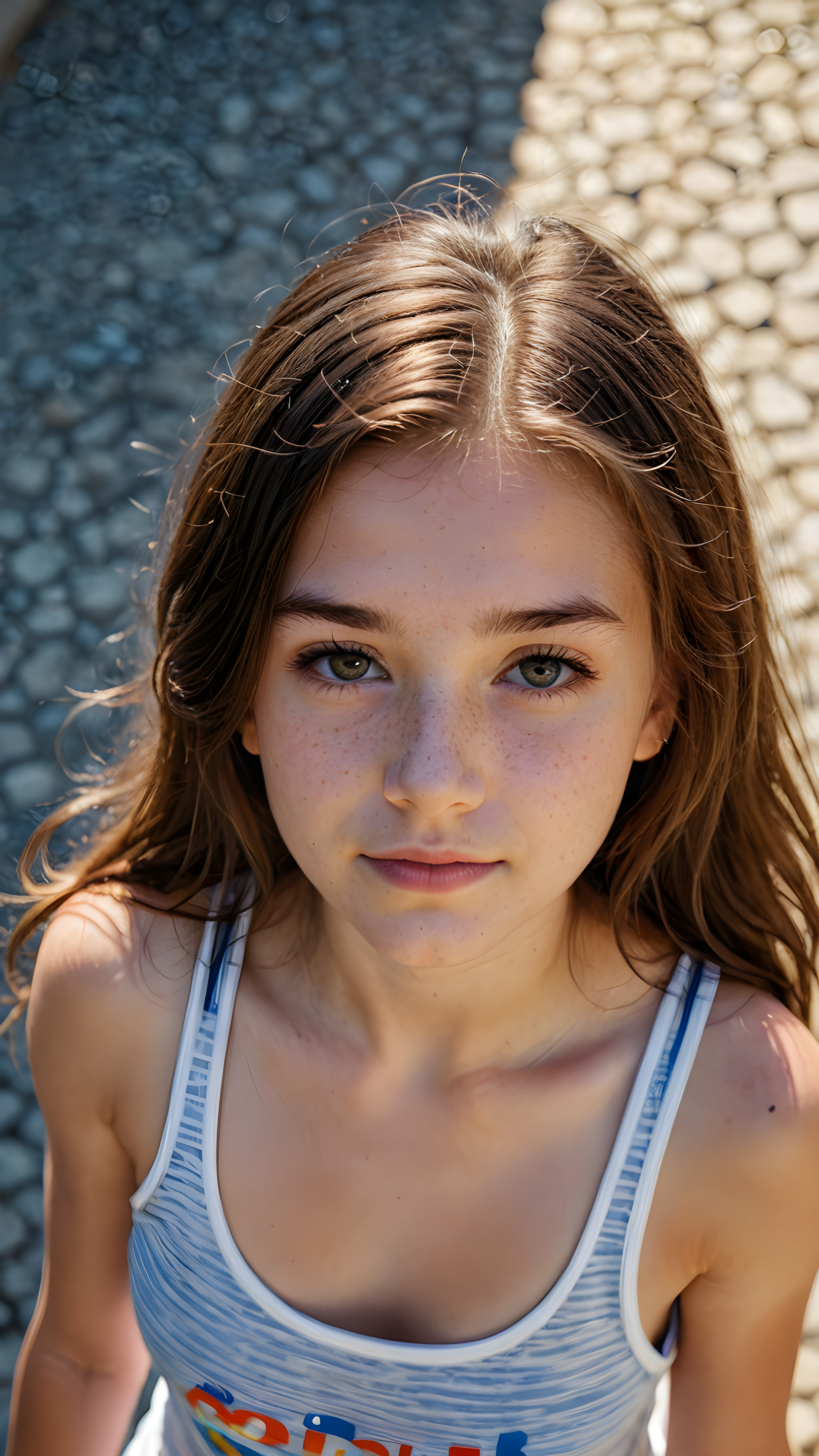 a cute young teen girl filmed from above, tank top, long hair