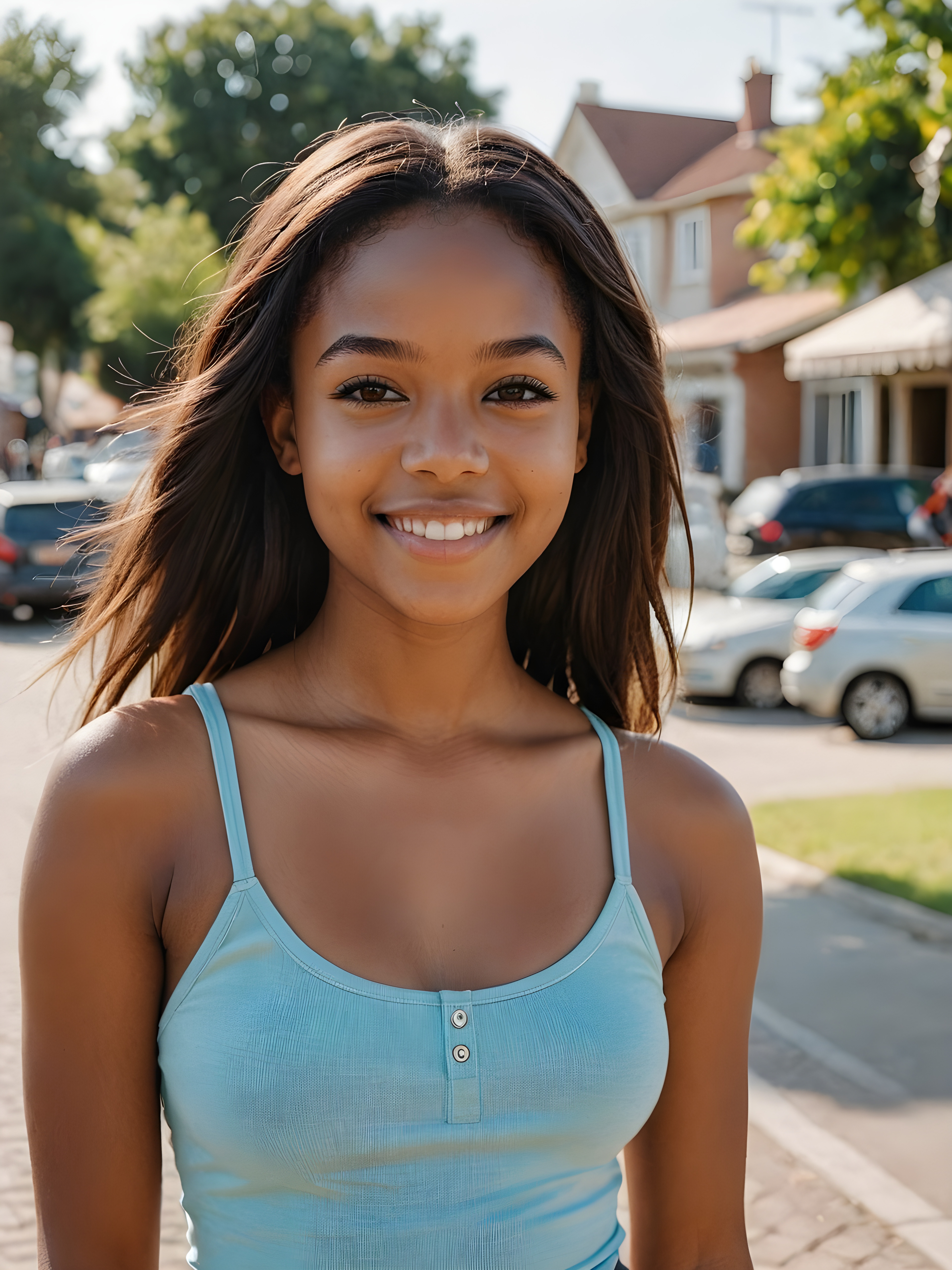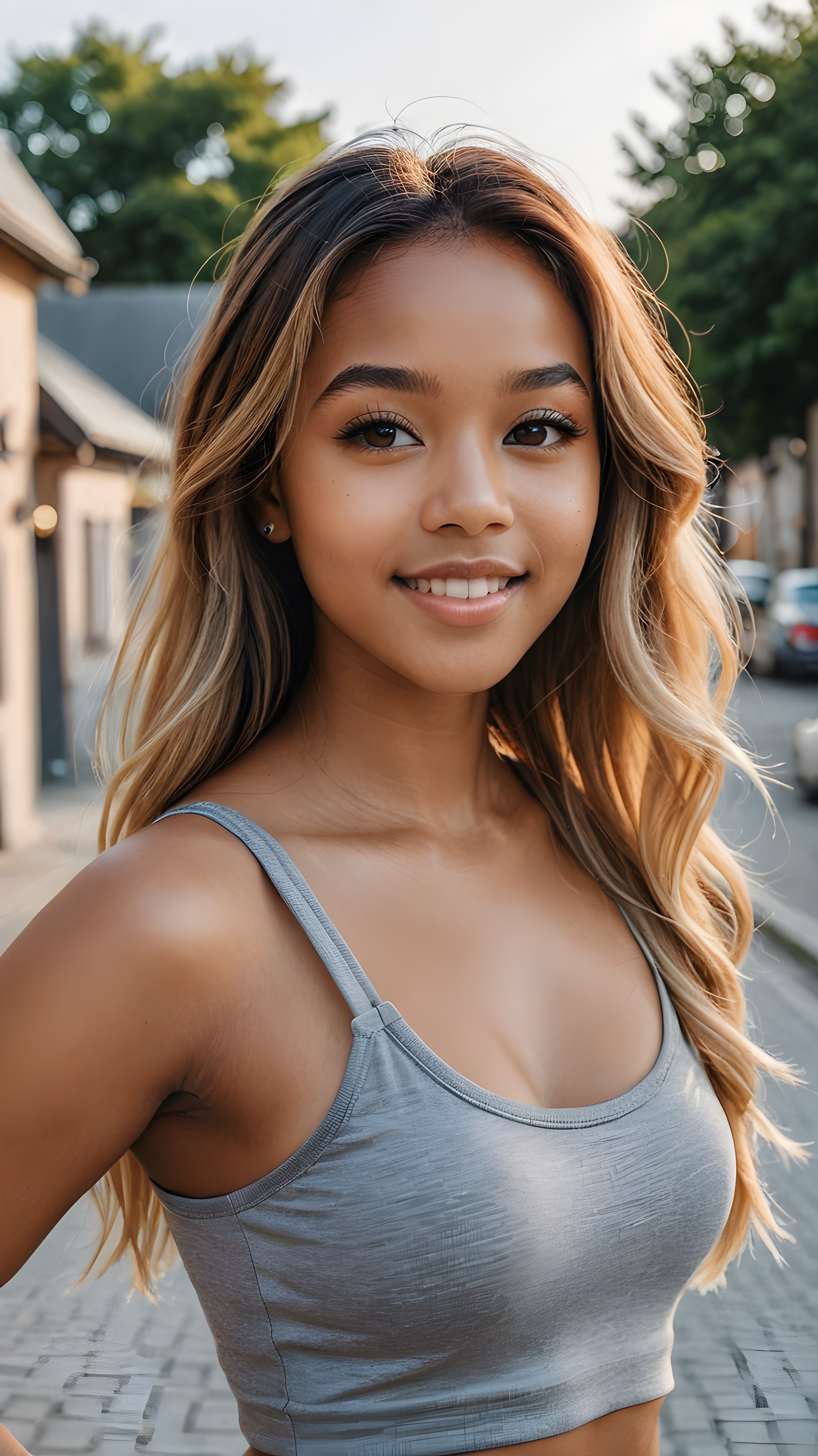 ((portrait)) ((stunning)) detailed, a beautiful young happy melanin girl, long straight soft blonde hair, ((grey crop top)), perfect curved body