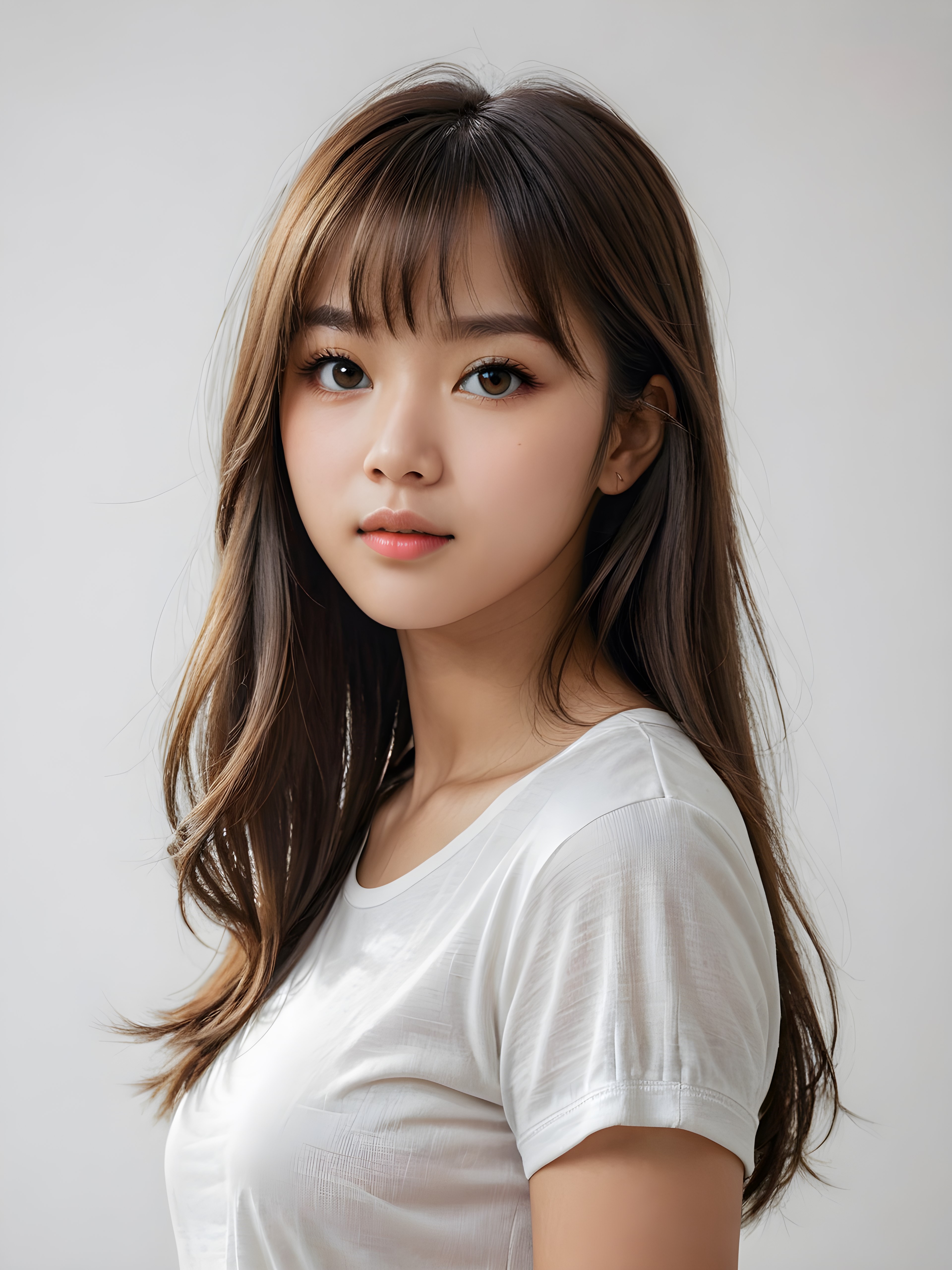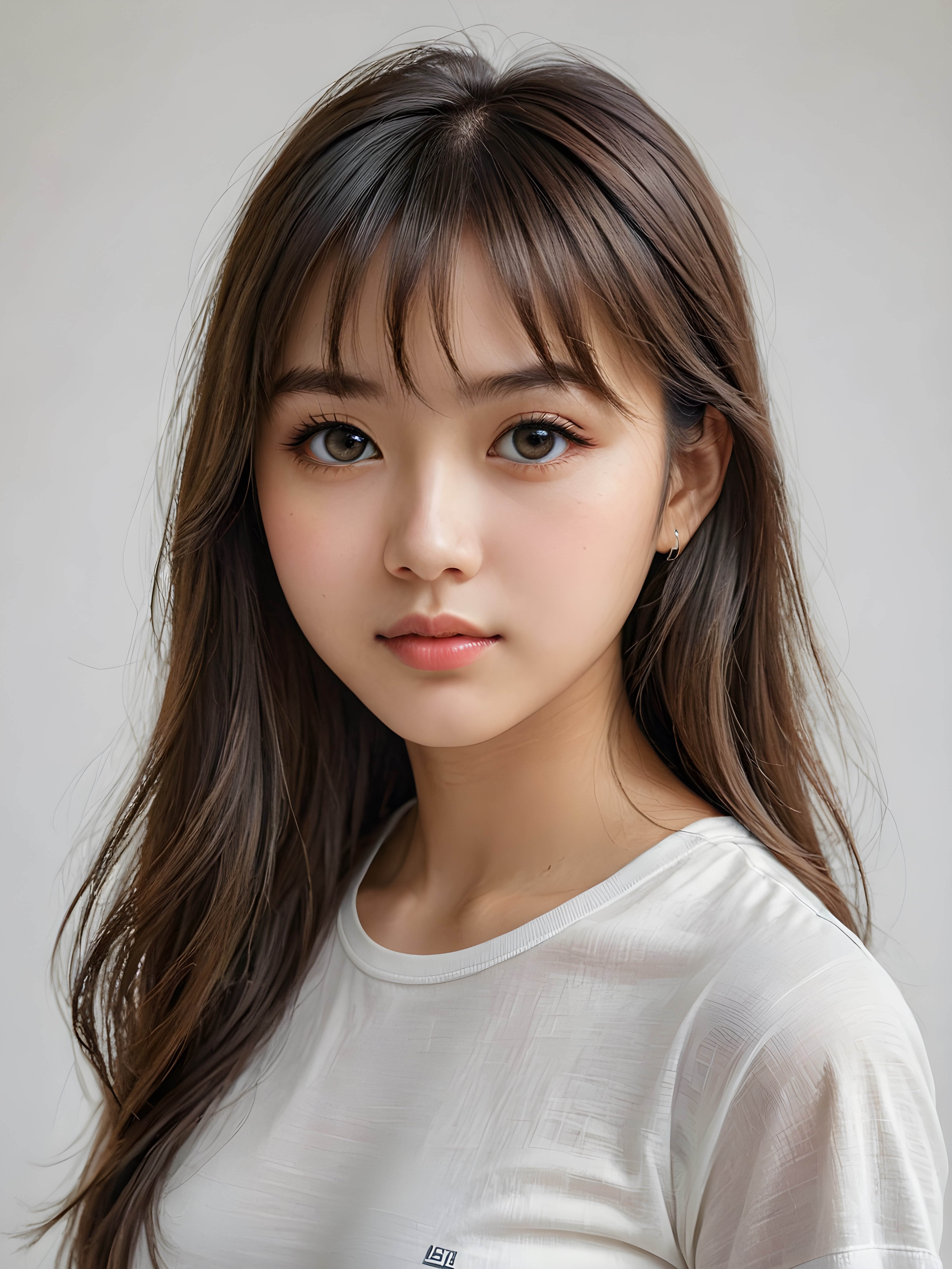 ((portrait)) of (((cute))) (((elegant))) ((attractive)) (((long, straight hair))) ((stunning)) ((pencil drawing)) a beautifully realistic, cinematic lights, Asian teen girl, 15 years old, bangs cut, realistic detailed angelic round face, ((realistic detailed eye)) looks sadly at the camera, portrait shot, perfect curved body, (wears a super short tight (white t-shirt) made on thin silk), perfect anatomy, white background, side perspective, ((no background))