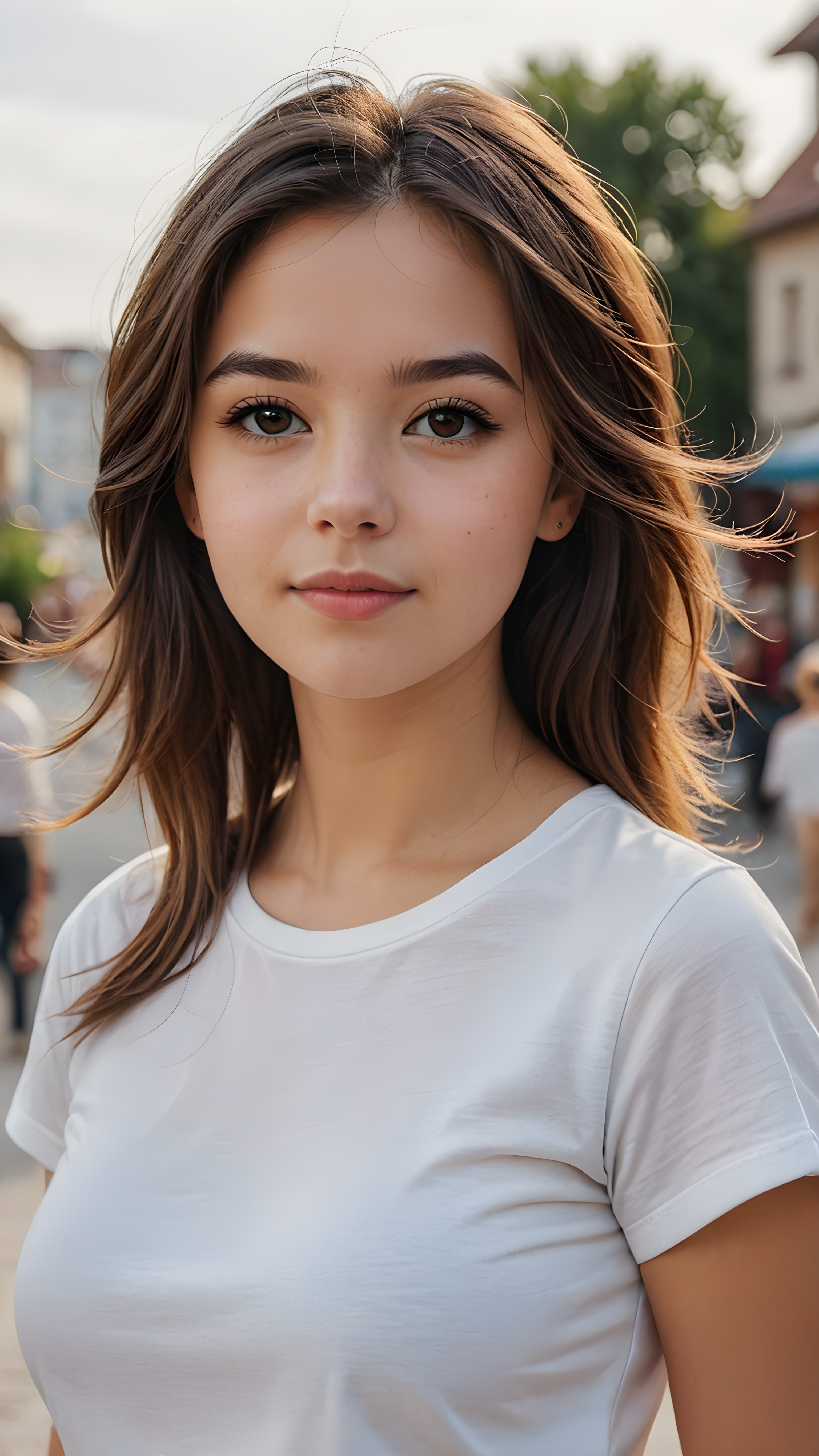 ((portrait)), realistic and detailed, young teen girl, perfect curved body, well busty, white no printed t-shirt