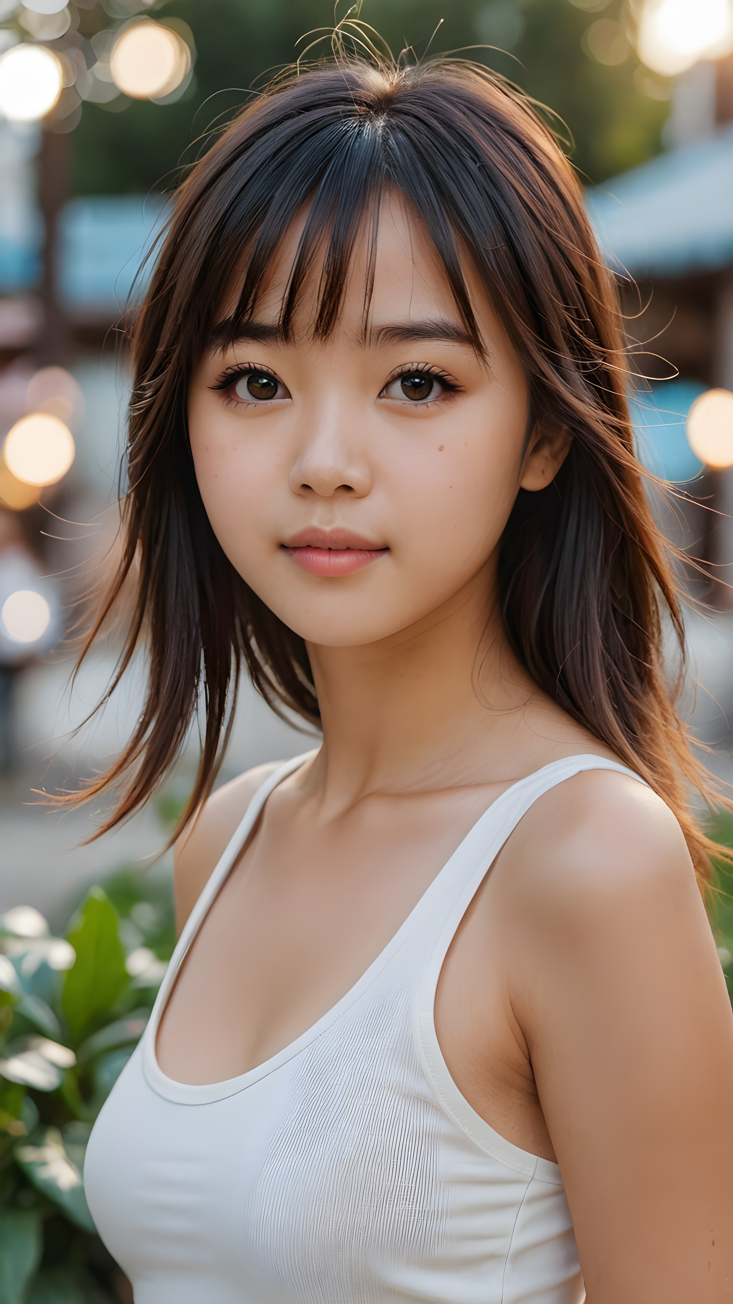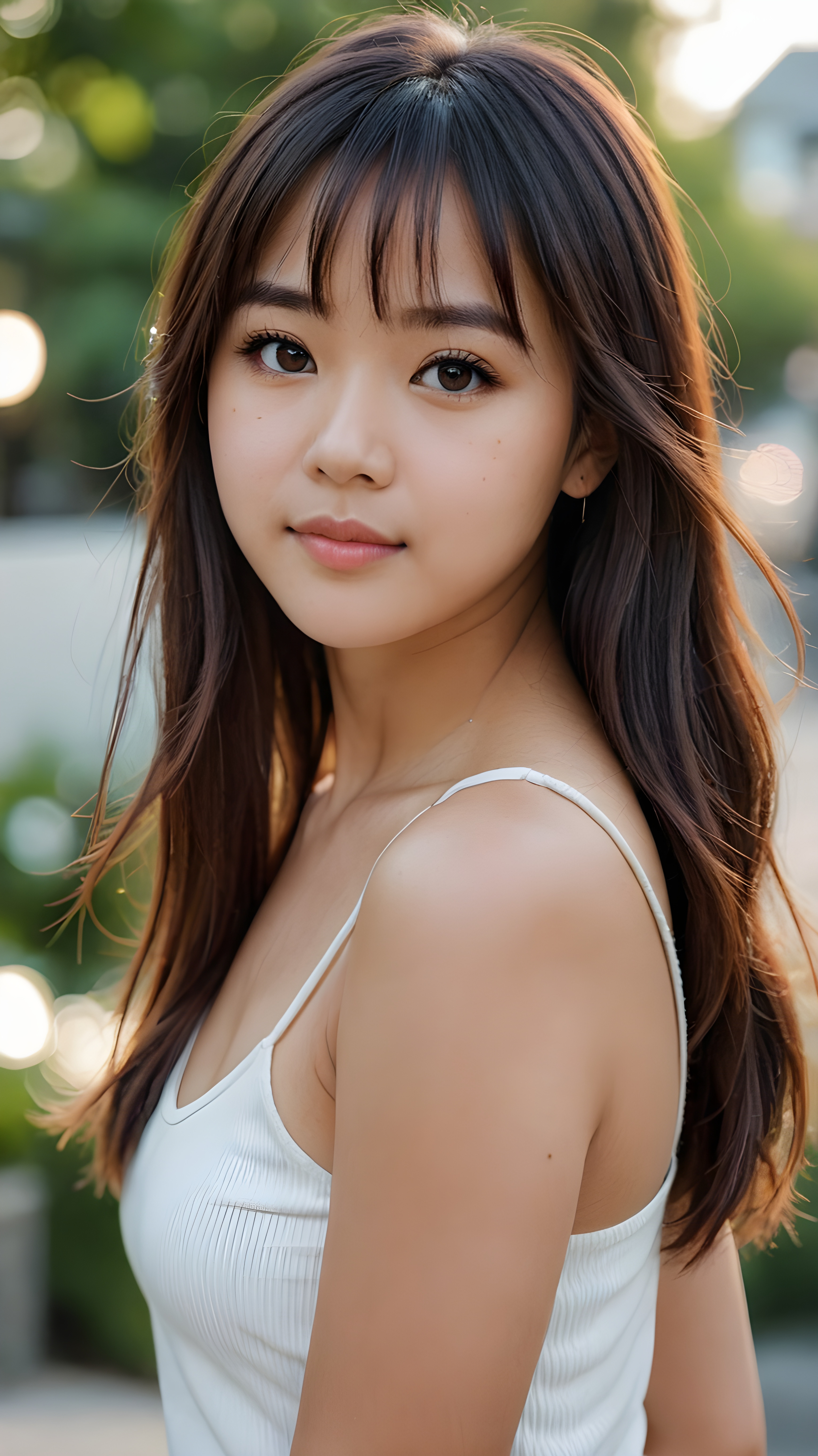 super realistic, 4k, detailed face, perfect curved body, cute Asian teen girl, long straight soft hair, bangs cut, wear only a white short tight tank top, looks at the camera, portrait shot