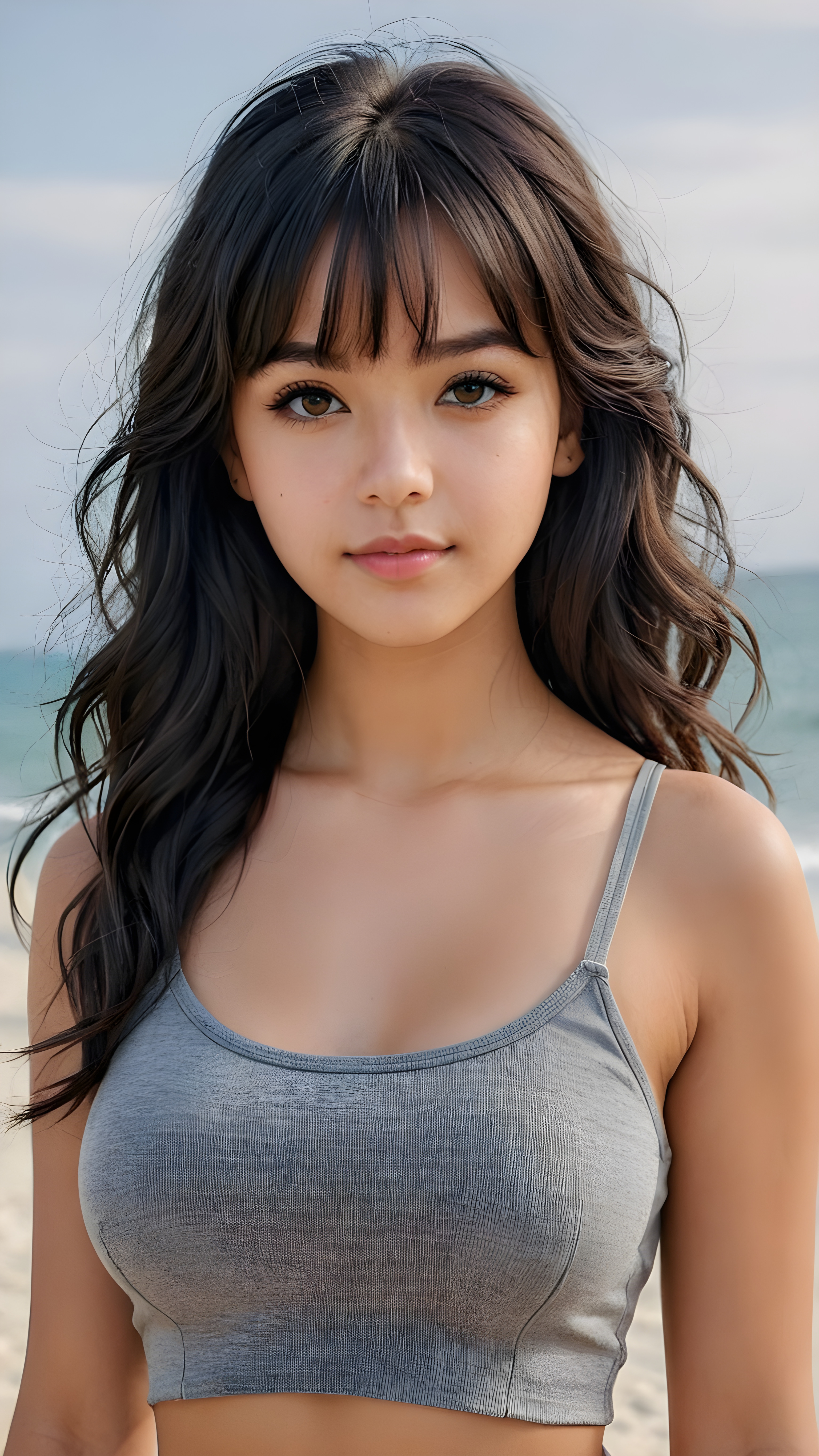 super realistic, 4k, detailed face, perfect curved body, cute Exotic teen girl, long black wavy soft hair, bangs cut, wear a grey crop tank top, looks at the camera, portrait shot
