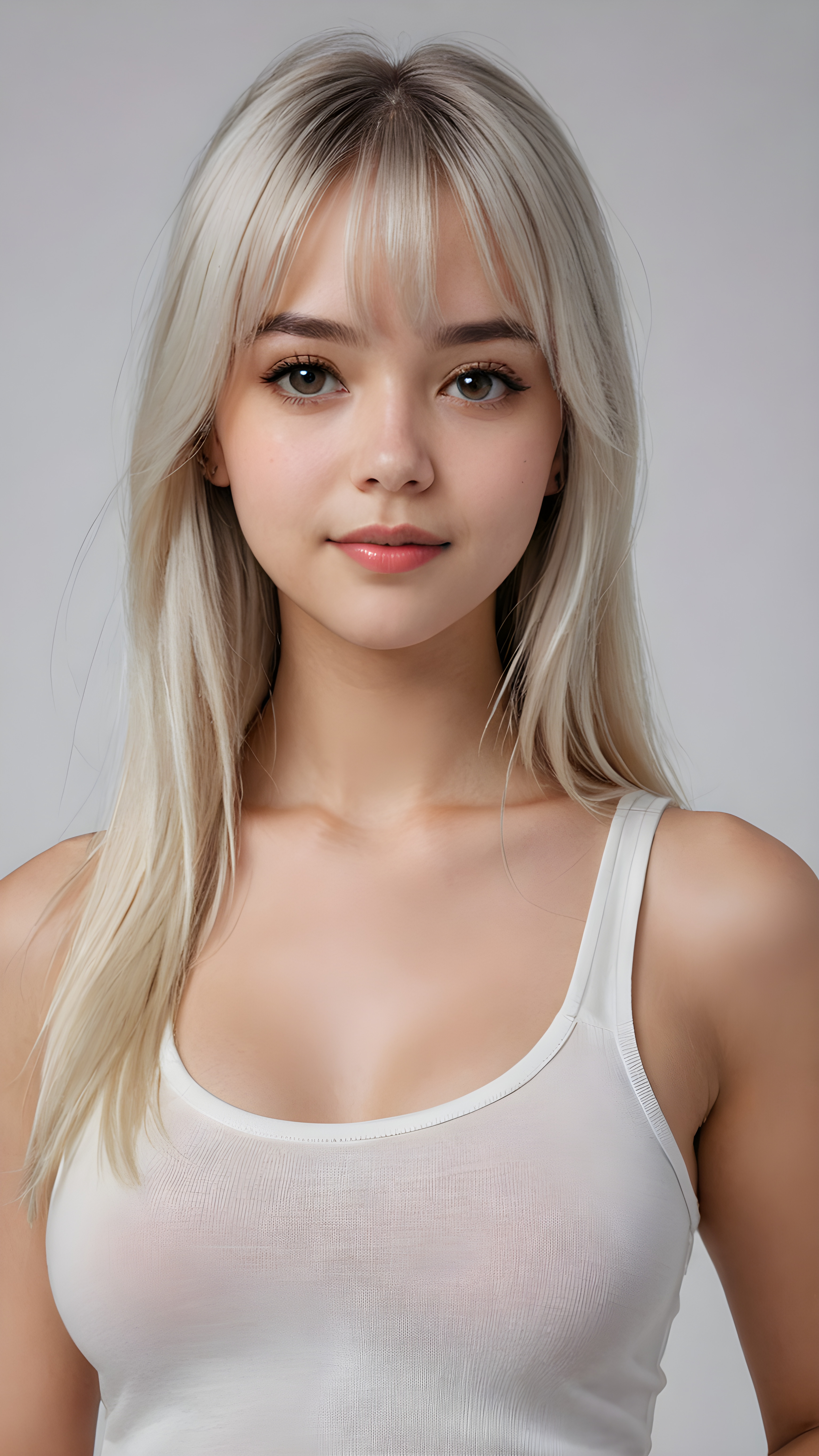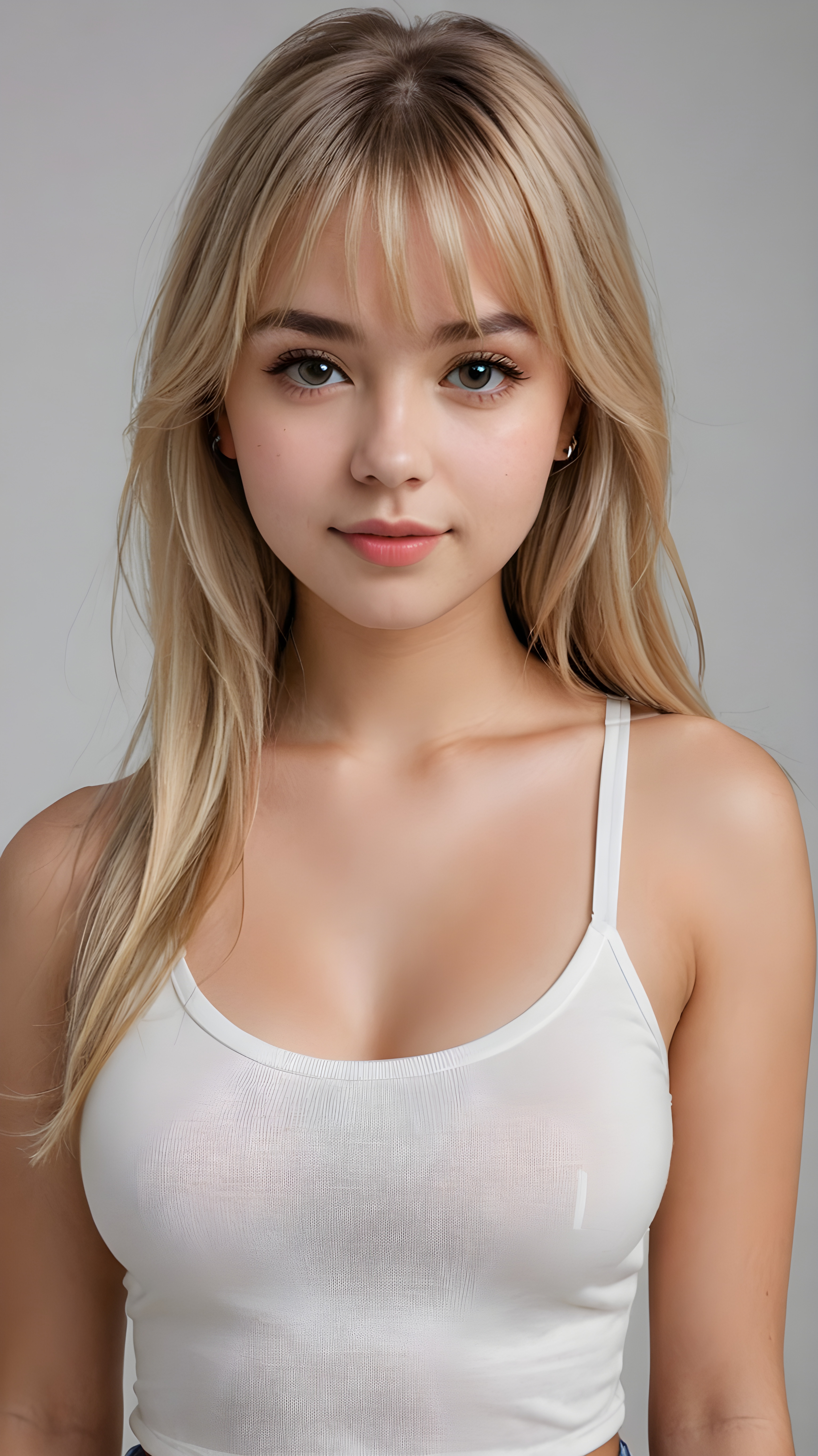 super realistic, 4k, detailed face, perfect curved body, cute well busty teen girl, long blonde straight hair, bangs cut, wear only a white short tight tank top, looks at the camera, portrait shot