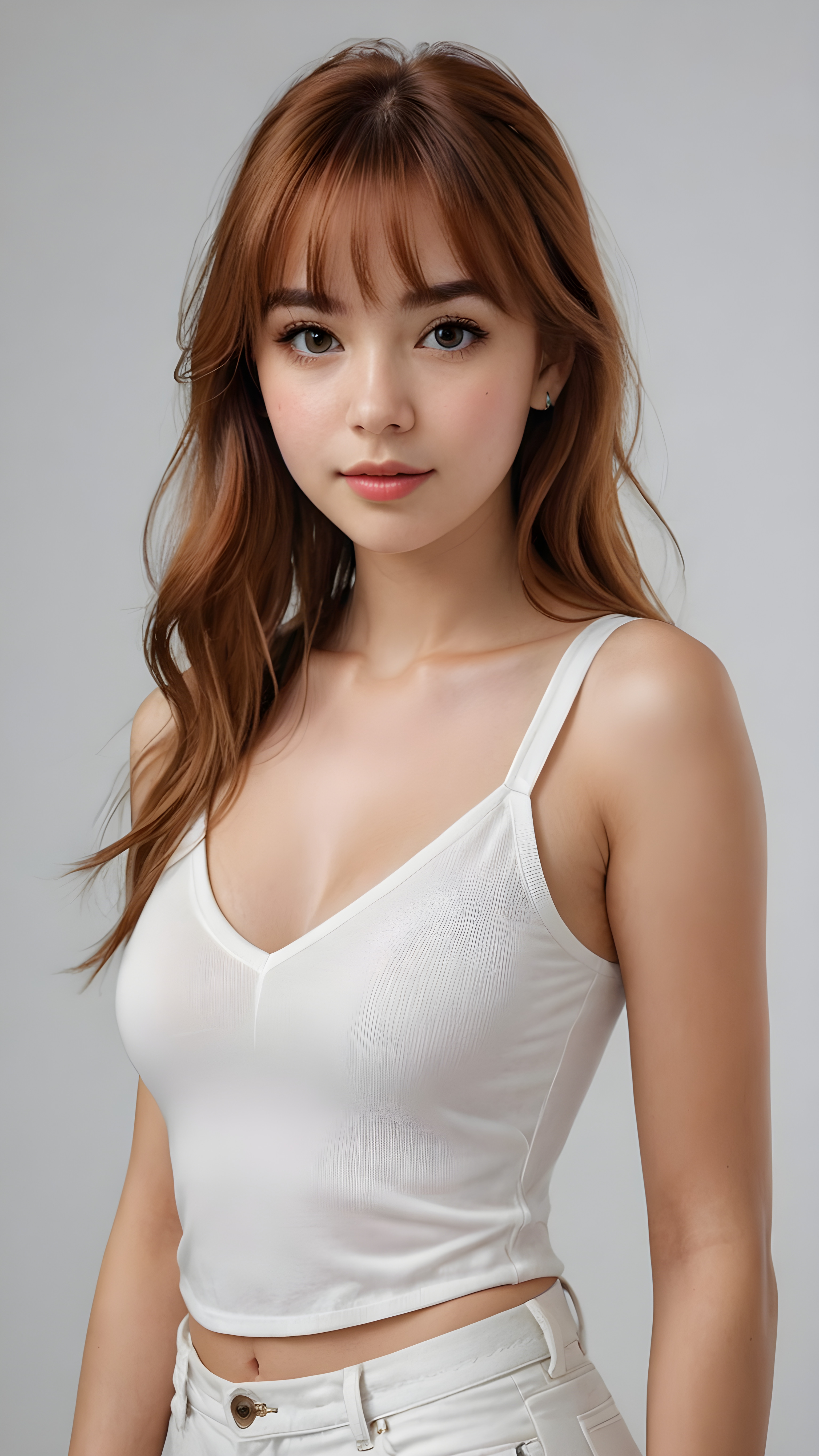 super realistic, 4k, detailed face, perfect curved body, cute petite teen girl, long auburn straight hair, bangs cut, wear only a white short tight cropped tank top with deep v-neck, looks at the camera, portrait shot