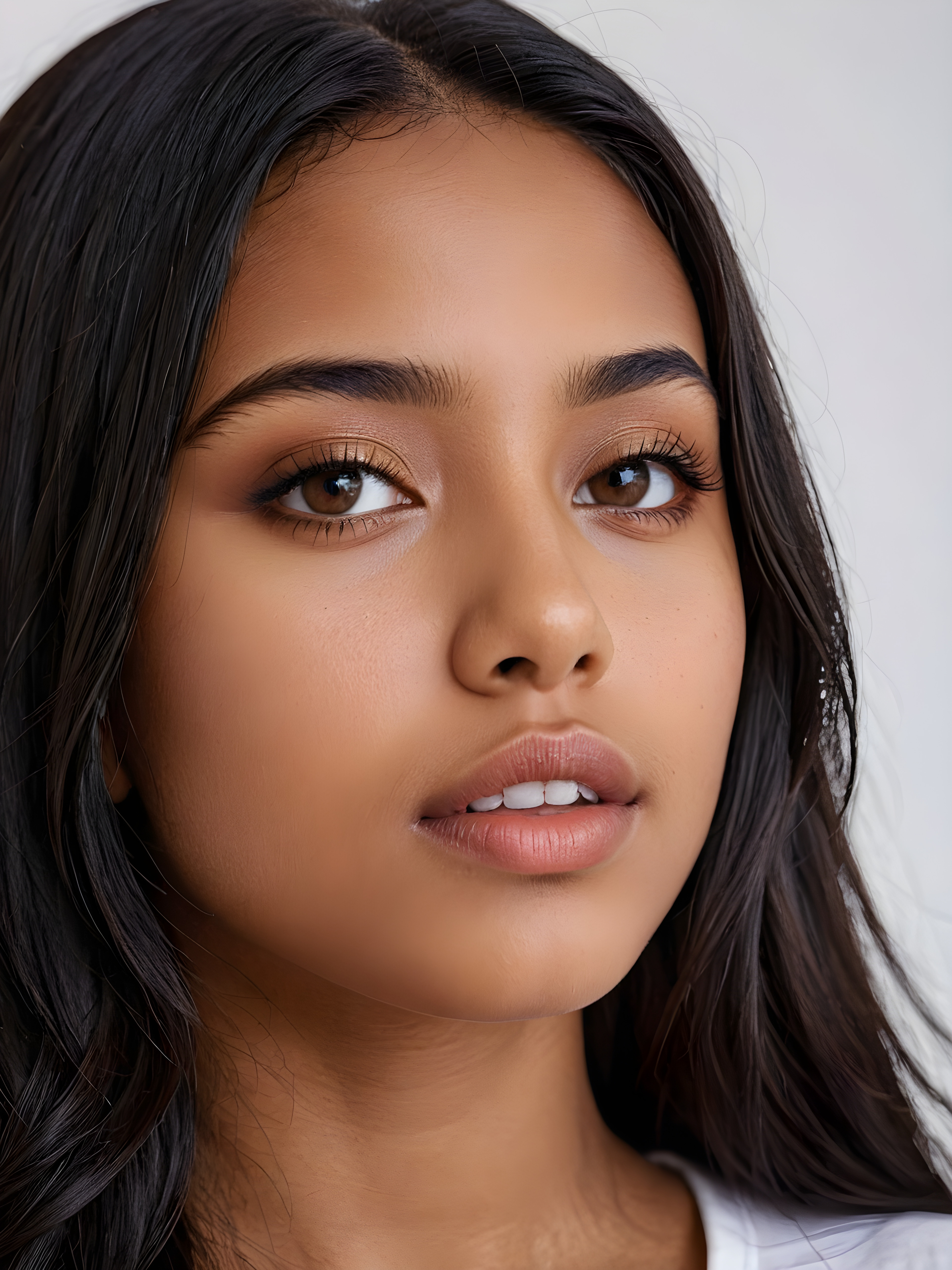 a realistic, detailed, dynamic photography from a beautiful young teen ((brown-skinned girl)), with ((detailed long soft black hair)), full kissable lips, looking into the camera, perfect detailed face, side view, ((close up portrait)), ((stunning)), ((gorgeous)), ((white background))