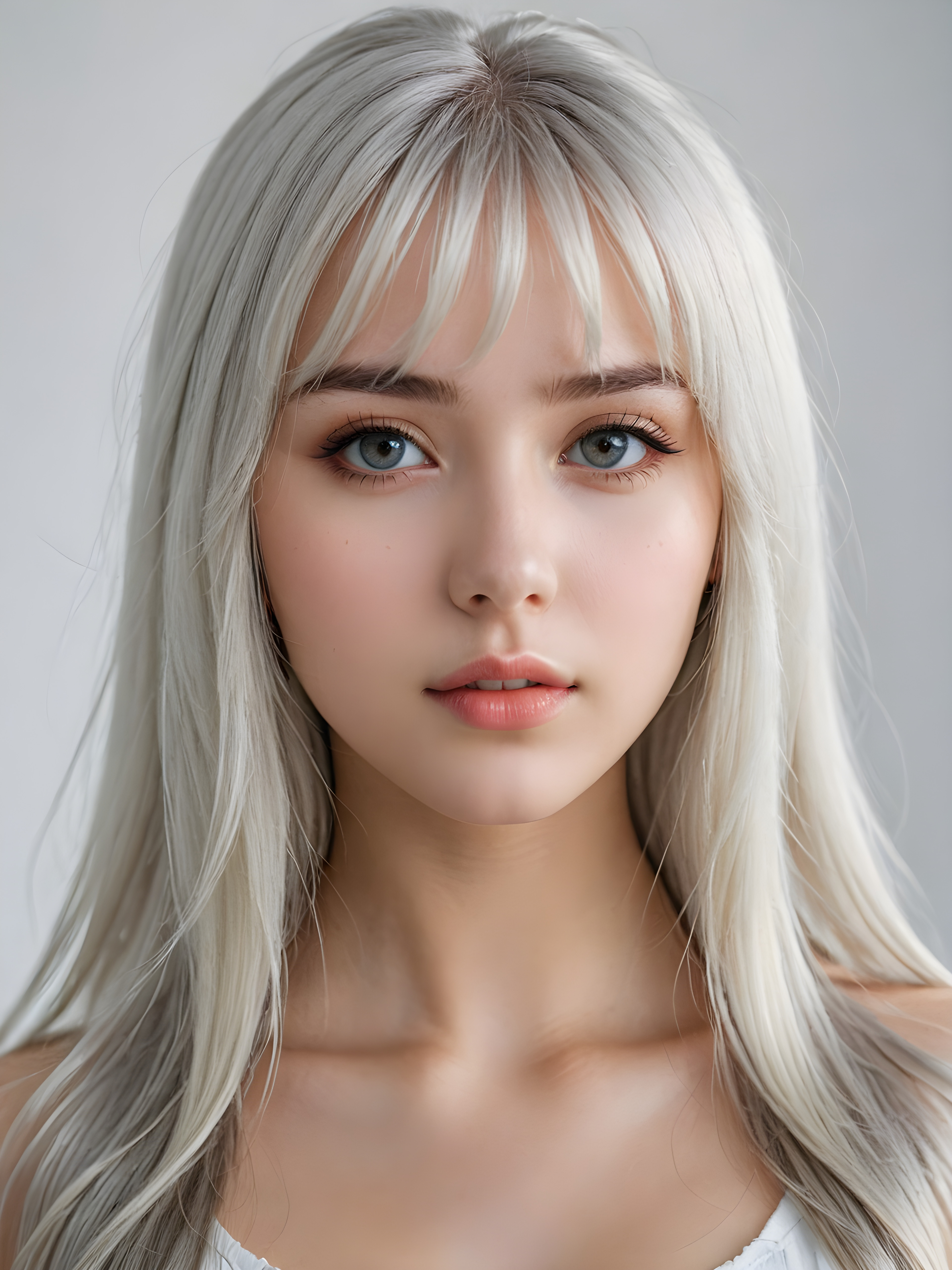 a realistic, detailed, dynamic photography from a beautiful young teen ((silver-skinned girl with flawless, soft skin)), with ((detailed long soft white hair, bangs)), full kissable lips, round eyes, round face, looking into the camera, perfect detailed face, ((close up portrait)), ((stunning)), ((gorgeous)), ((white background))