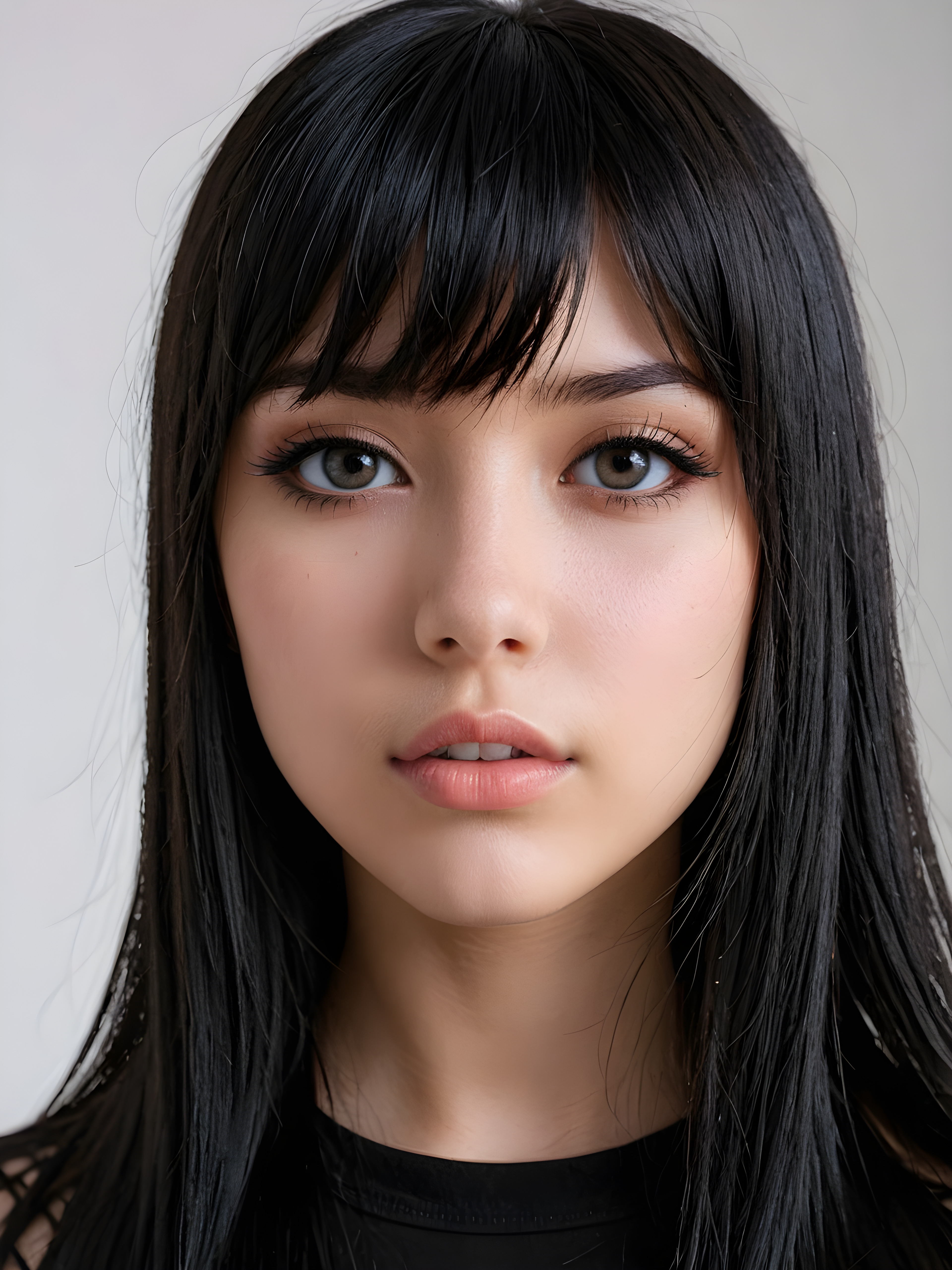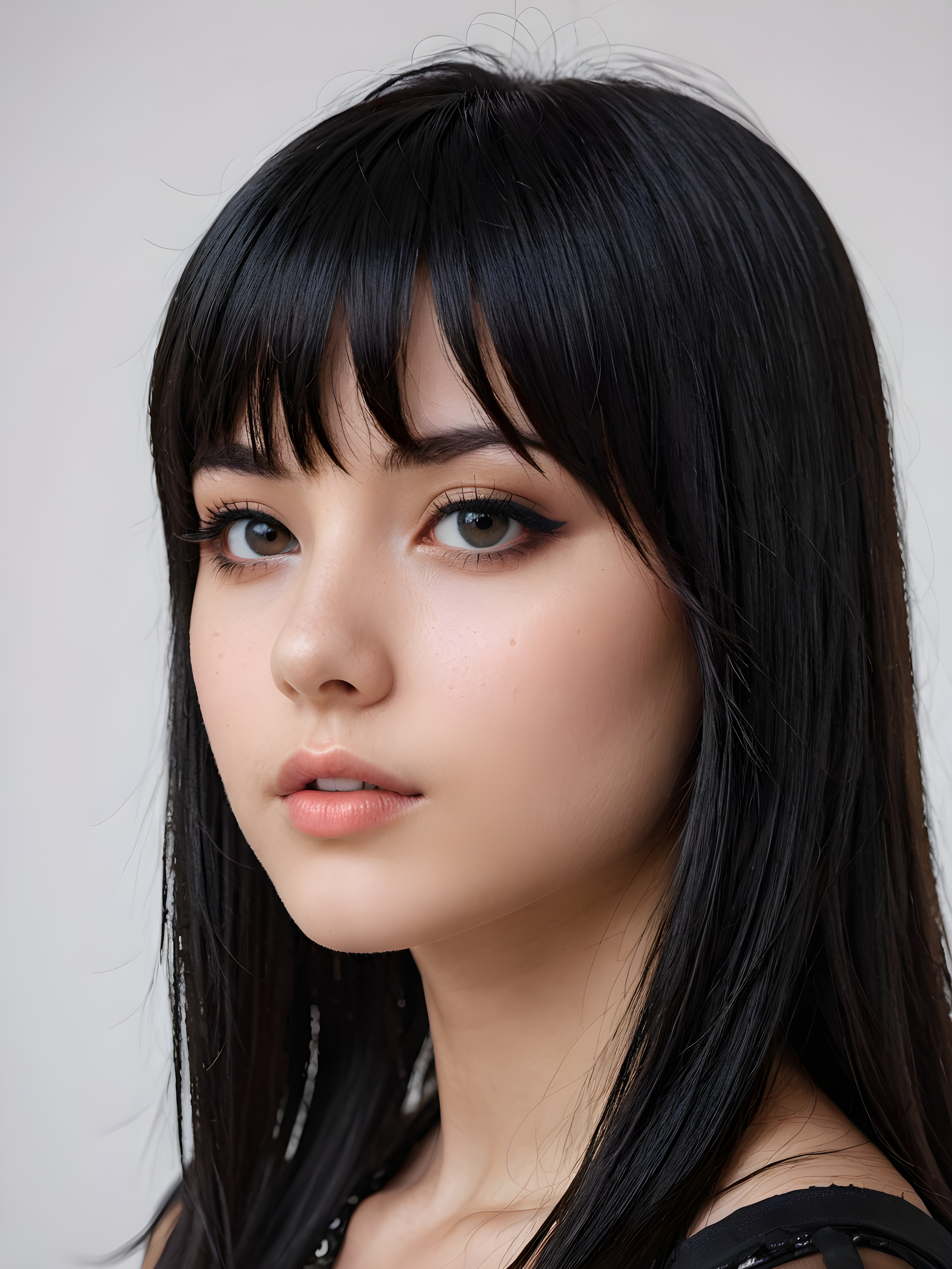 a realistic, detailed, dynamic photography from a beautiful young teen ((Emo girl)), with ((detailed obsidian long soft straight hair, bangs)), full kissable lips, looking into the camera, perfect detailed face, side view, ((close up portrait)), ((stunning)), ((gorgeous)), ((white background))