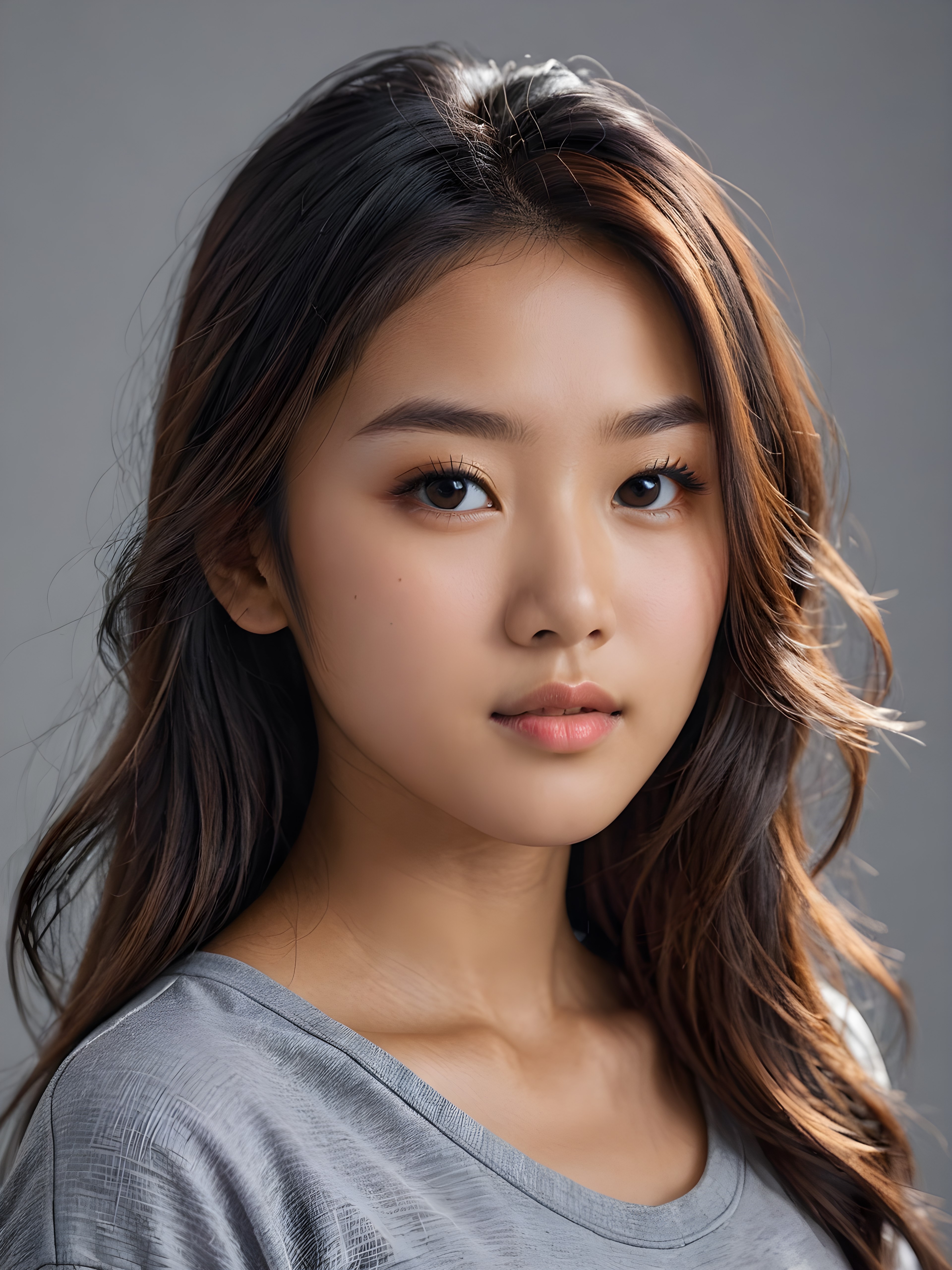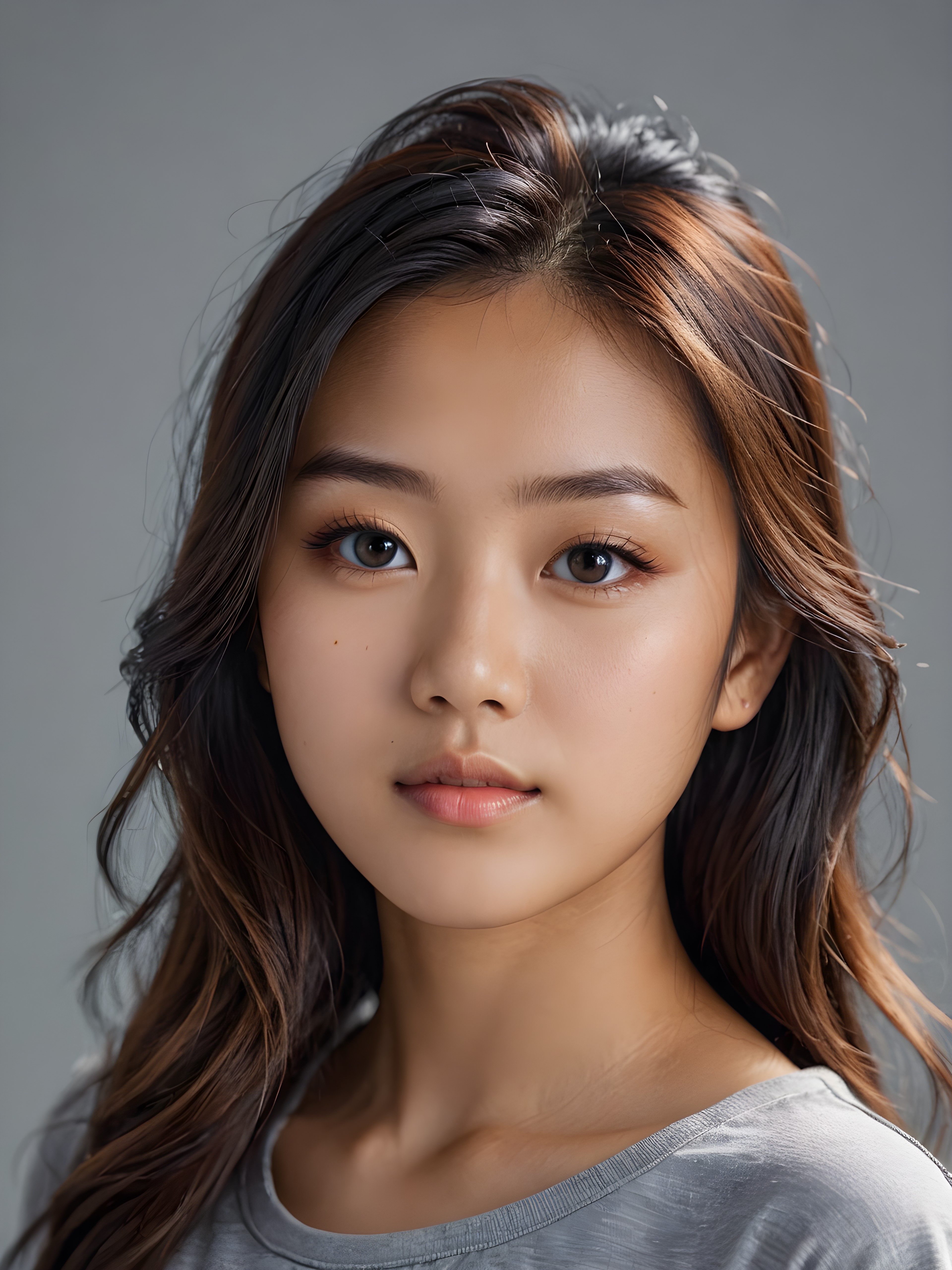 a realistic, detailed, dynamic photography from a beautiful young teen ((Asian girl)), with detailed hair, looking into the camera, dynamic cinematic lights, perfect detailed face, side view, ((close up portrait)), ((stunning)), ((gorgeous)), ((grey background))