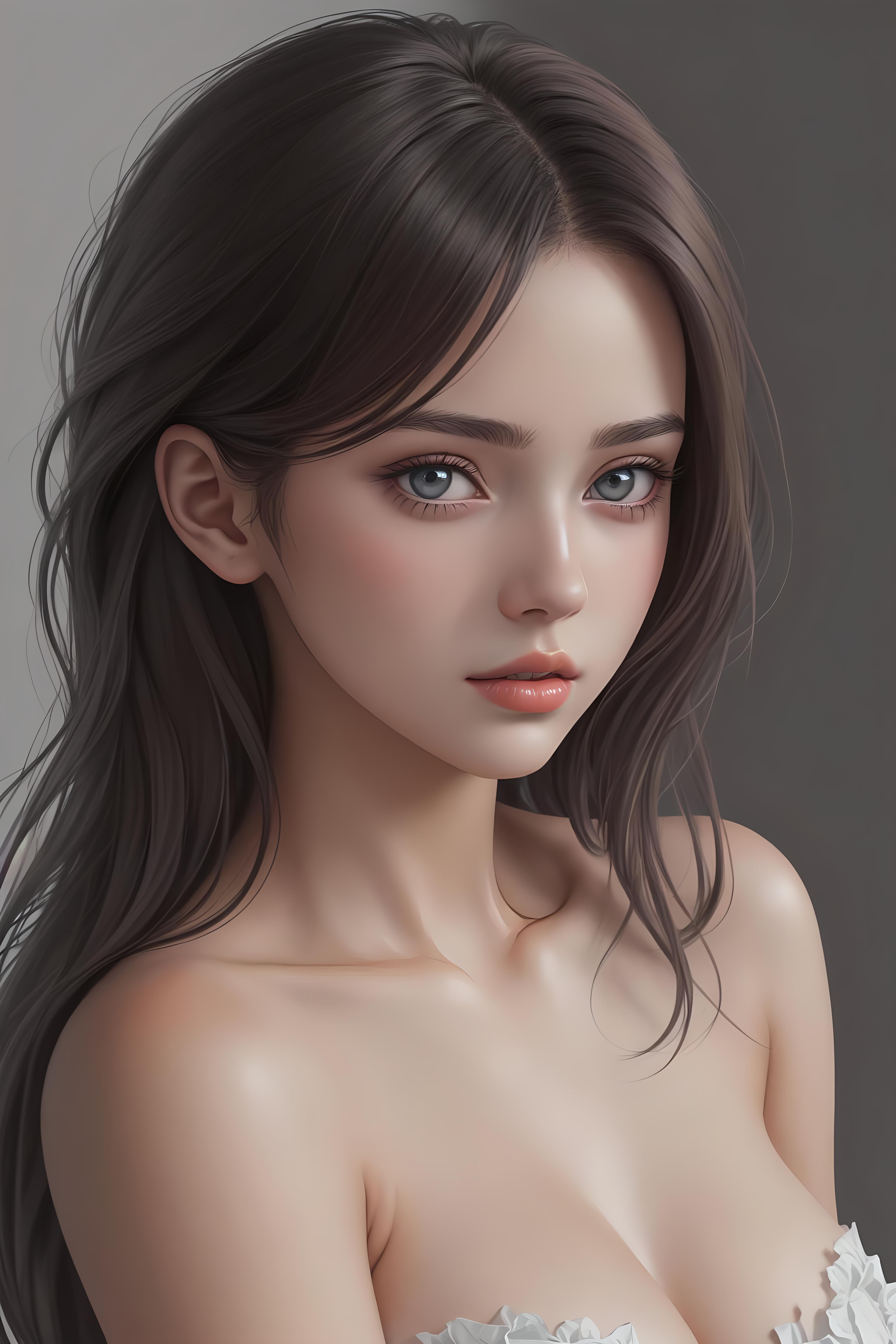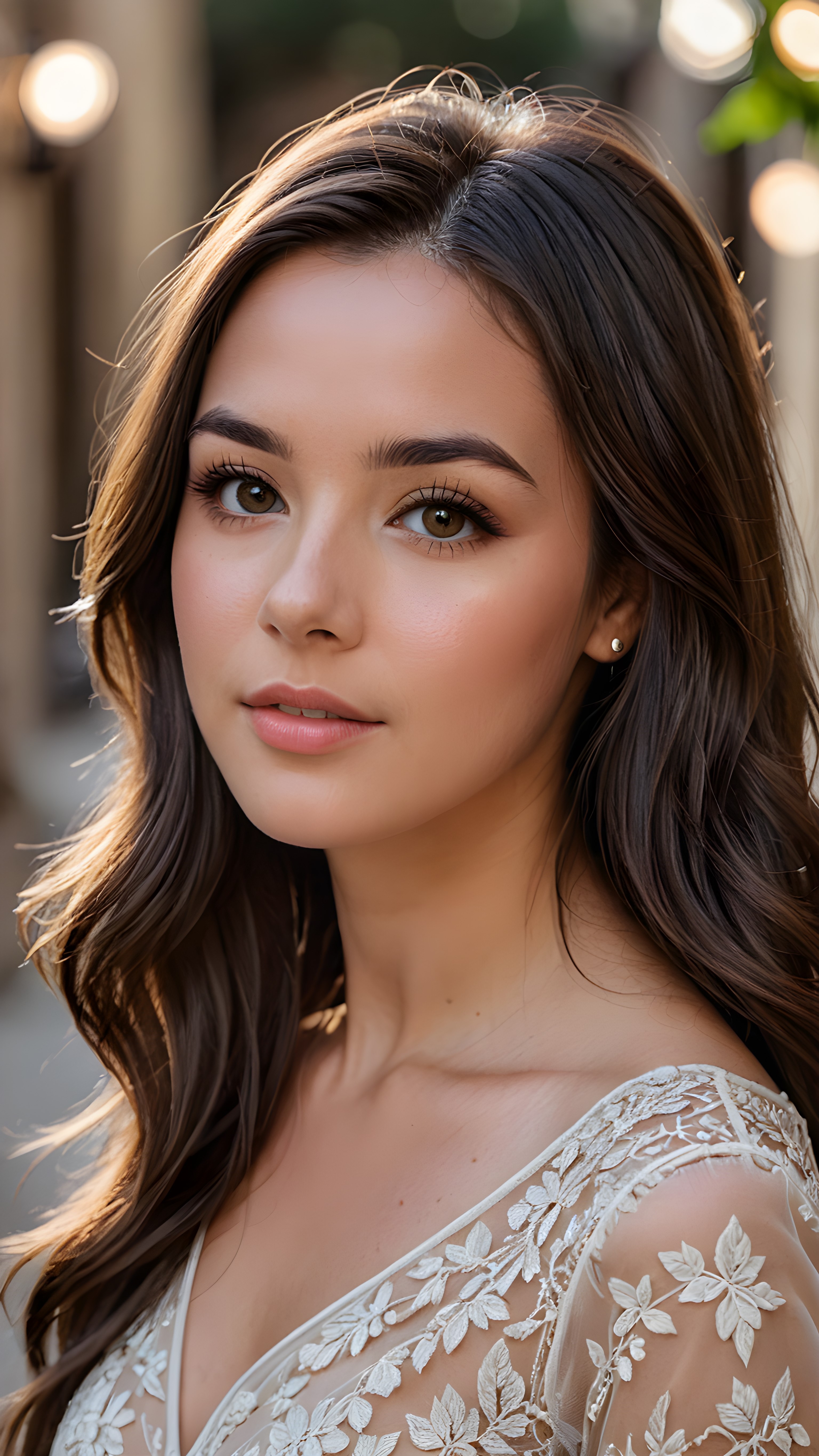 (portrait) (stunning) a detailed (((gorgeous girl))) with (((brunette straight hair))), cascading down her back in a sleek, flowing style