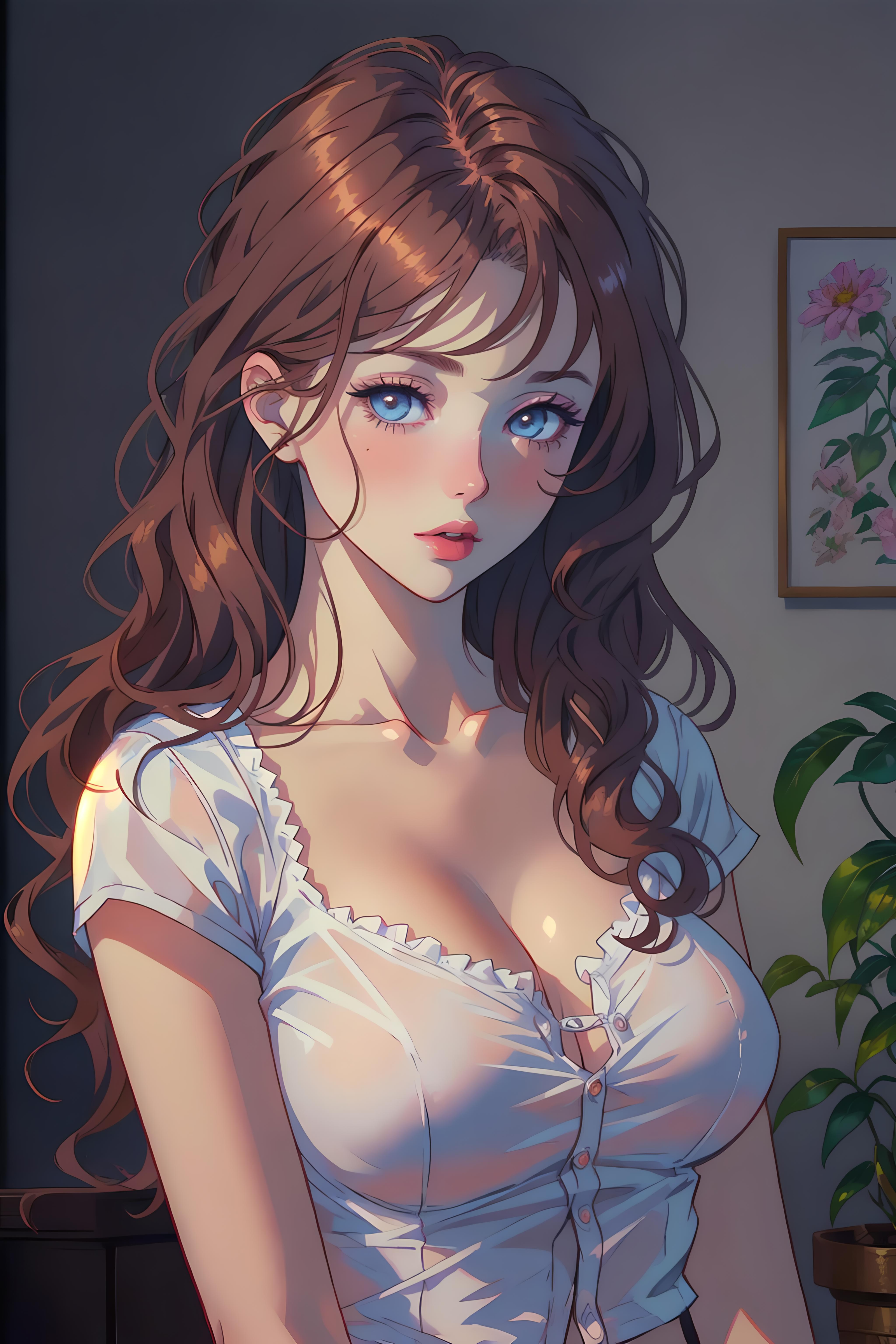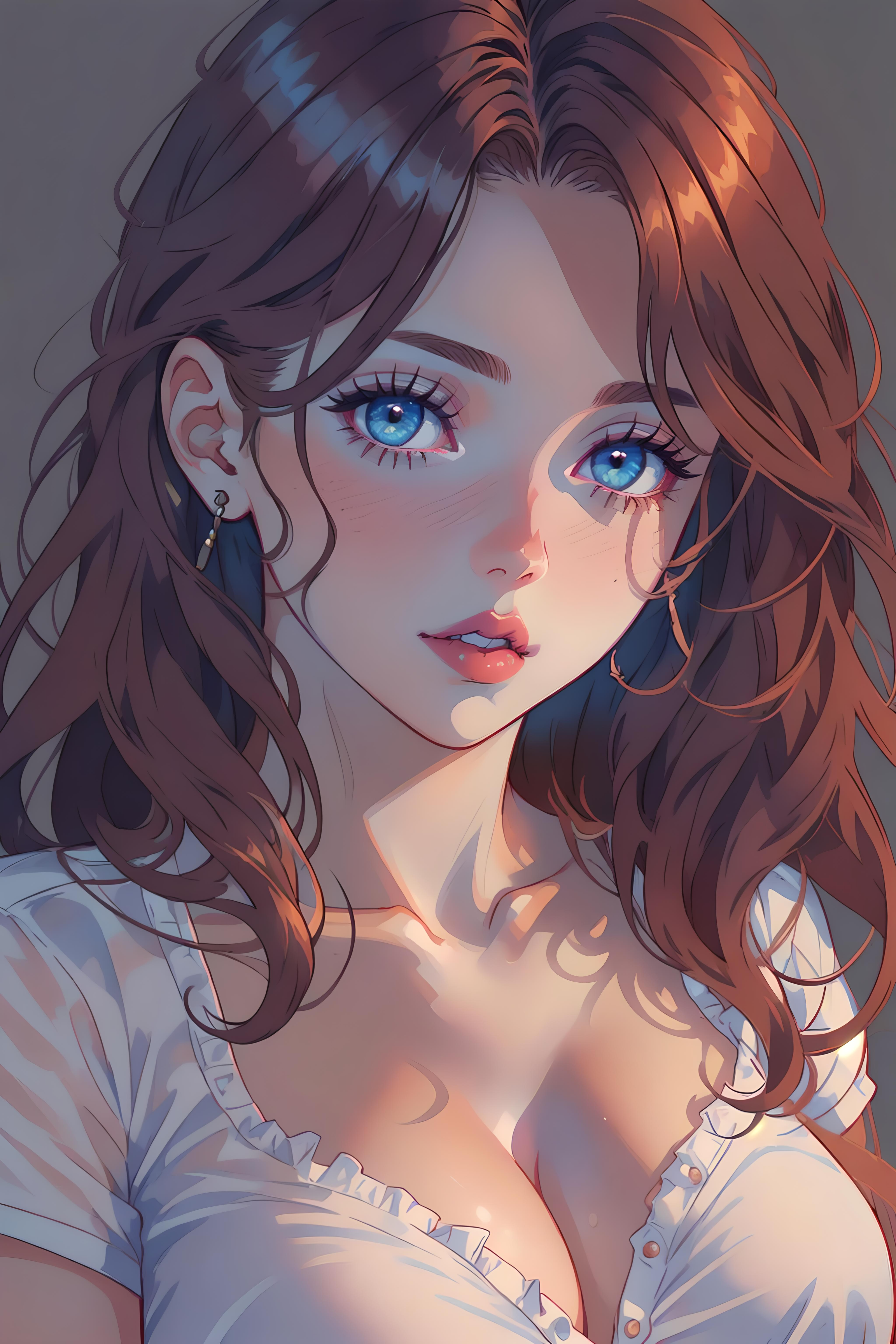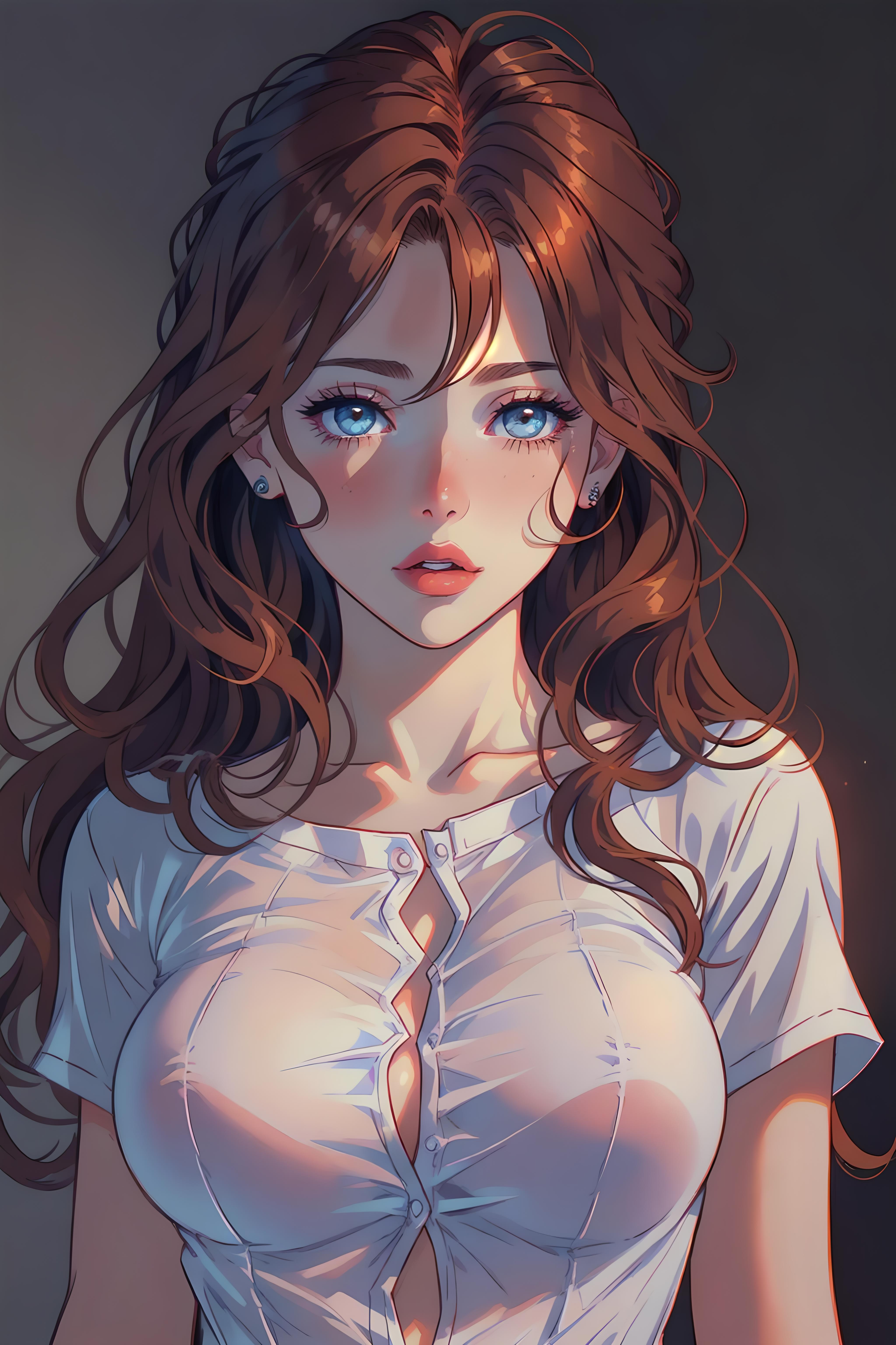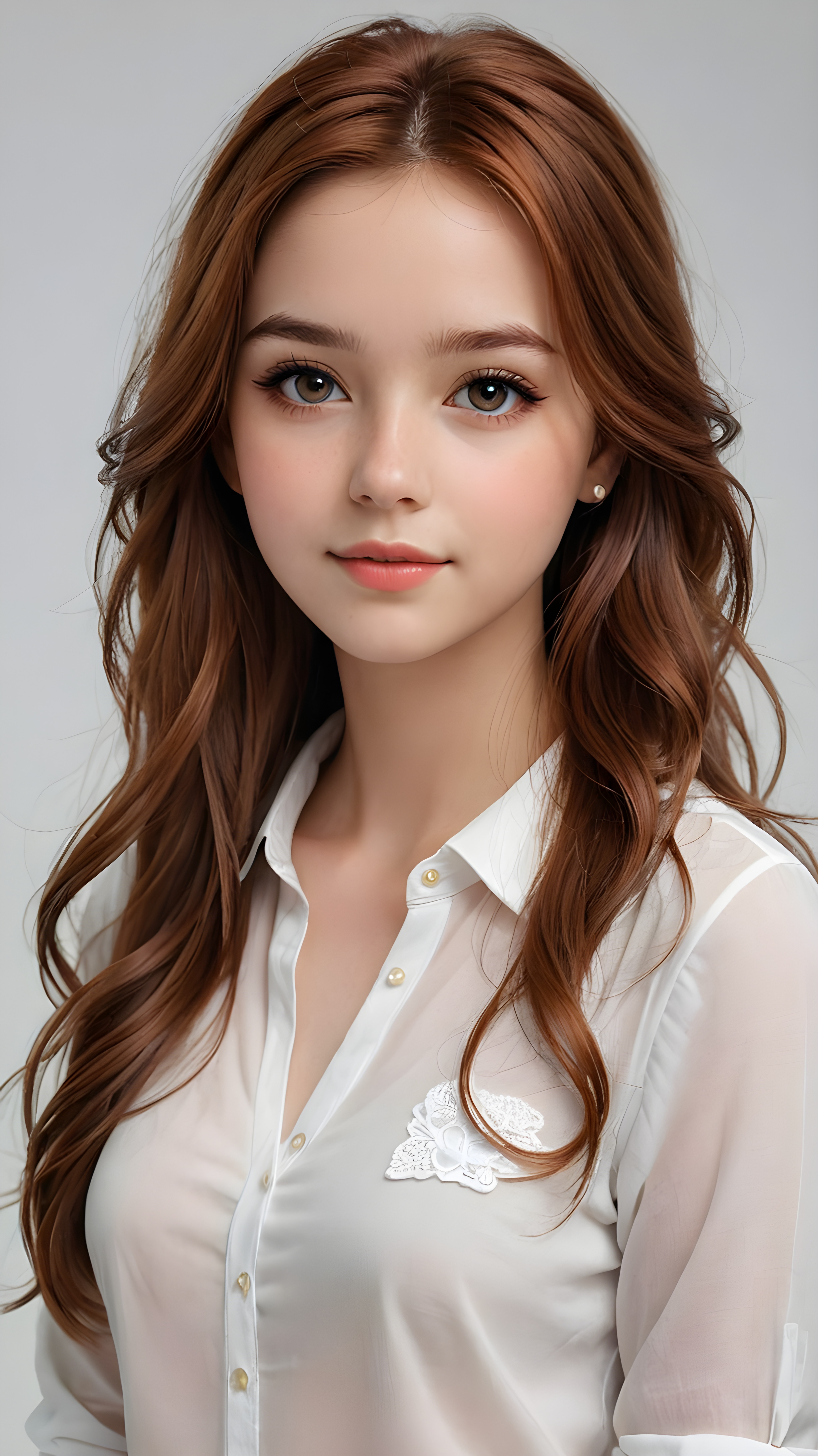 super realistic, detailed, ((gorgeous)) ((stunning)) cute young breasted girl, full portrait, long auburn hair, 18 years old, white shirt