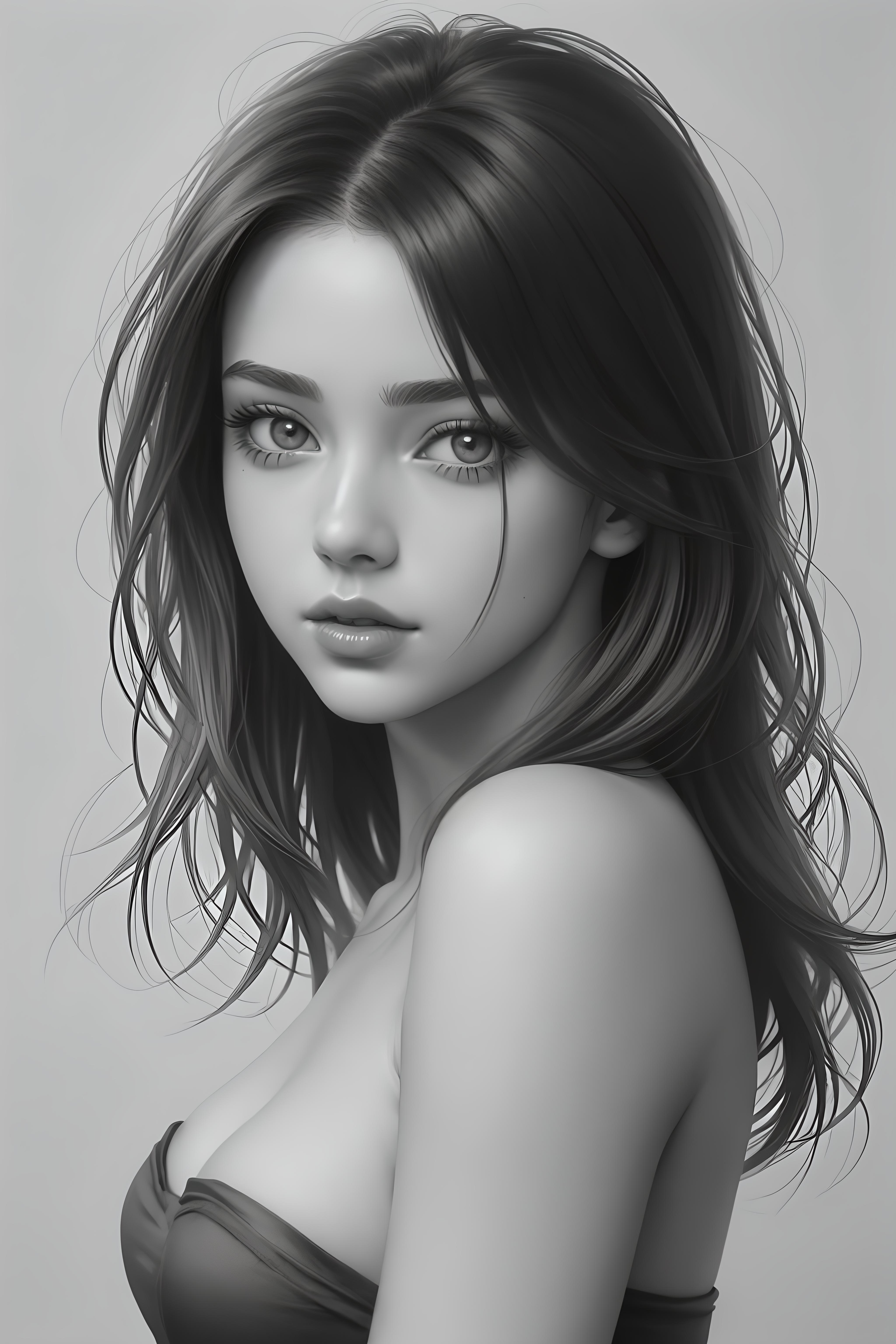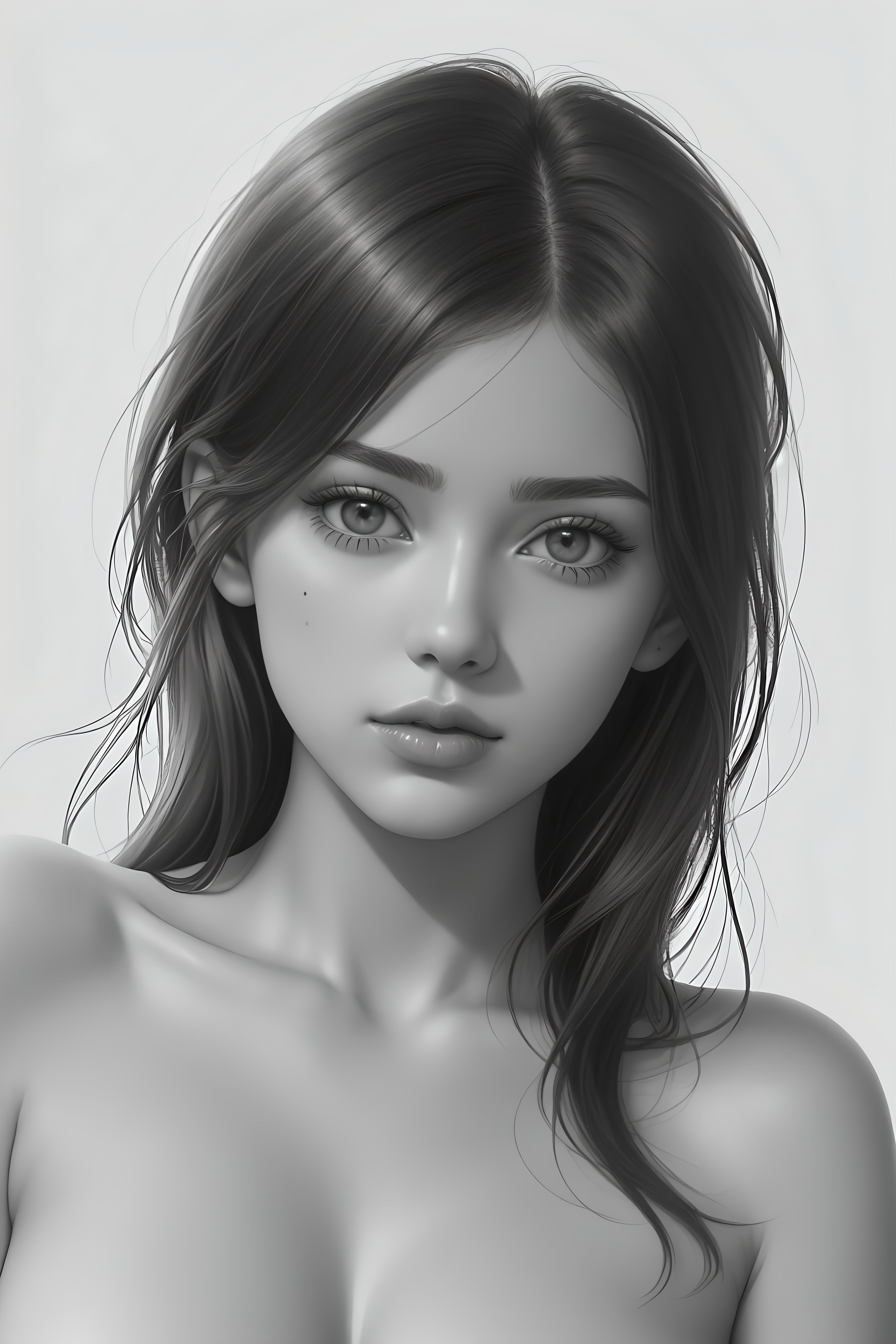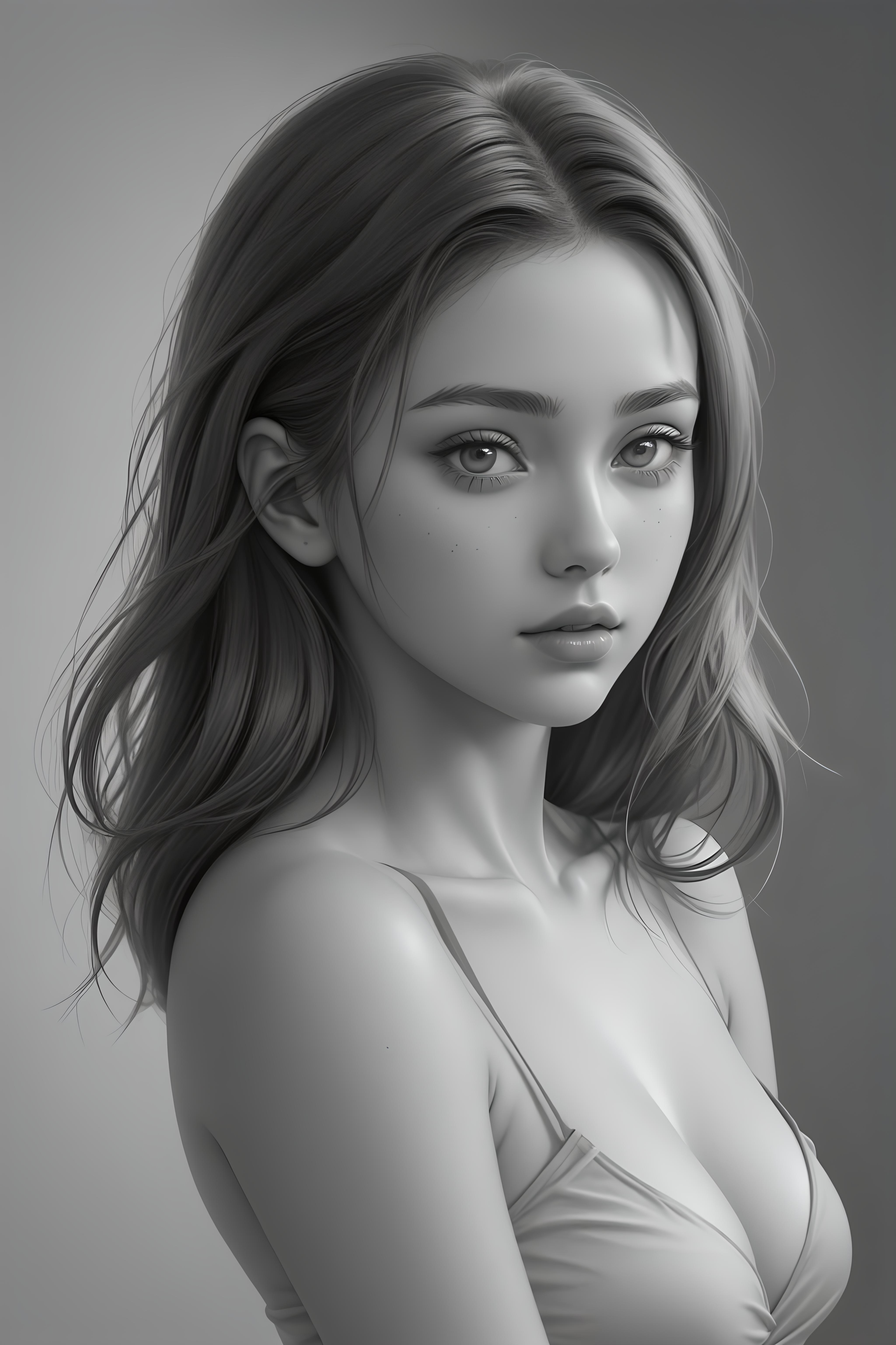 super realistic, detailed, ((gorgeous)) ((stunning)) cute young breasted girl, full portrait, 18 years old, charcoal drawing