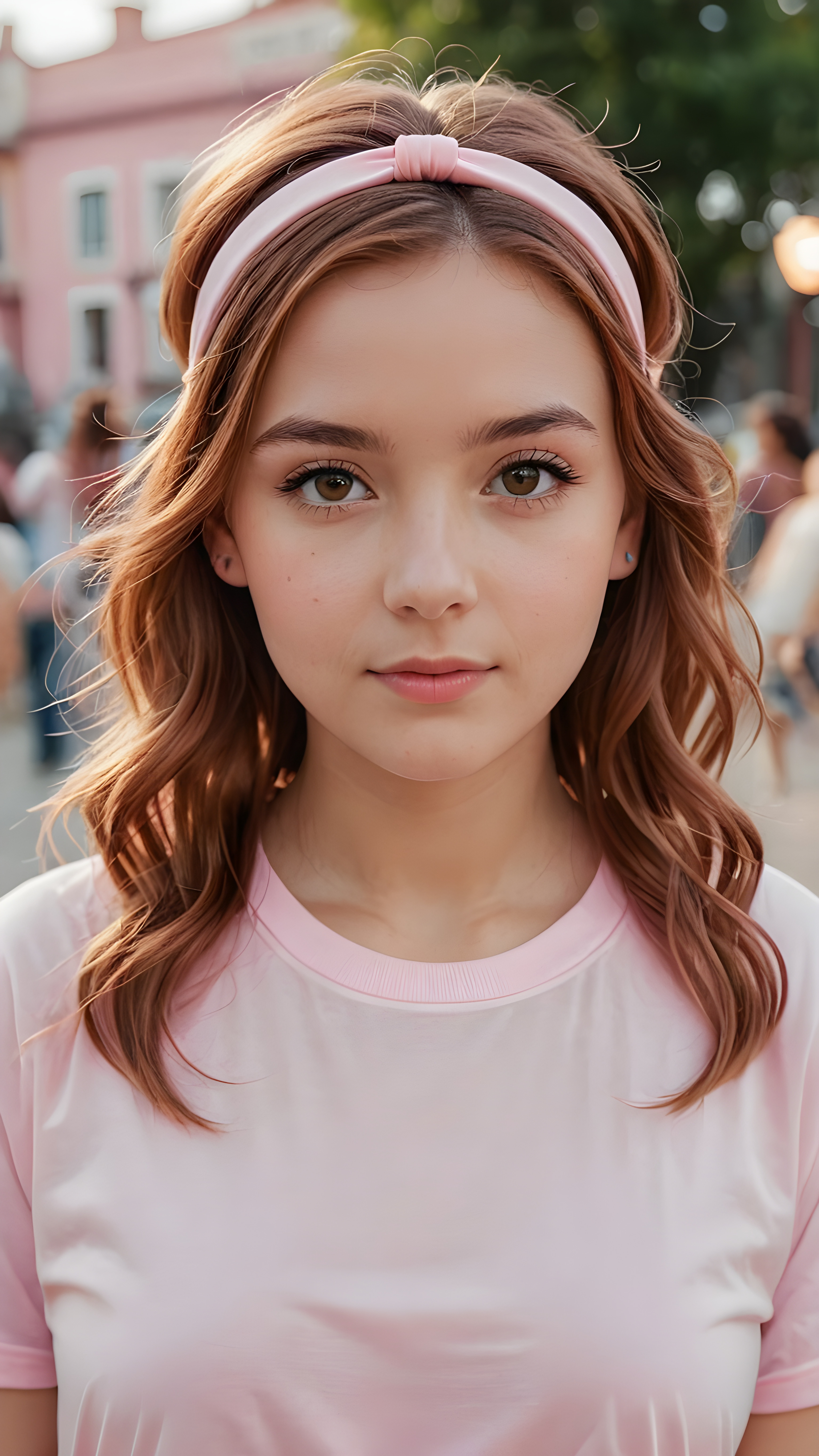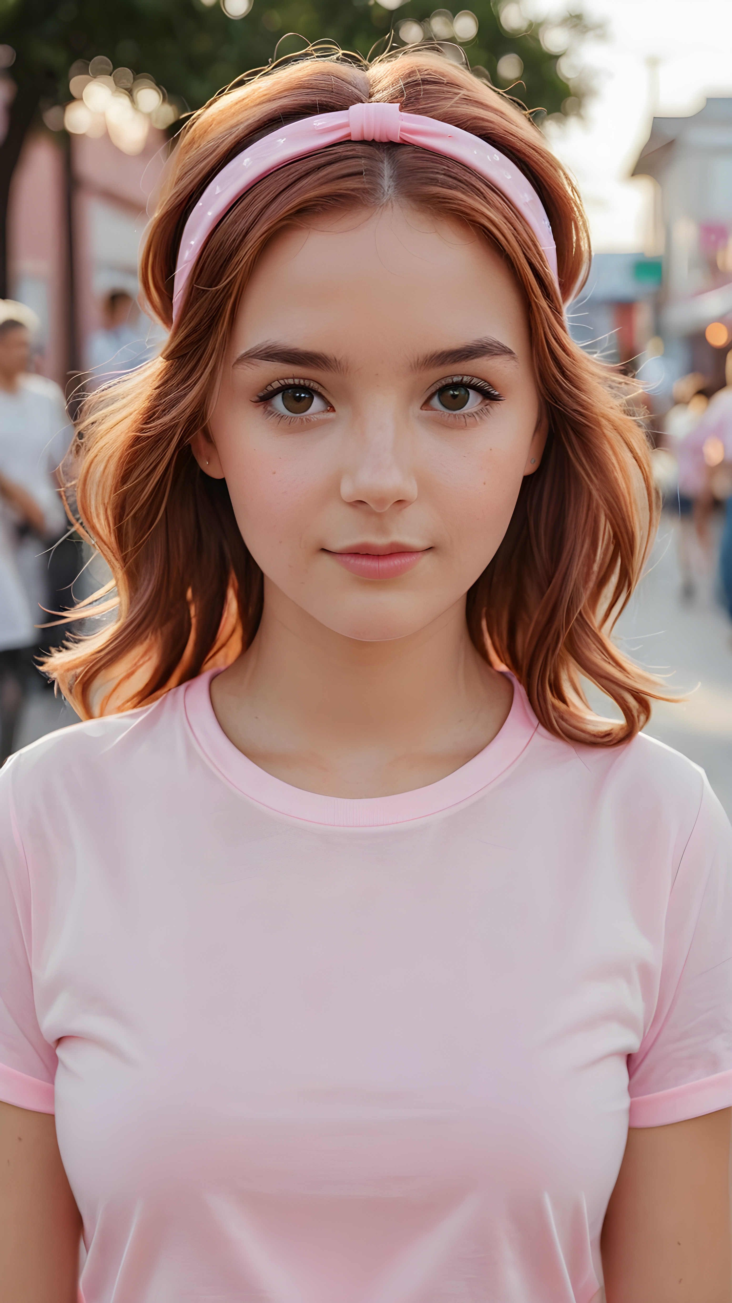 super realistic, 4k, detailed, a cute petite girl with long auburn hair in a ((plastic headband)), ((light pink t-shirt))