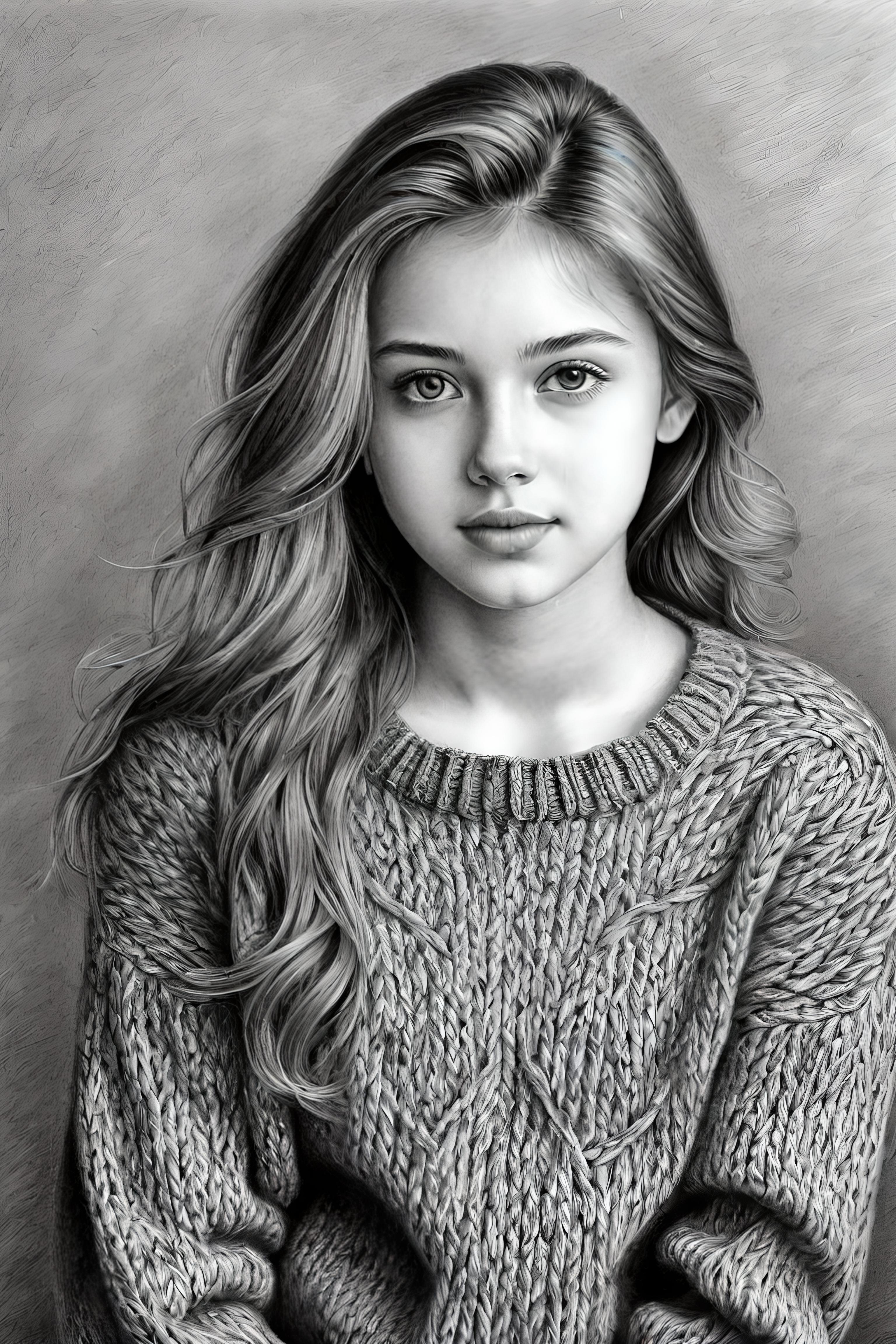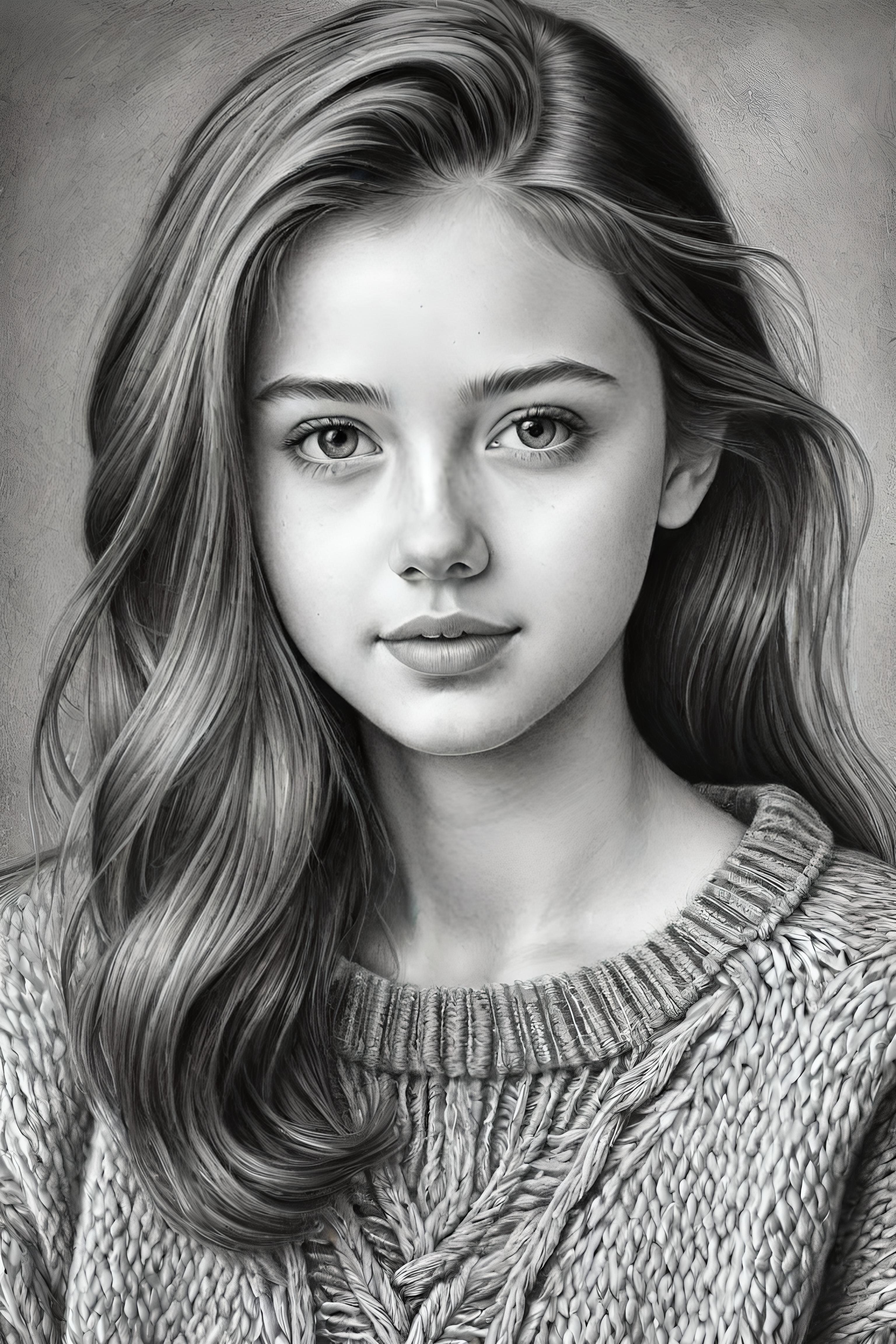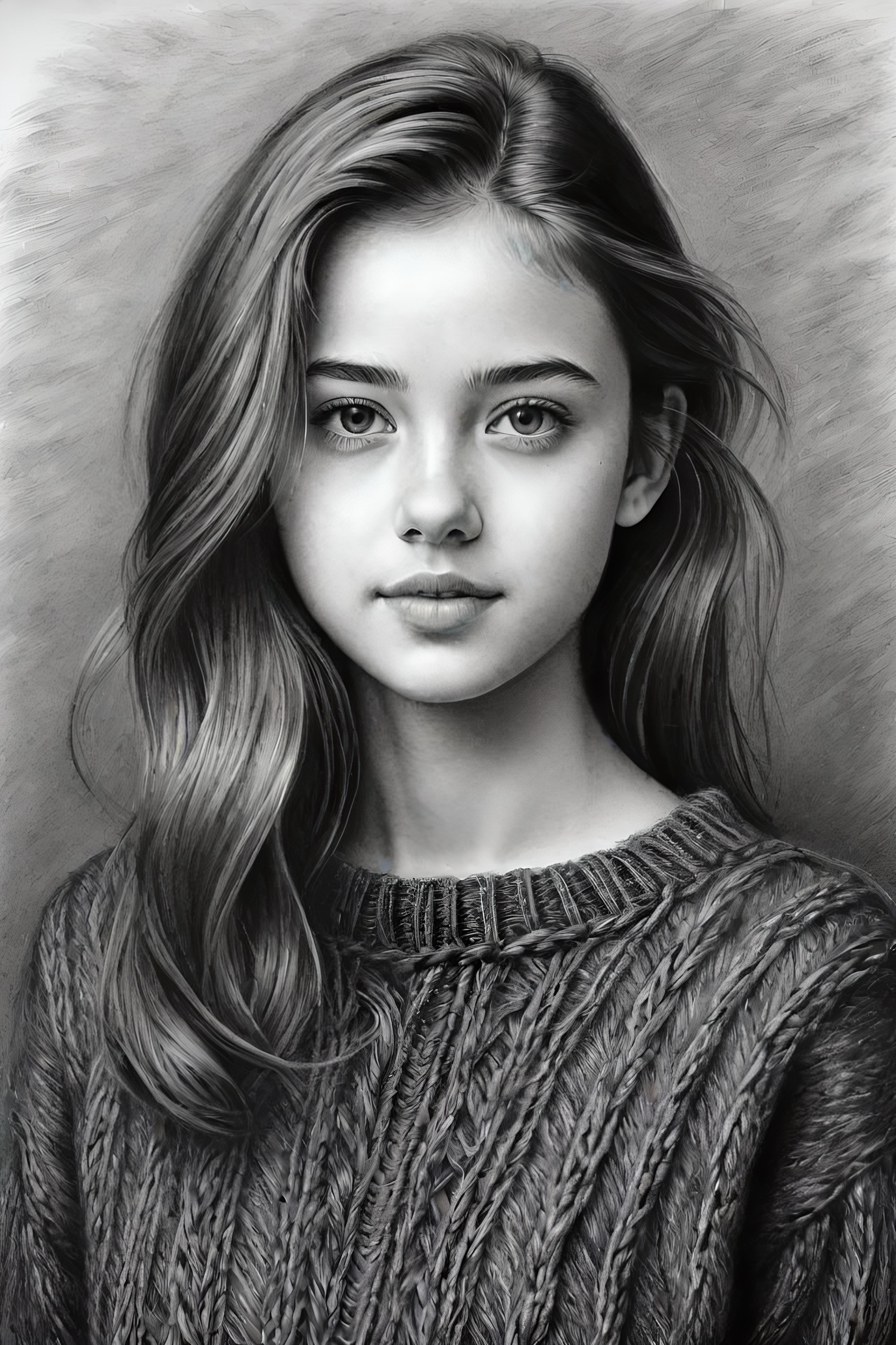 super realistic, detailed, ((gorgeous)) ((stunning)) cute young breasted girl, full portrait, 18 years old, pencil drawing, thin wool sweater