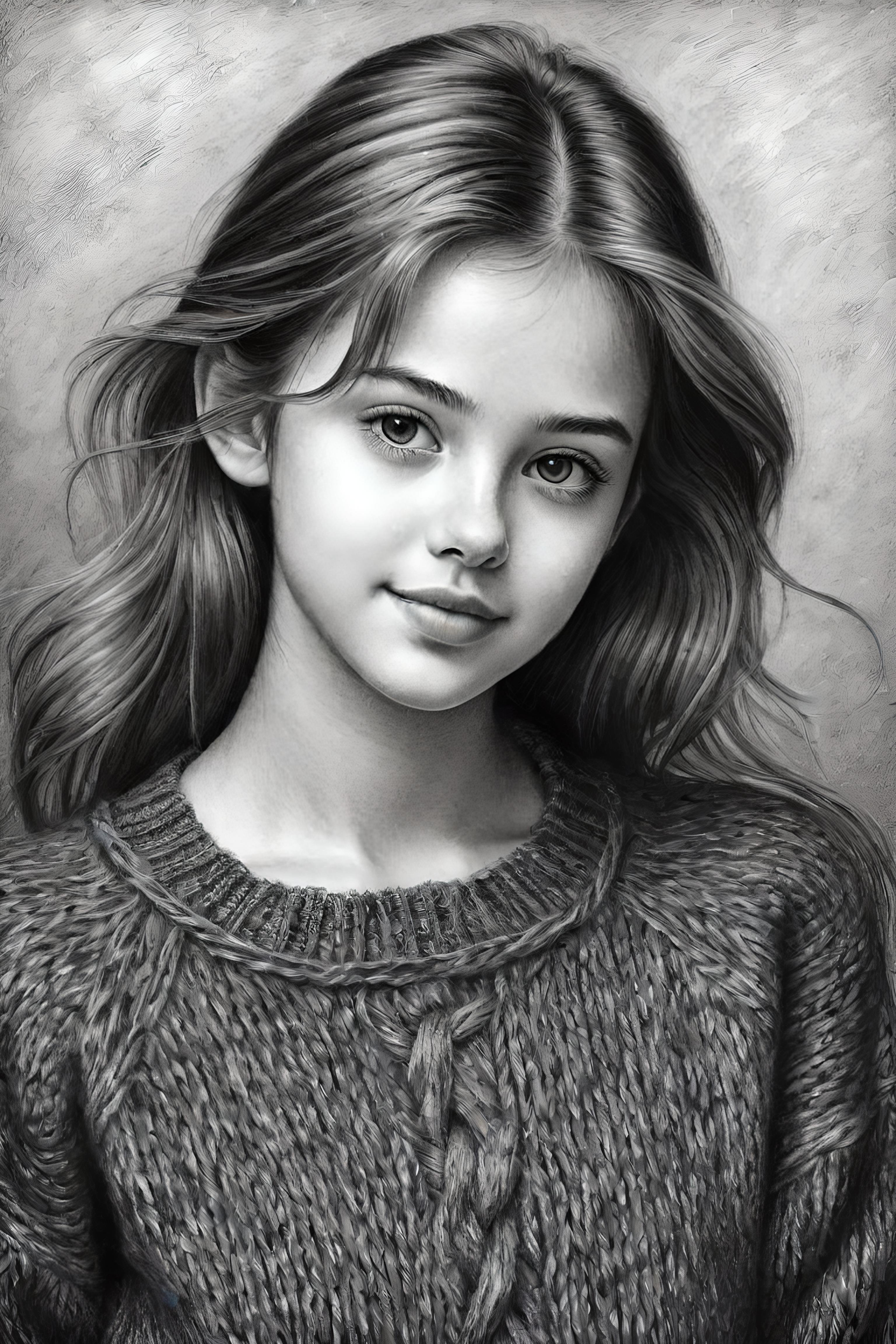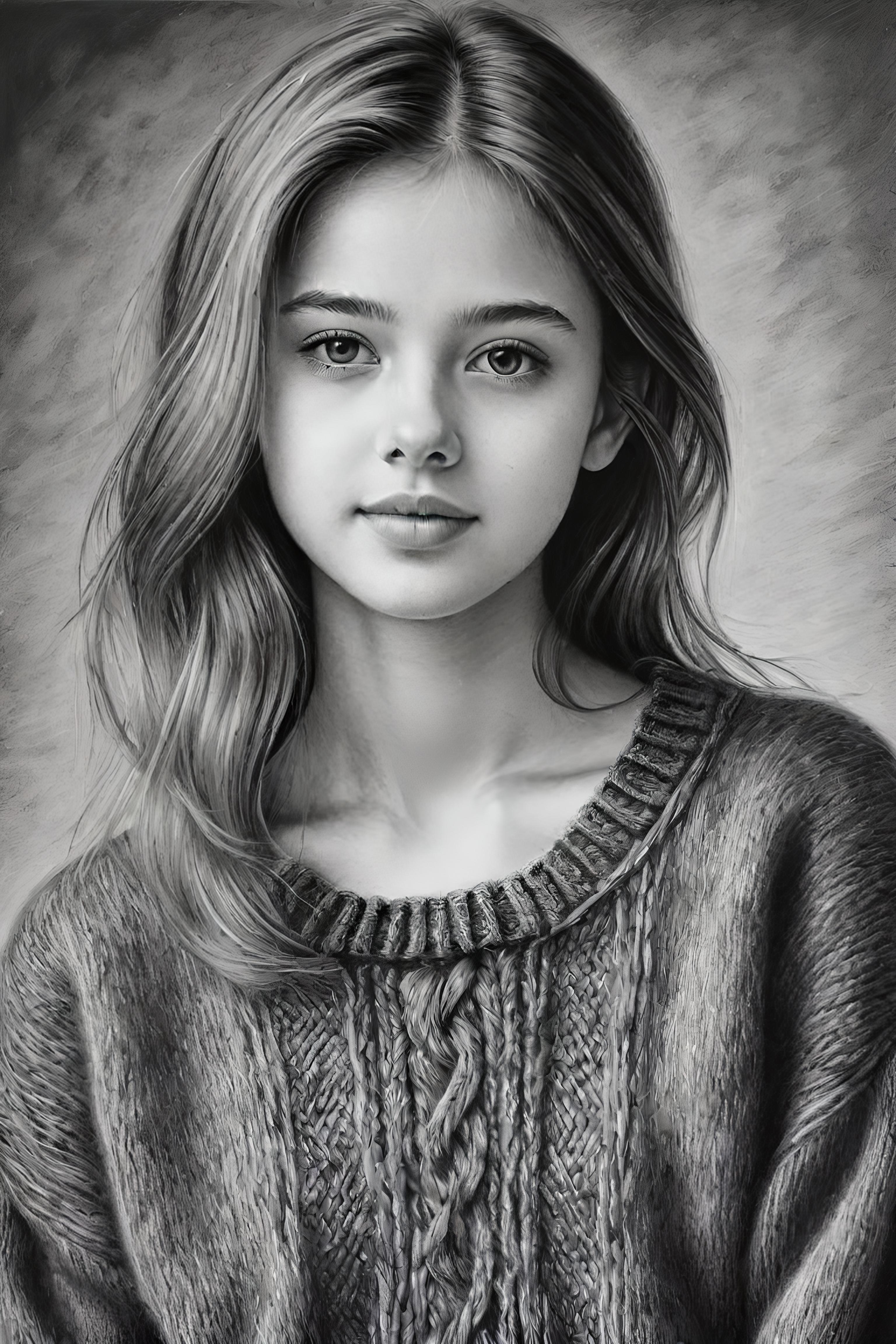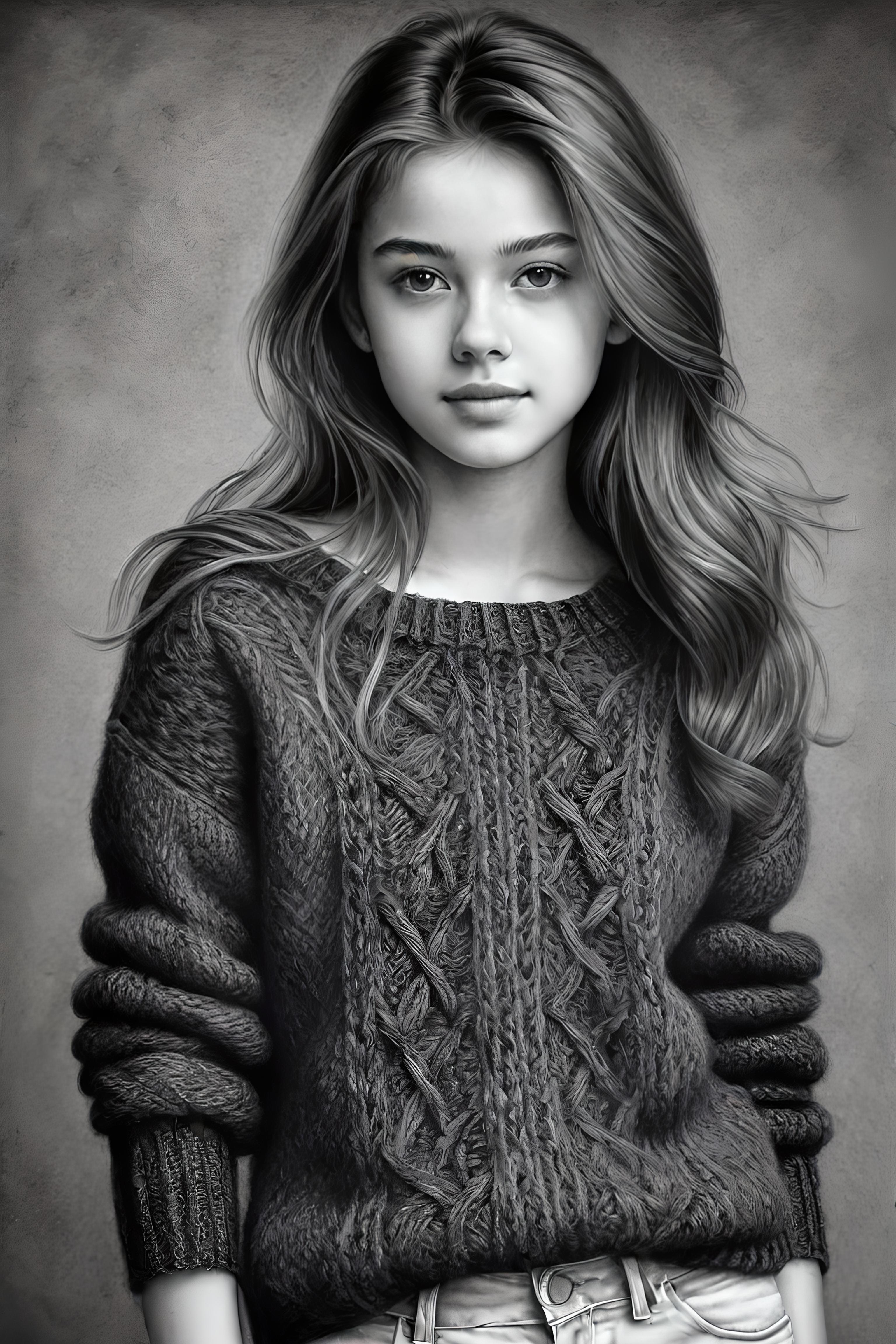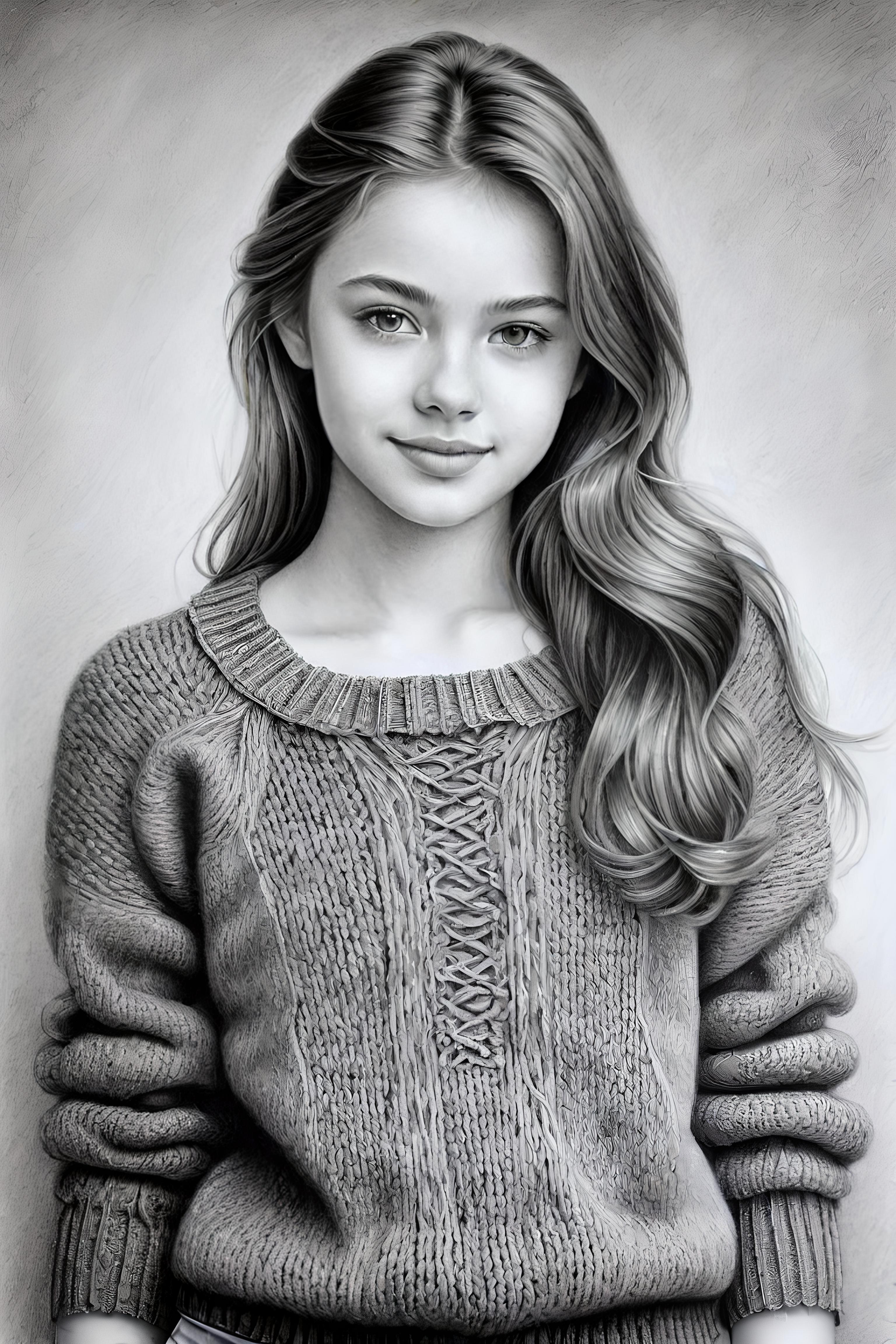 super realistic, detailed, ((gorgeous)) ((stunning)) cute young breasted girl, full portrait, 18 years old, pencil drawing, thin wool sweater