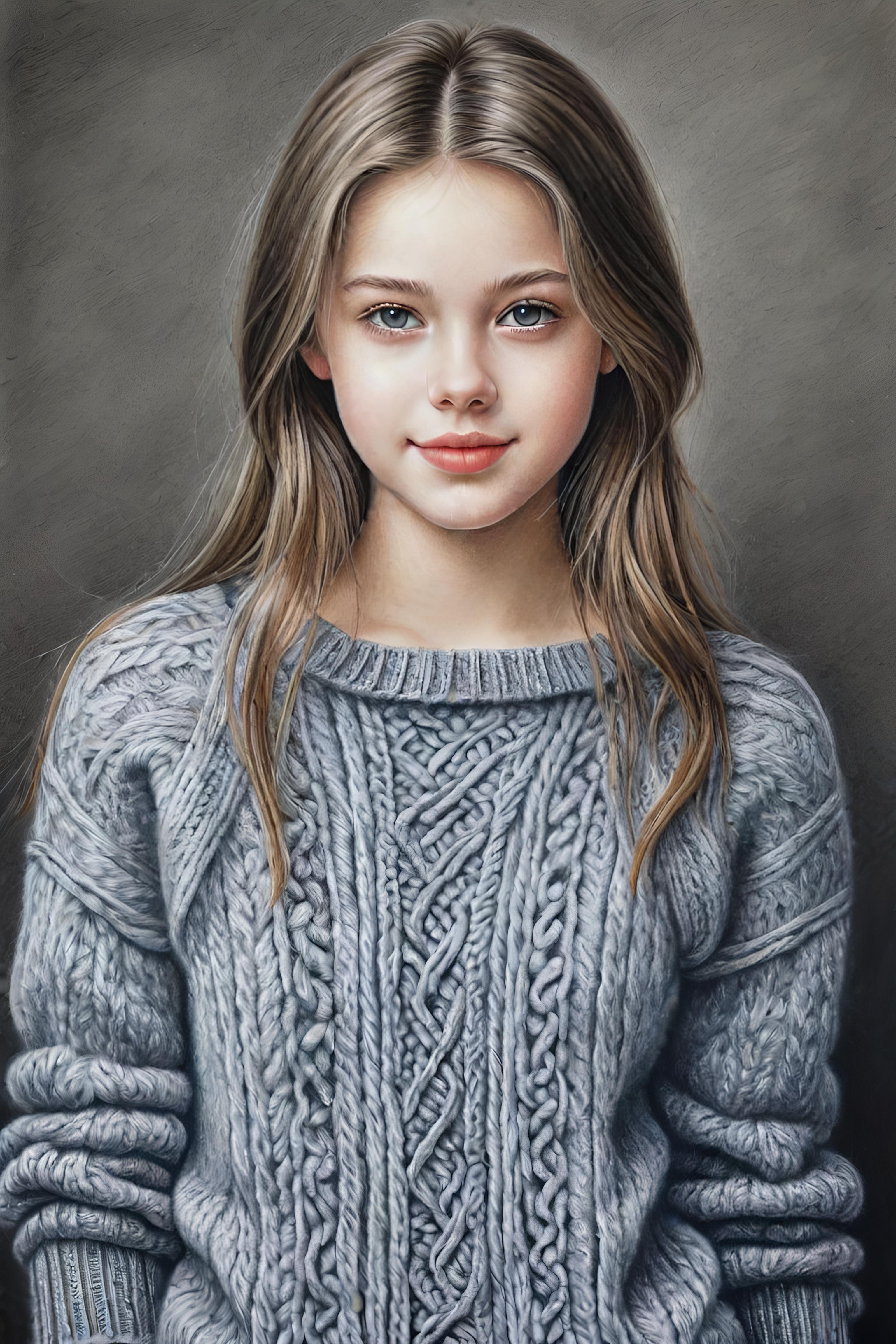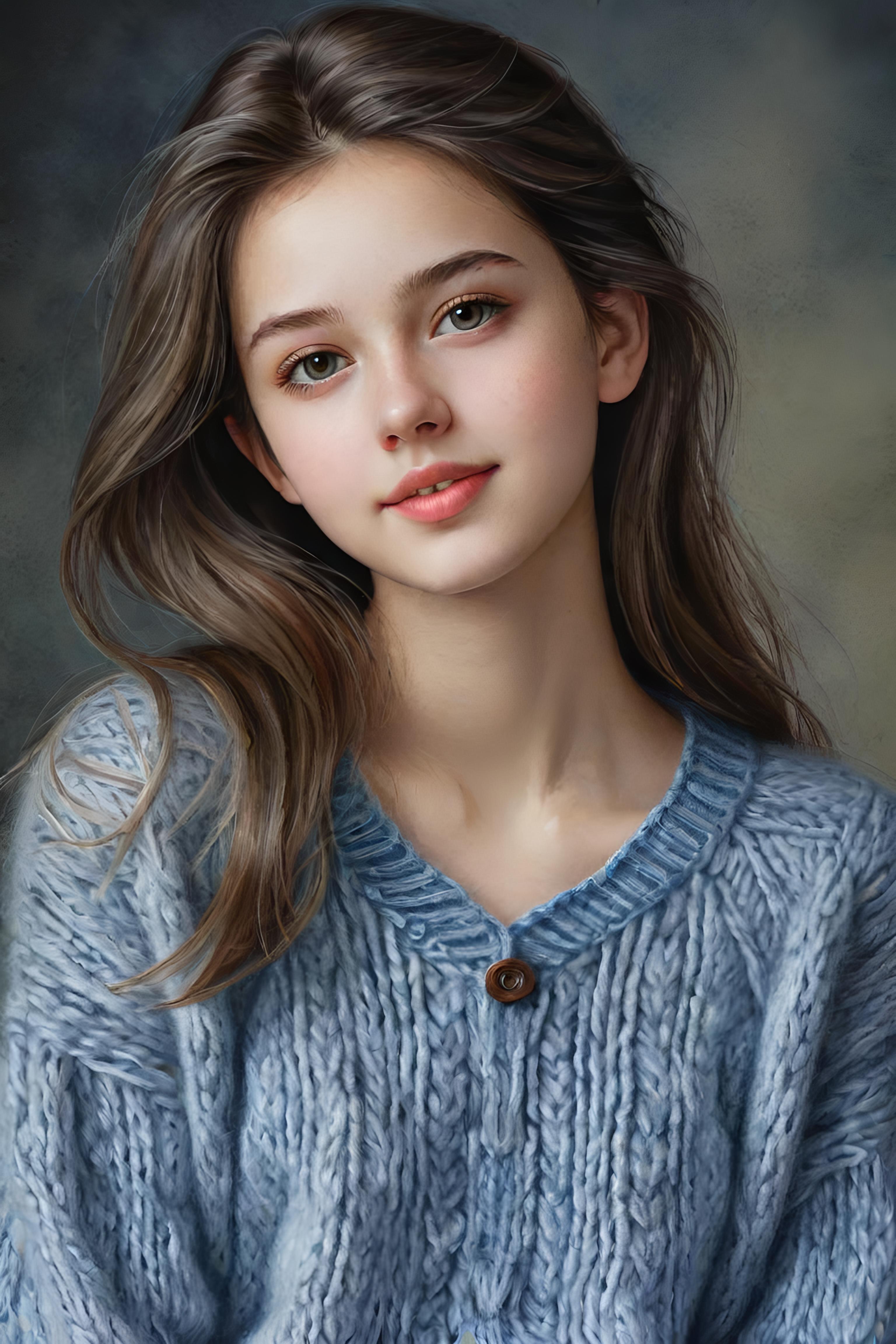 super realistic, detailed, ((gorgeous)) ((stunning)) cute young girl, full portrait, 18 years old, oil painting style, thin wool sweater