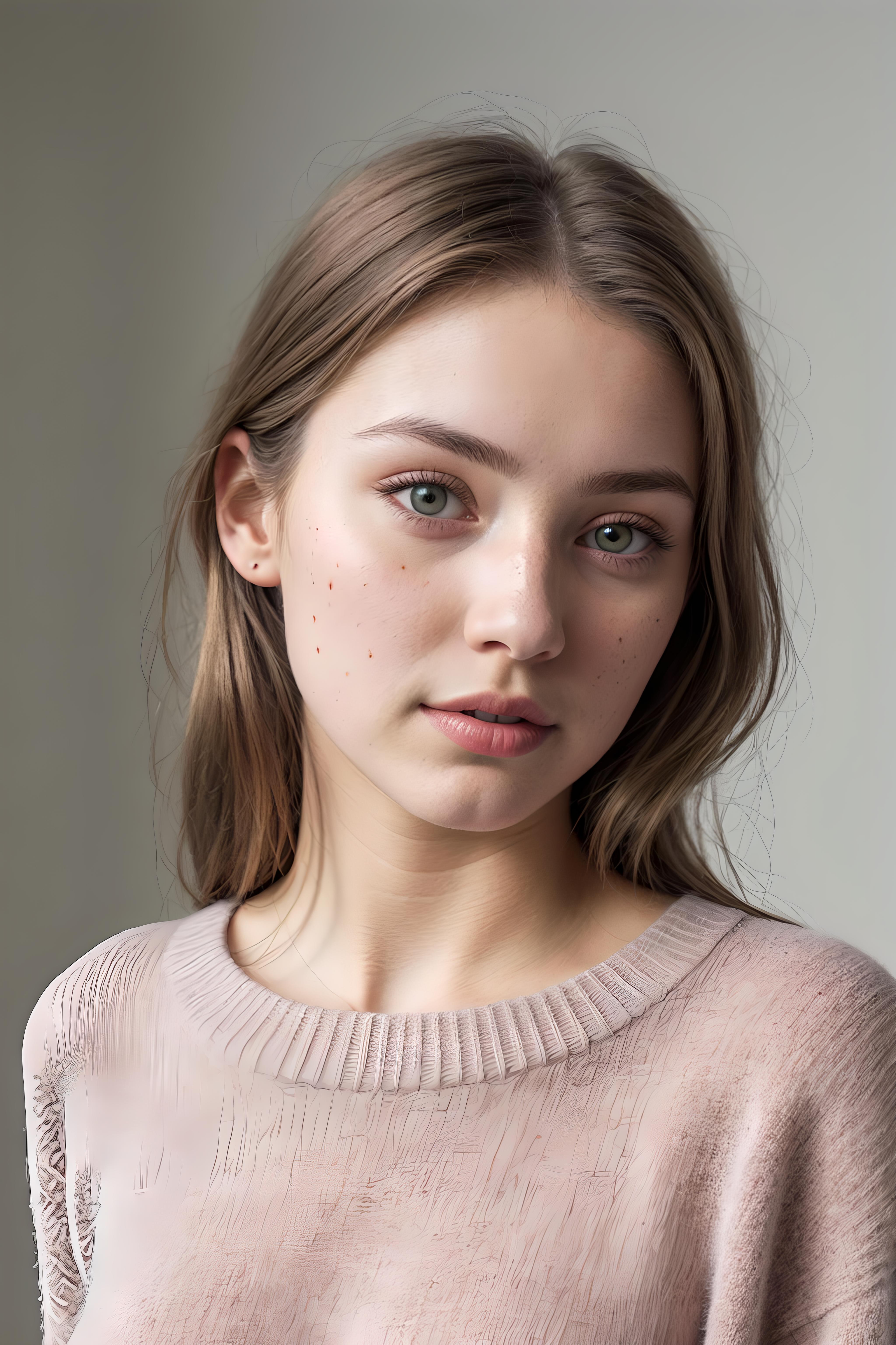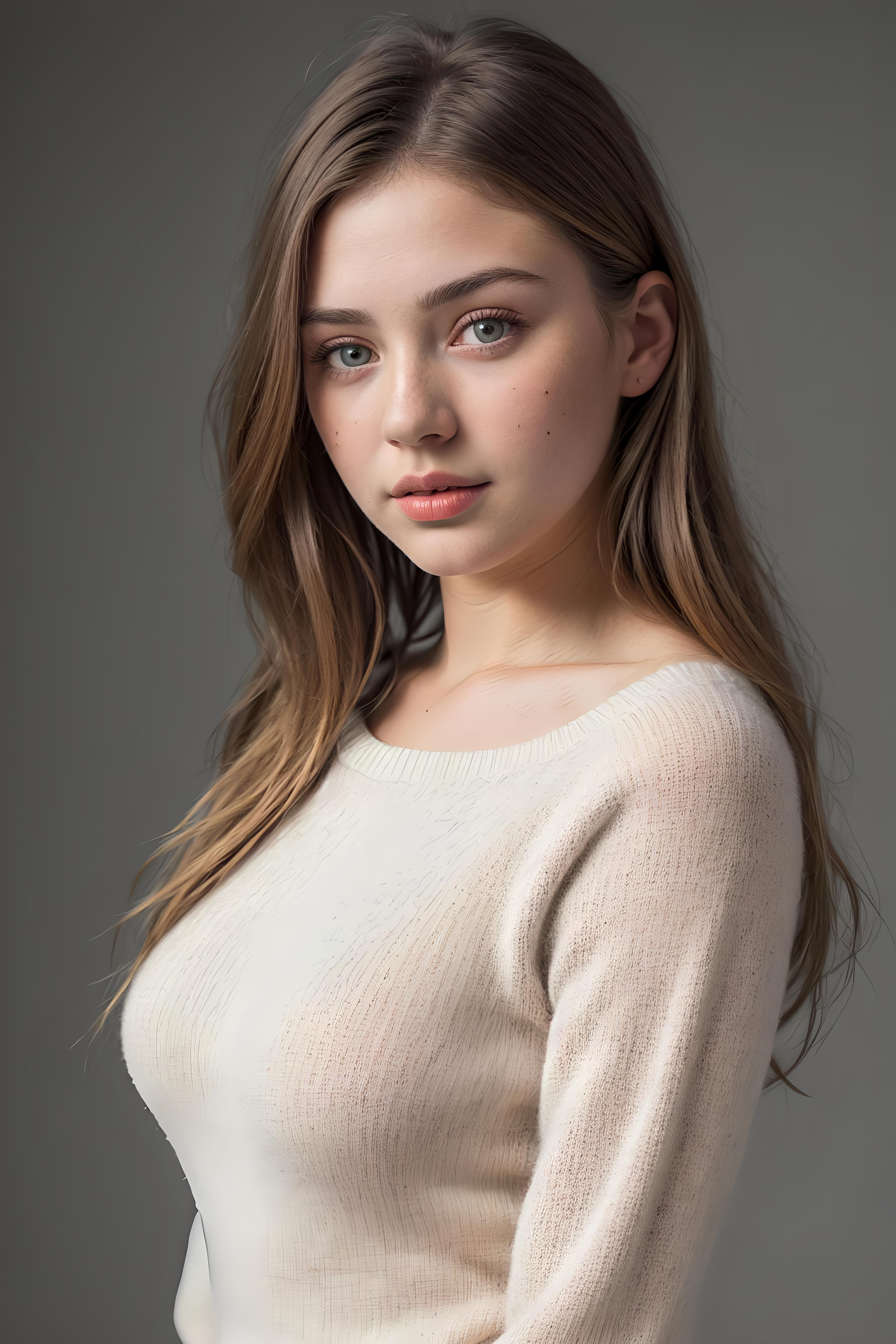 super realistic, detailed, ((gorgeous)) ((stunning)) cute young breasted girl, full portrait, 18 years old, thin wool sweater