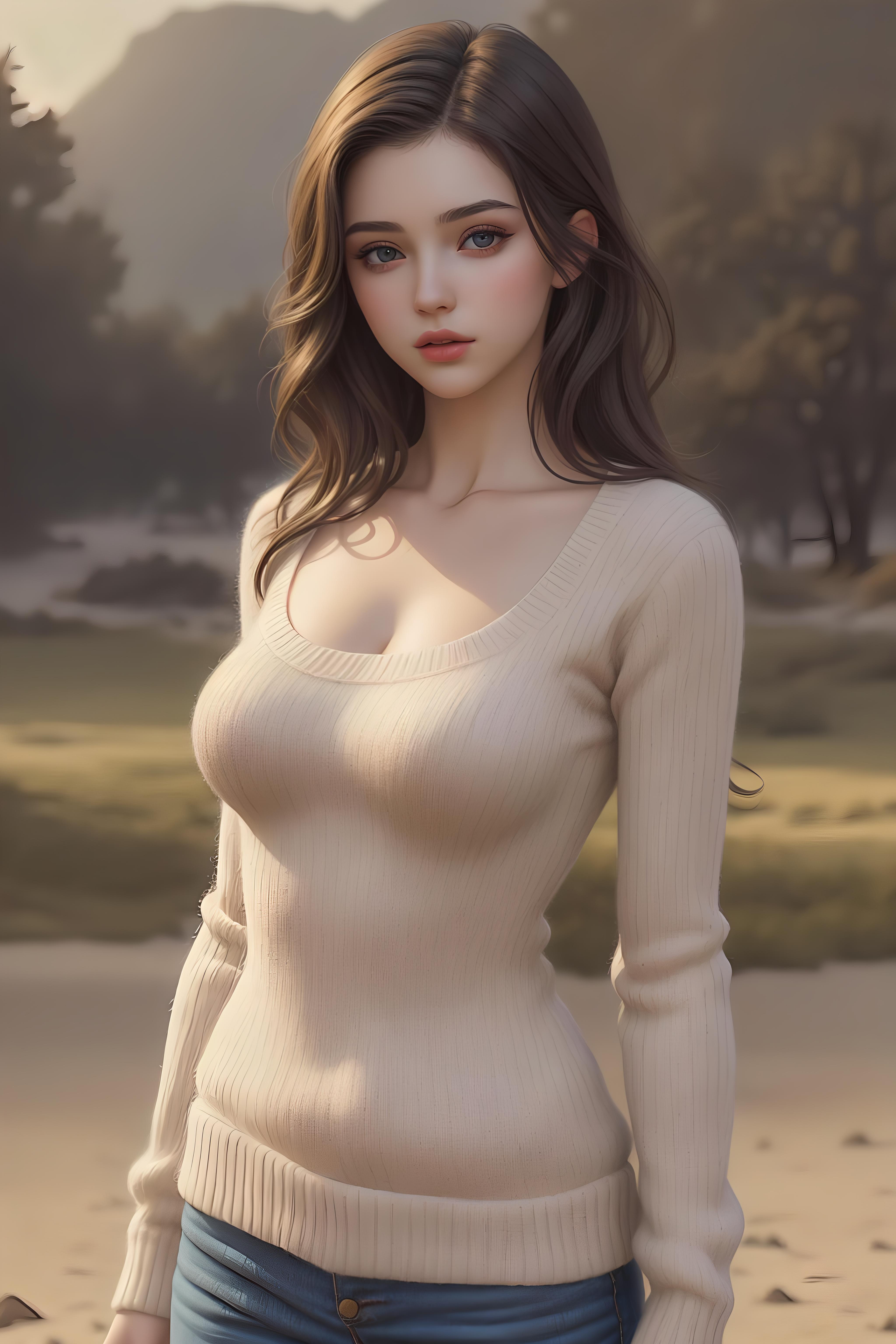 super realistic, detailed, ((gorgeous)) ((stunning)) cute young breasted girl, full portrait, 18 years old, wathercolor style, thin wool sweater