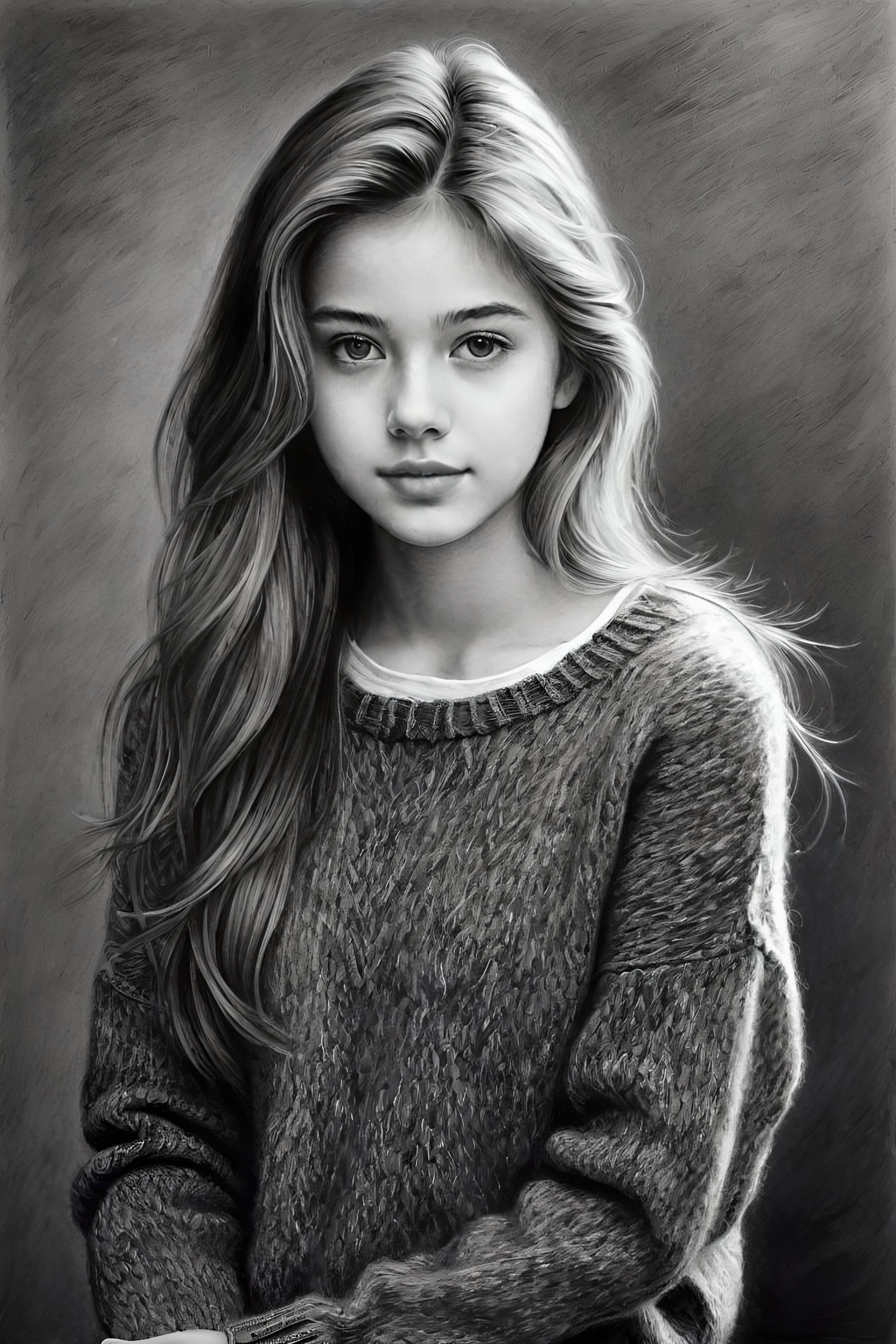 super realistic, detailed, ((gorgeous)) ((stunning)) cute young breasted girl, full portrait, 18 years old, charcoal drawing, thin wool sweater