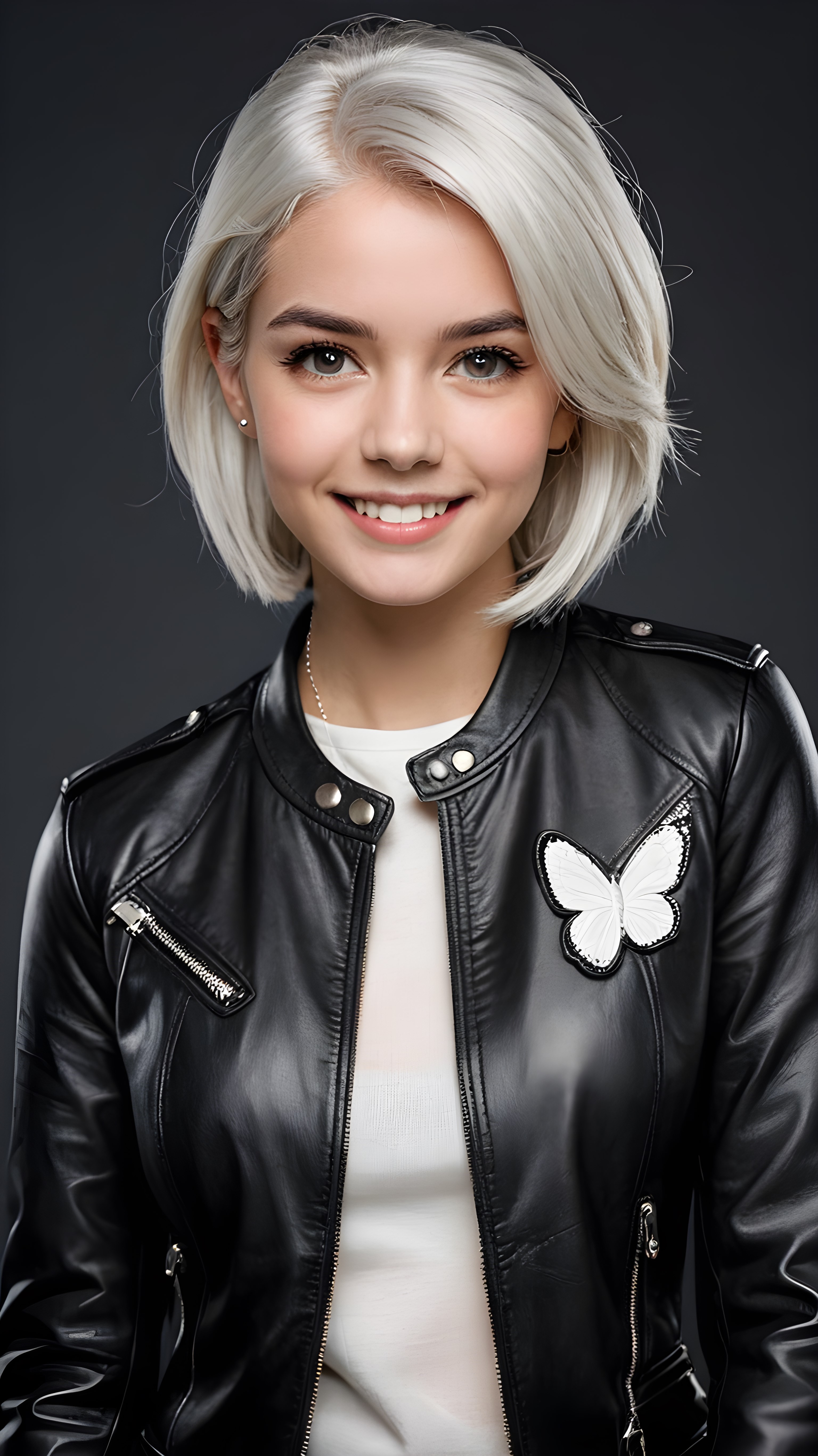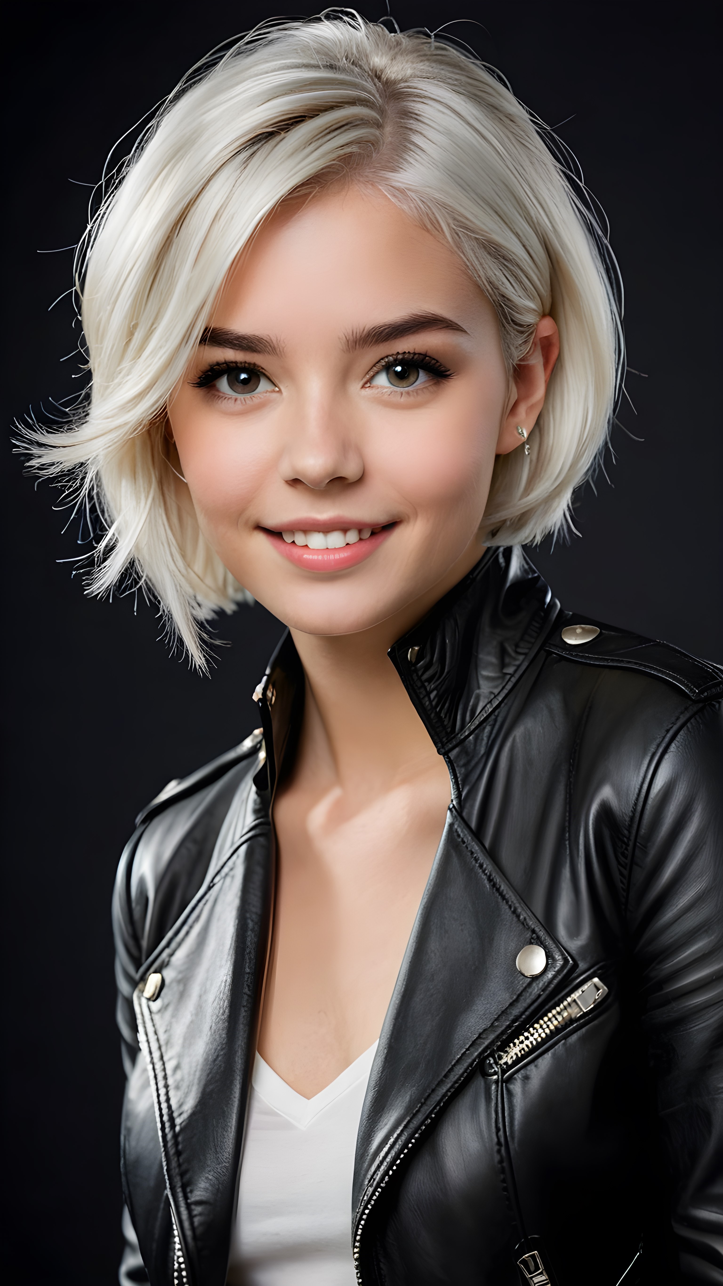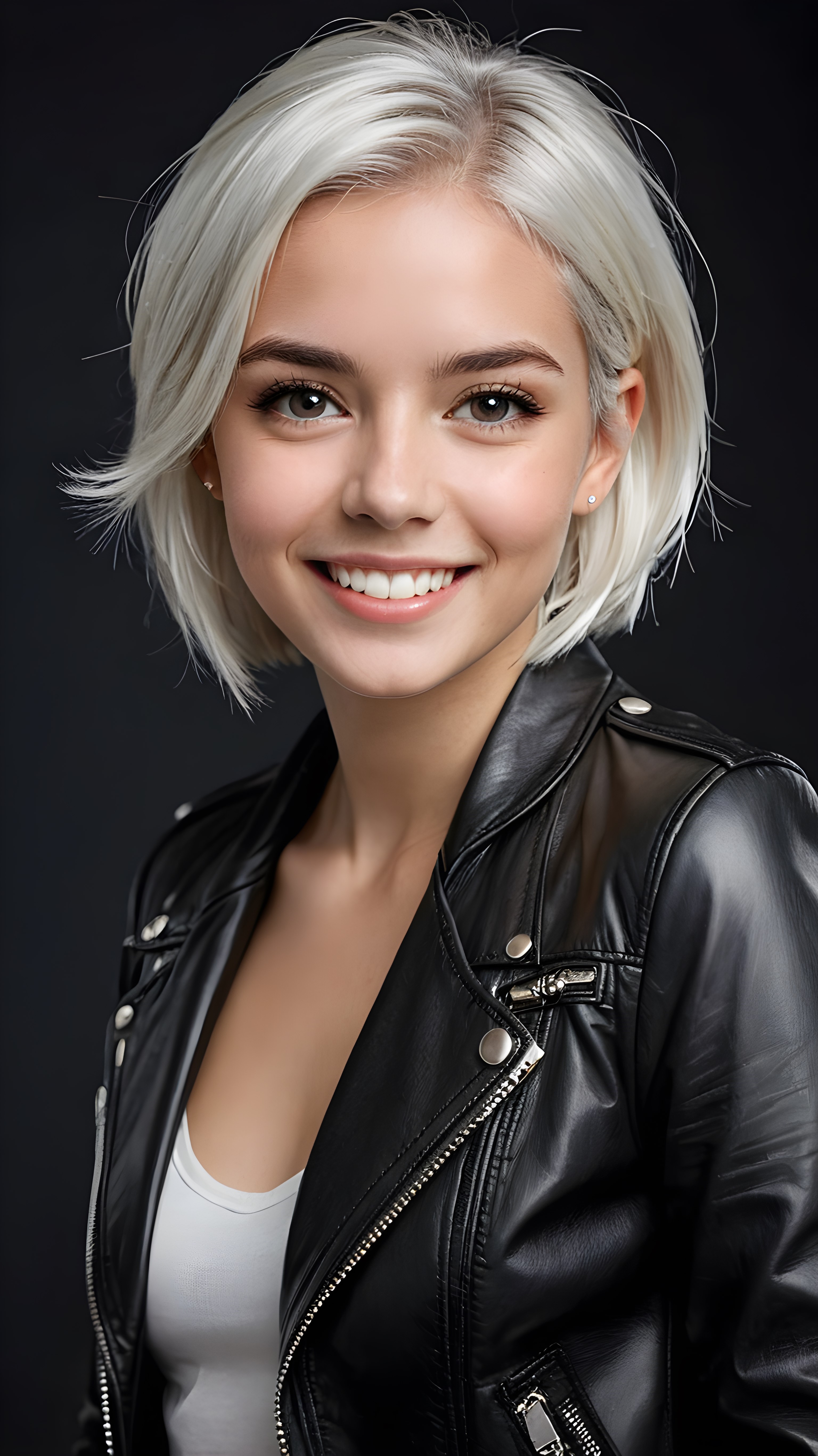 a (((super cute young girlie))), intricate details and sharp focus, set against a backdrop of a (short, sleek black leather jacket) and (real, white hair), emphasizing her exquisite features such as (straight, white teeth) and (perfect, clear skin), all captured in a (professional studio portrait), with a focus on her face, showcasing its exquisite beauty and clarity at an ultra high resolution of 4K or higher