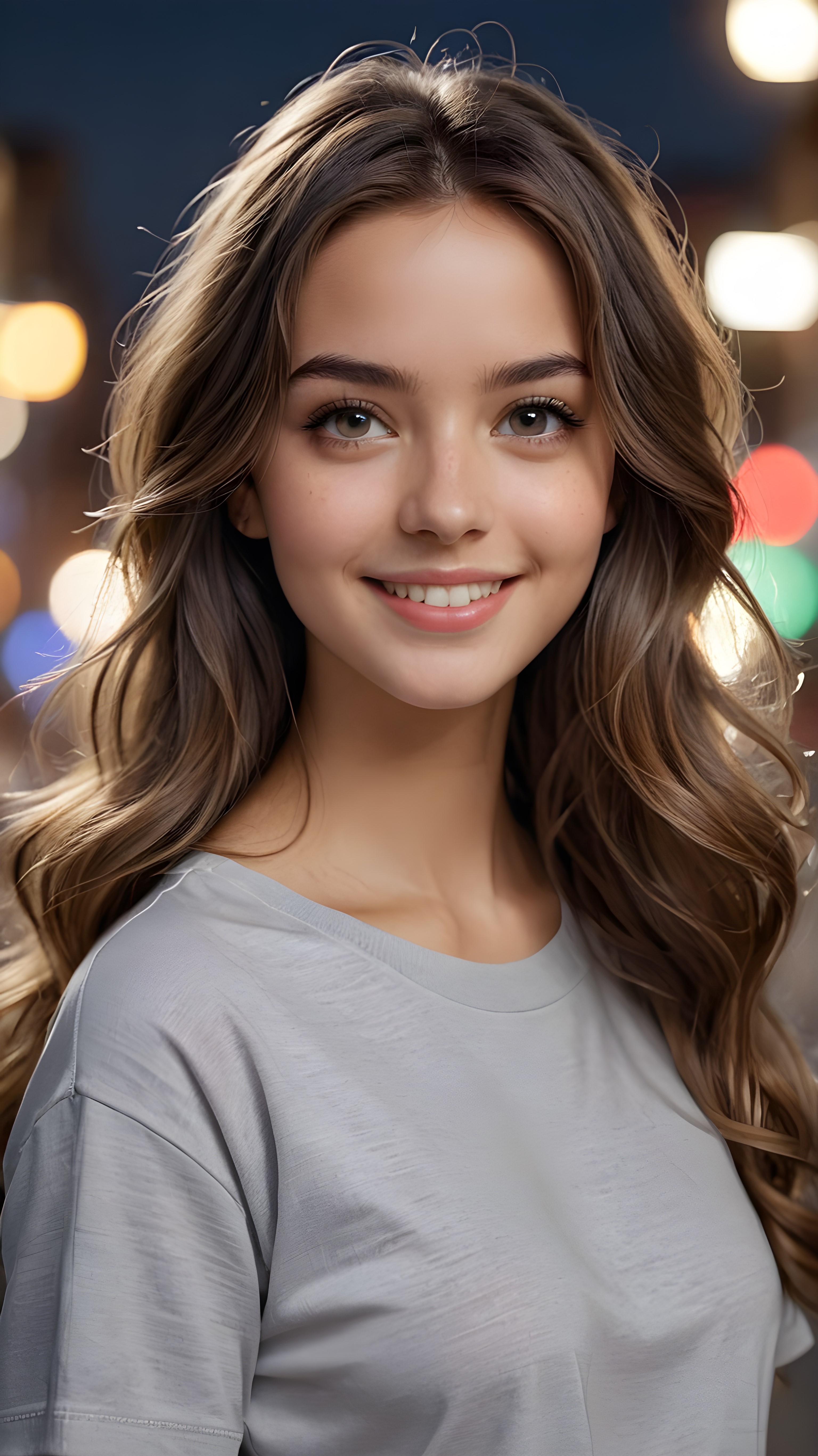 ((super-realistic cute girl)) ((4k)) ((sharp focus)) ((realistic long wavy hair)) ((realistic gray eyes)) ((detailed face)) ((perfect anatomy)) ((curved body)) ((delicate jaw)) ((smile)) ((face illuminated)) (((looks at the camera))) ((wearing a no printed t-shirt)) ((stylized colors)) ((dark tone))