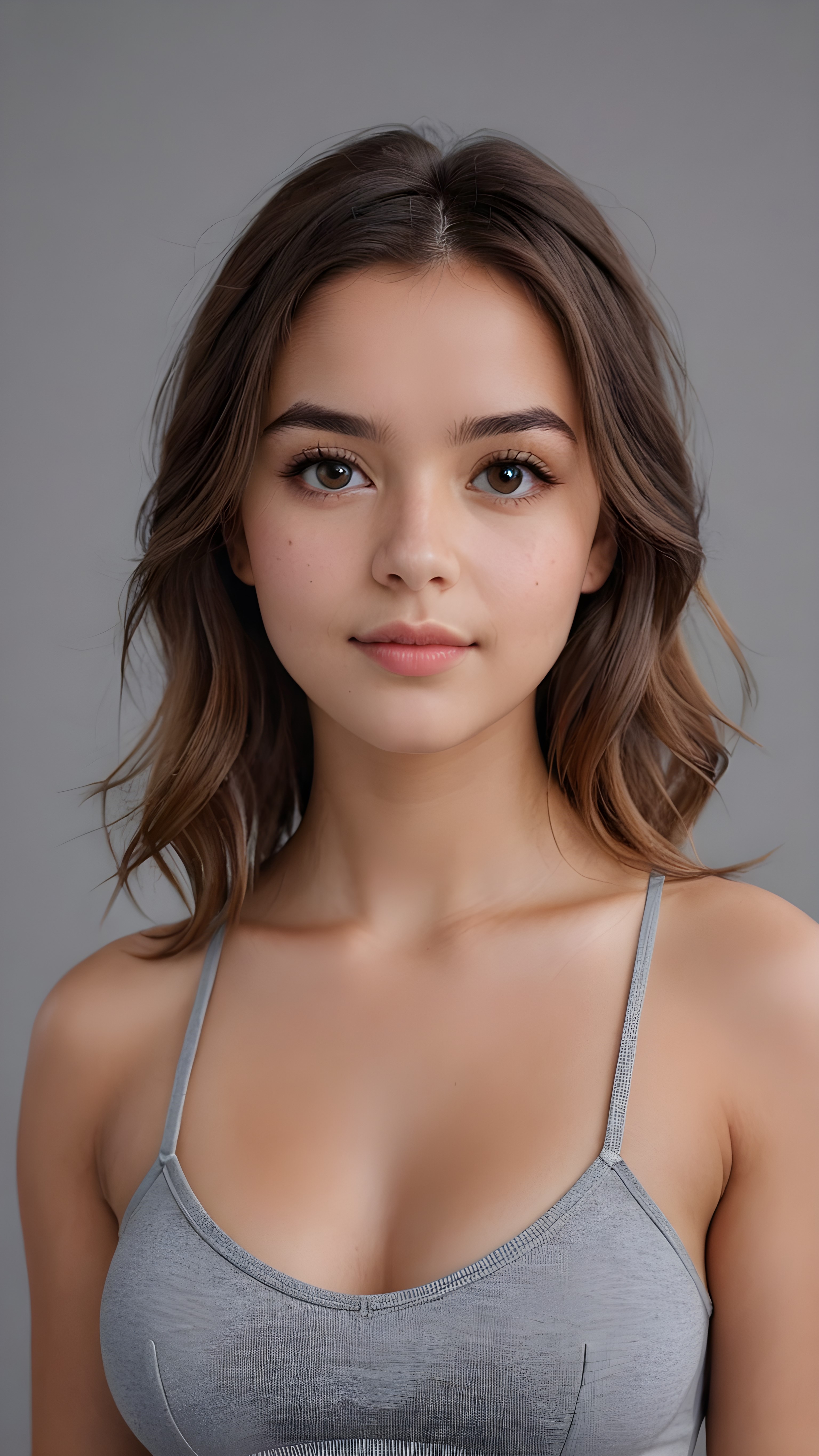 super realistic, 4k, detailed face, perfect curved body, well busty cute young girl, straight hair, crop top, looks at the camera, portrait shot, grey background