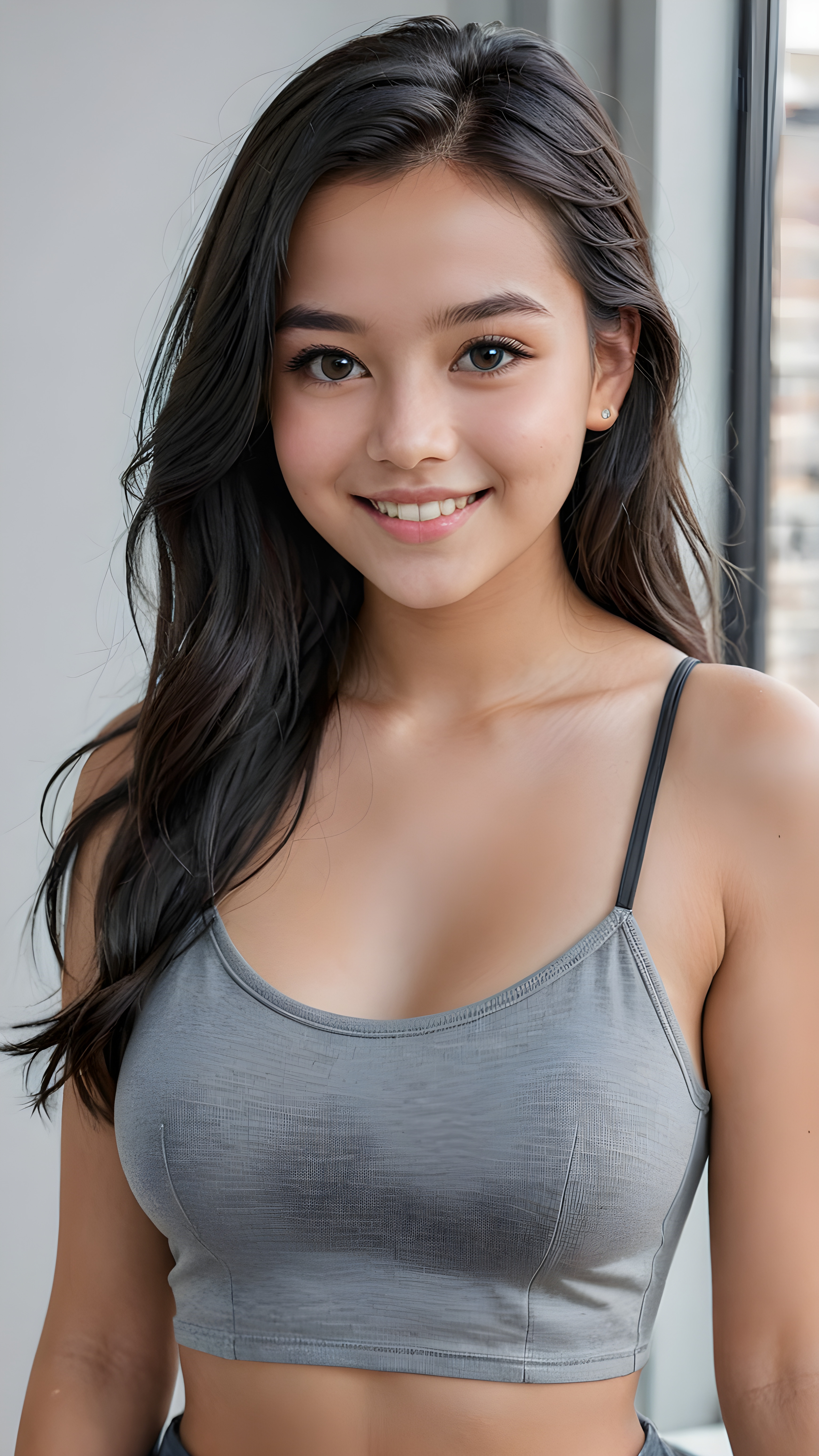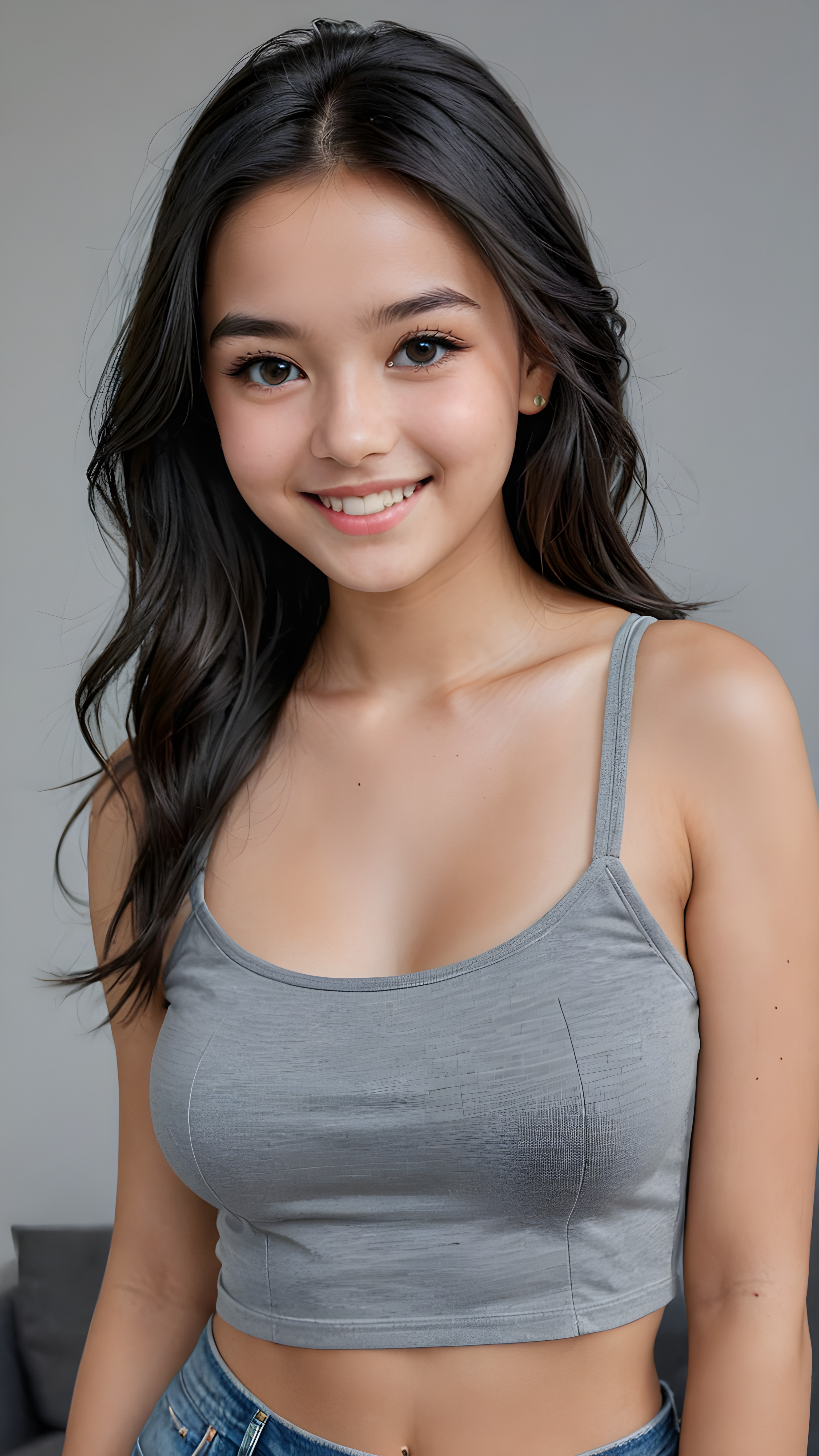 a cute young teen girl, super realistic, detailed face, perfect curved body, straight obsidian black long soft hair, ((short grey crop top)), looks at the camera, smile, portrait shot