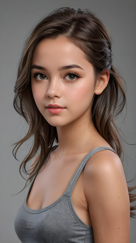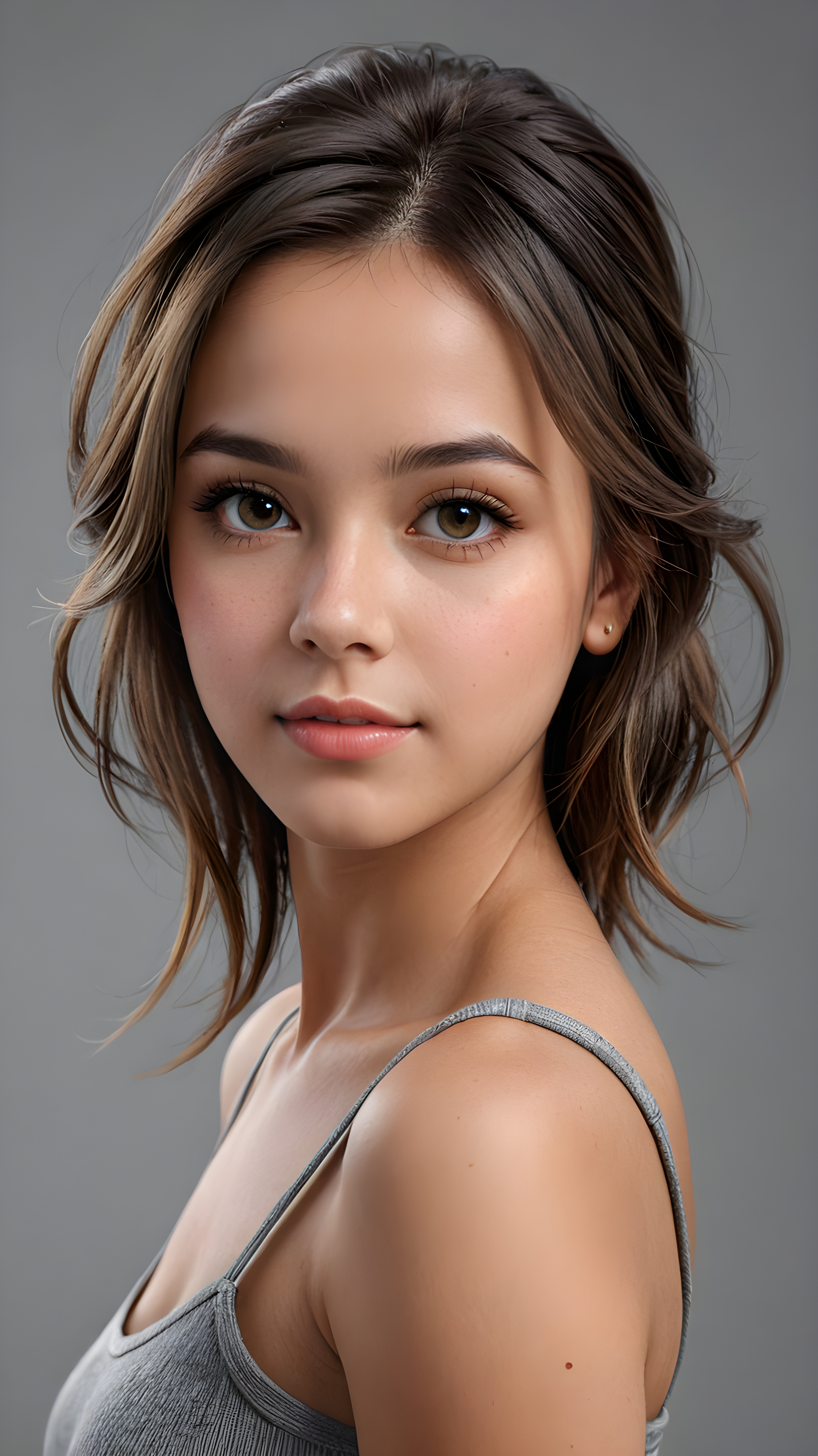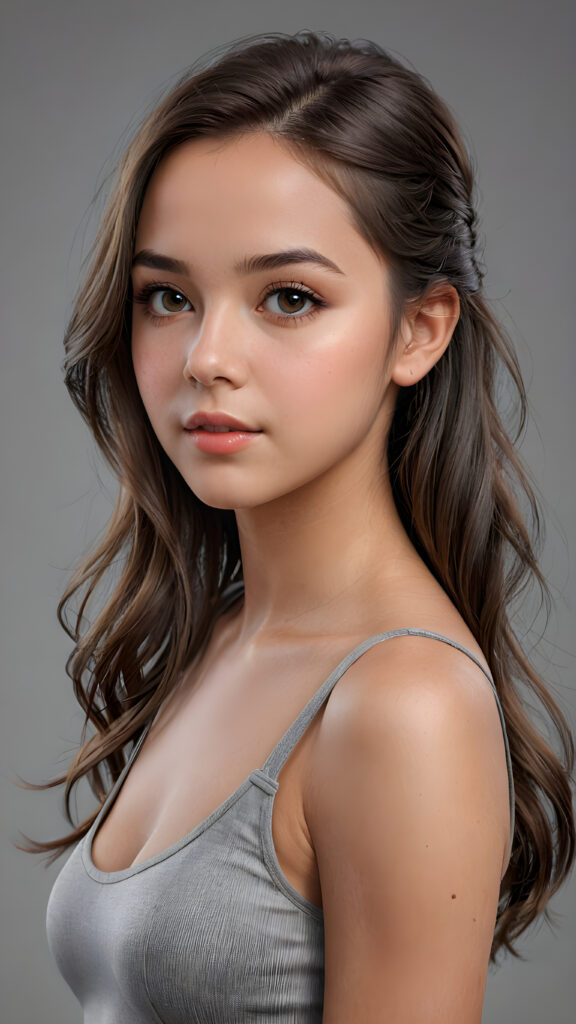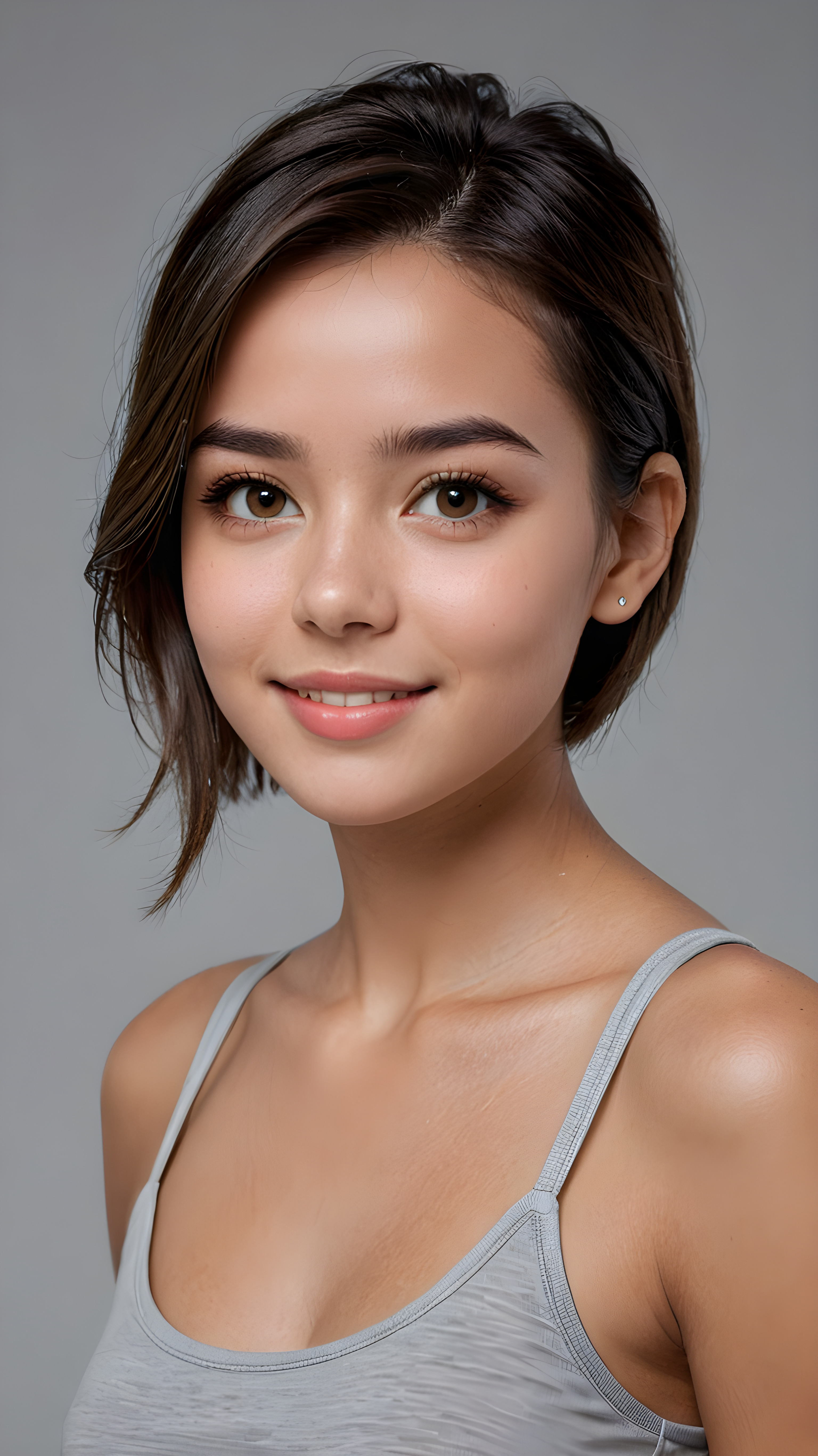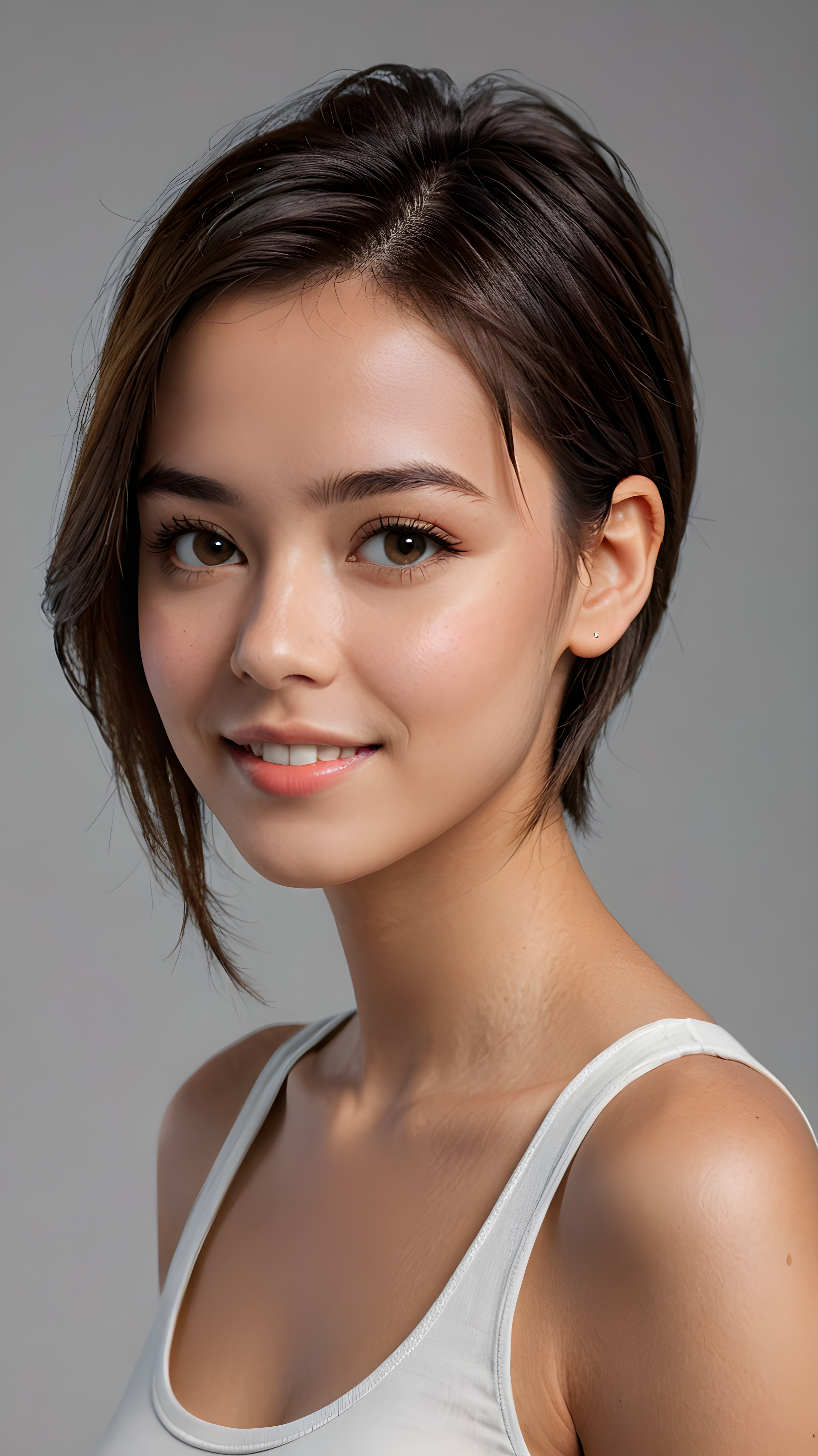 a (((super realistic 4K-detailed face))) with a perfect, slightly curved facial structure and expressive features, set against a softly gray (((background))), facing the camera with short, straight hair and a cute, young girl’s smile, wearing a sleek, minimalist ((straight-shouldered tank top)), in a (side view, advanced perspective)
