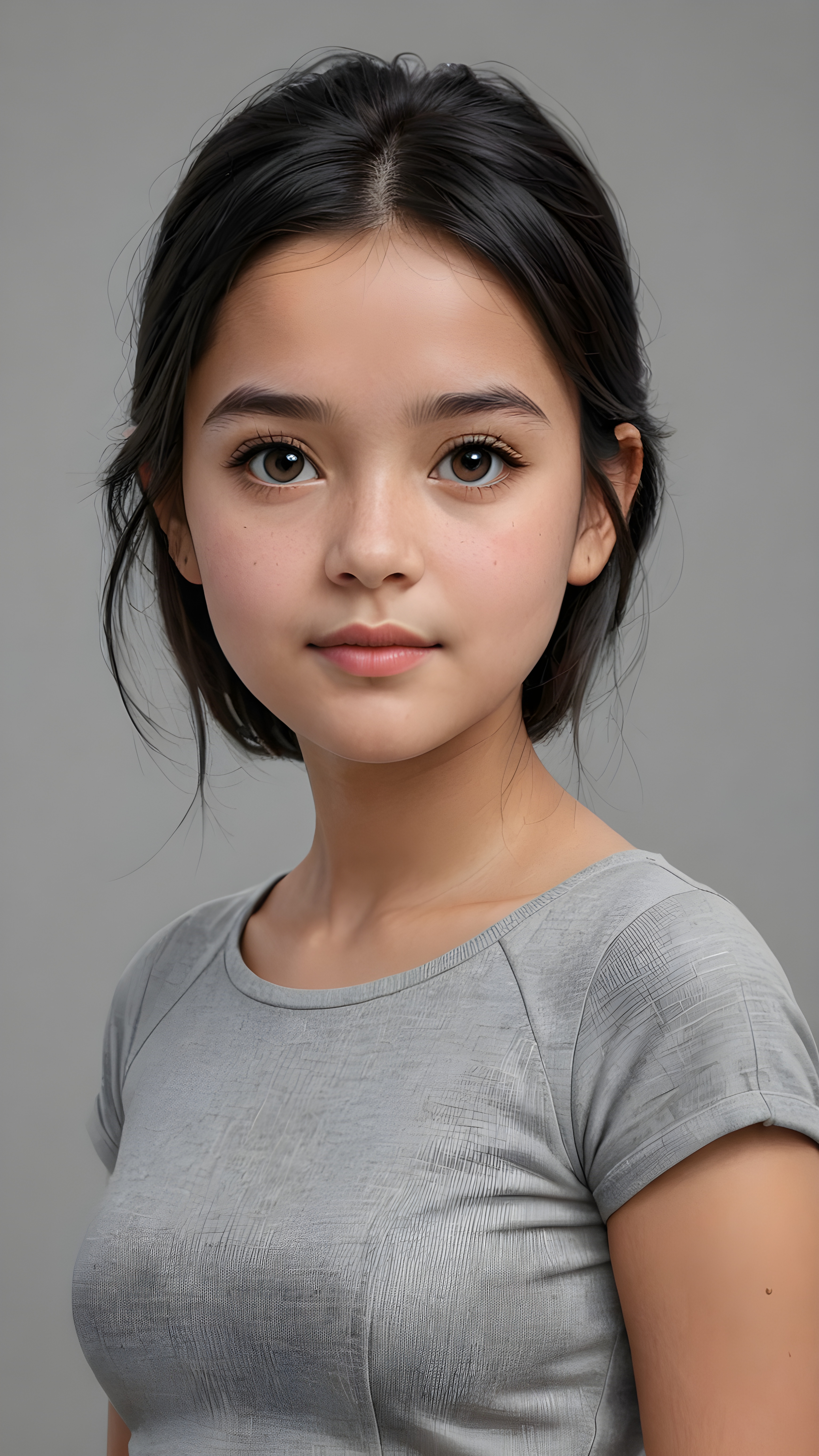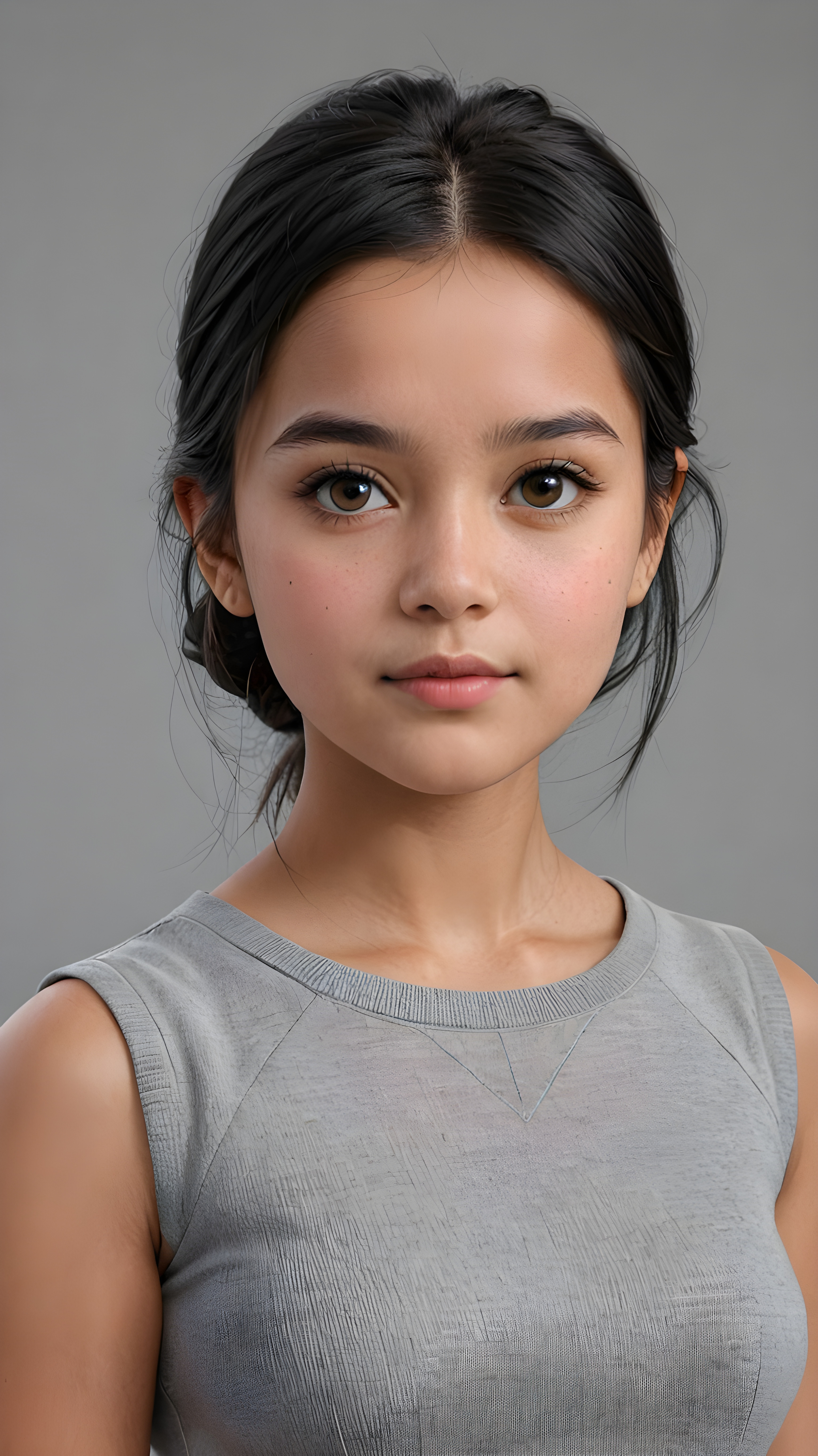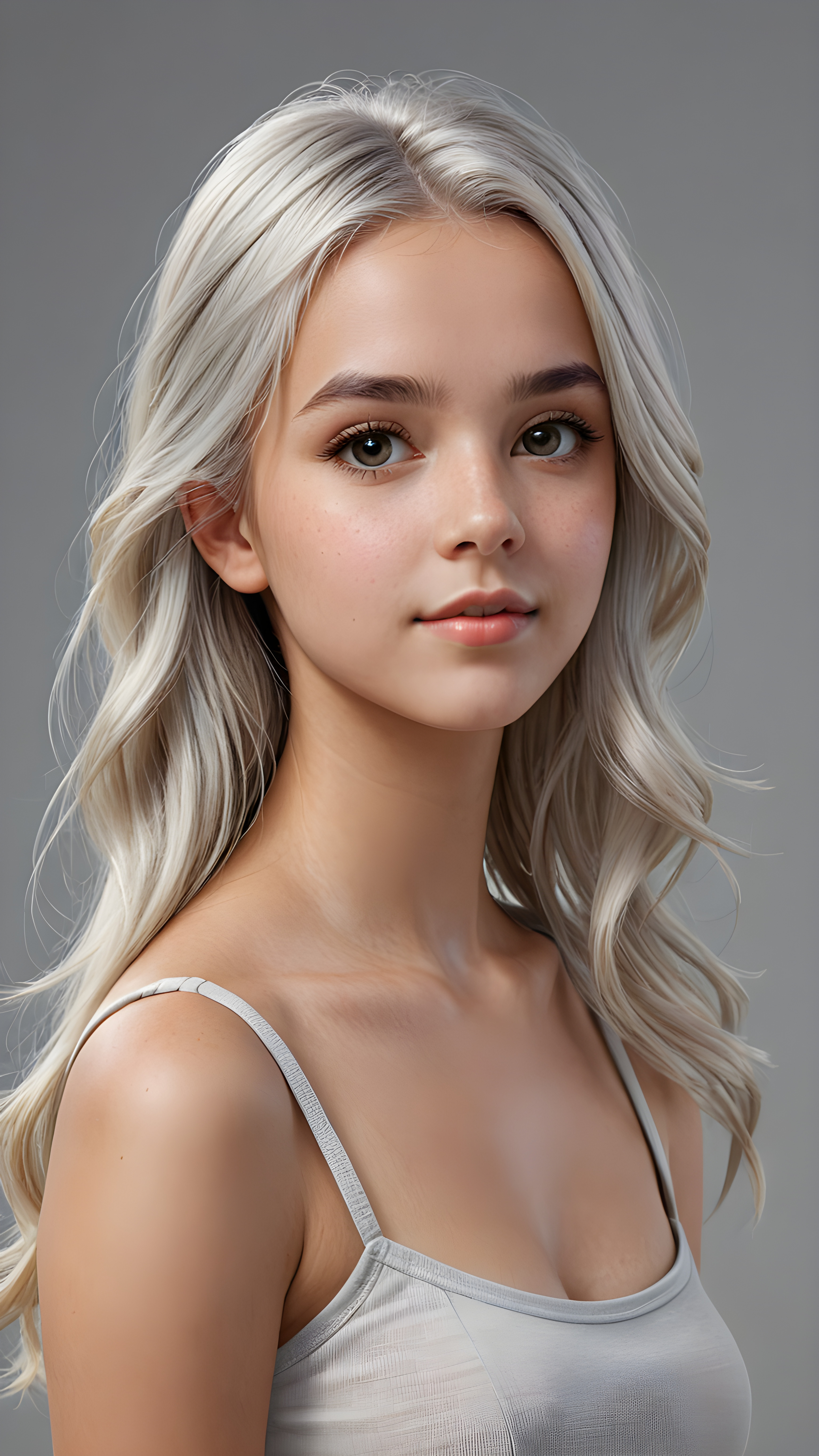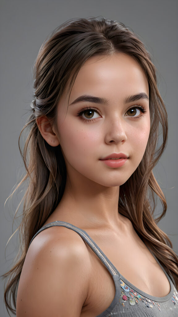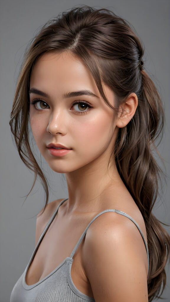 a (((super realistic 4K-detailed face))) with a perfect, slightly curved facial structure and expressive features, set against a softly gray (((background))), facing the camera with short, straight hair and a cute, young girl’s smile, wearing a sleek, minimalist ((straight-shouldered tank top)), in a (side view, advanced perspective)