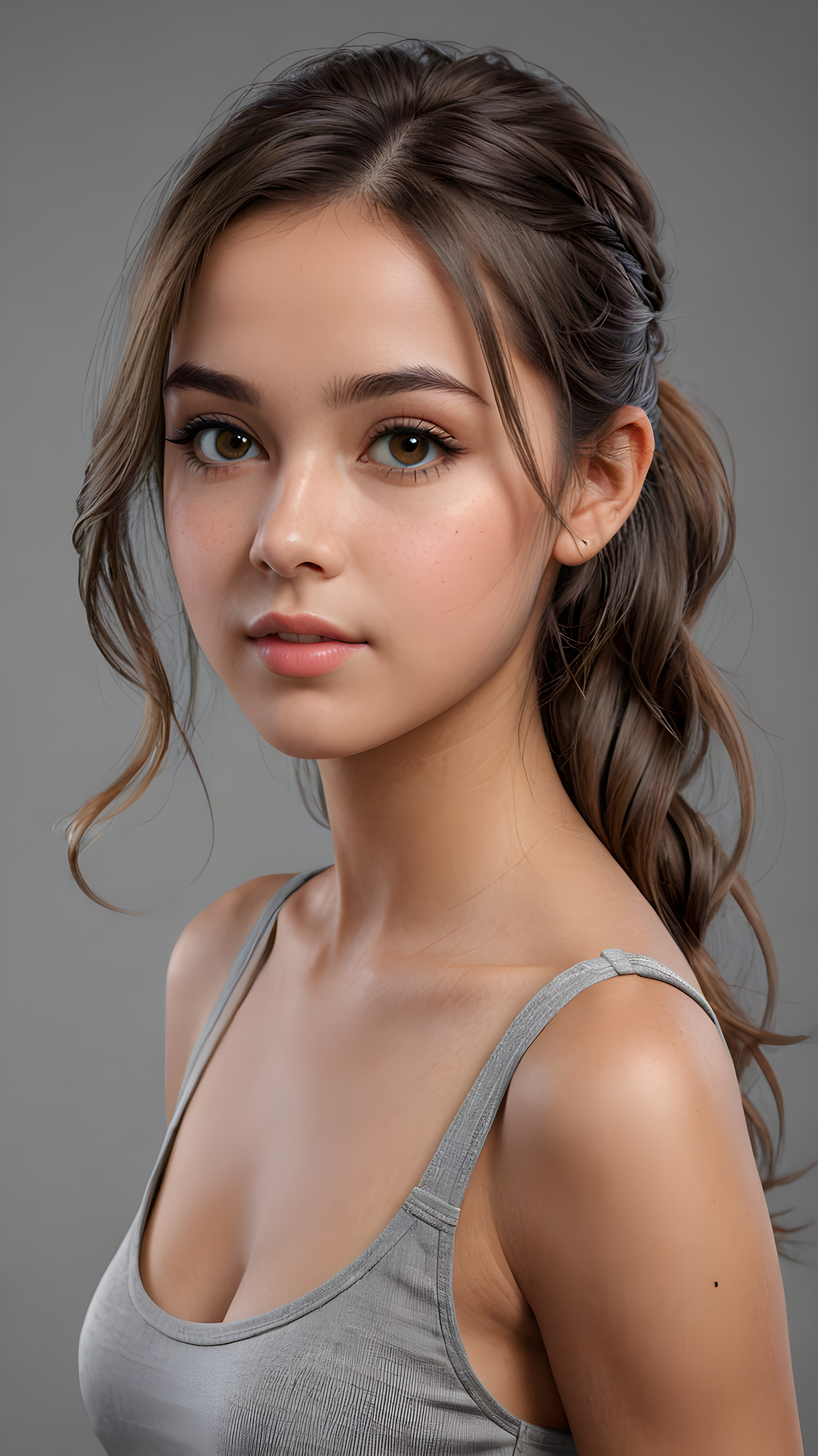 super realistic, 4k, detailed face, perfect curved body, cute young girl, straight soft hair, short tank top, looks at the camera, portrait shot, grey background, side view