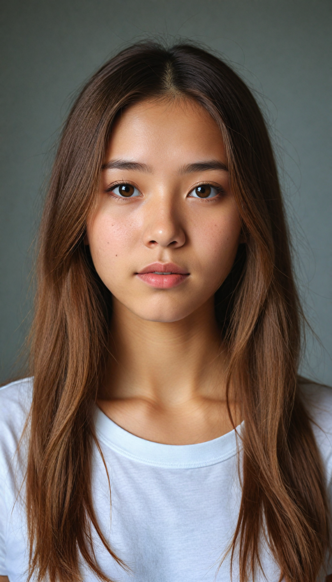 a (stunningly elegant and cute long, straight hazelnut hair) Asian (teen girl) with a (realistically detailed angelic round face) and (realistically detailed hazelnut eyes) looking pensively at the camera in a (perfectly drawn portrait shot) against a (flawlessly detailed, realistic skin color) backdrop, wearing a (super short, tight white t-shirt made on thin silk), her flawless form elegantly framed by a side perspective, without any (background details)