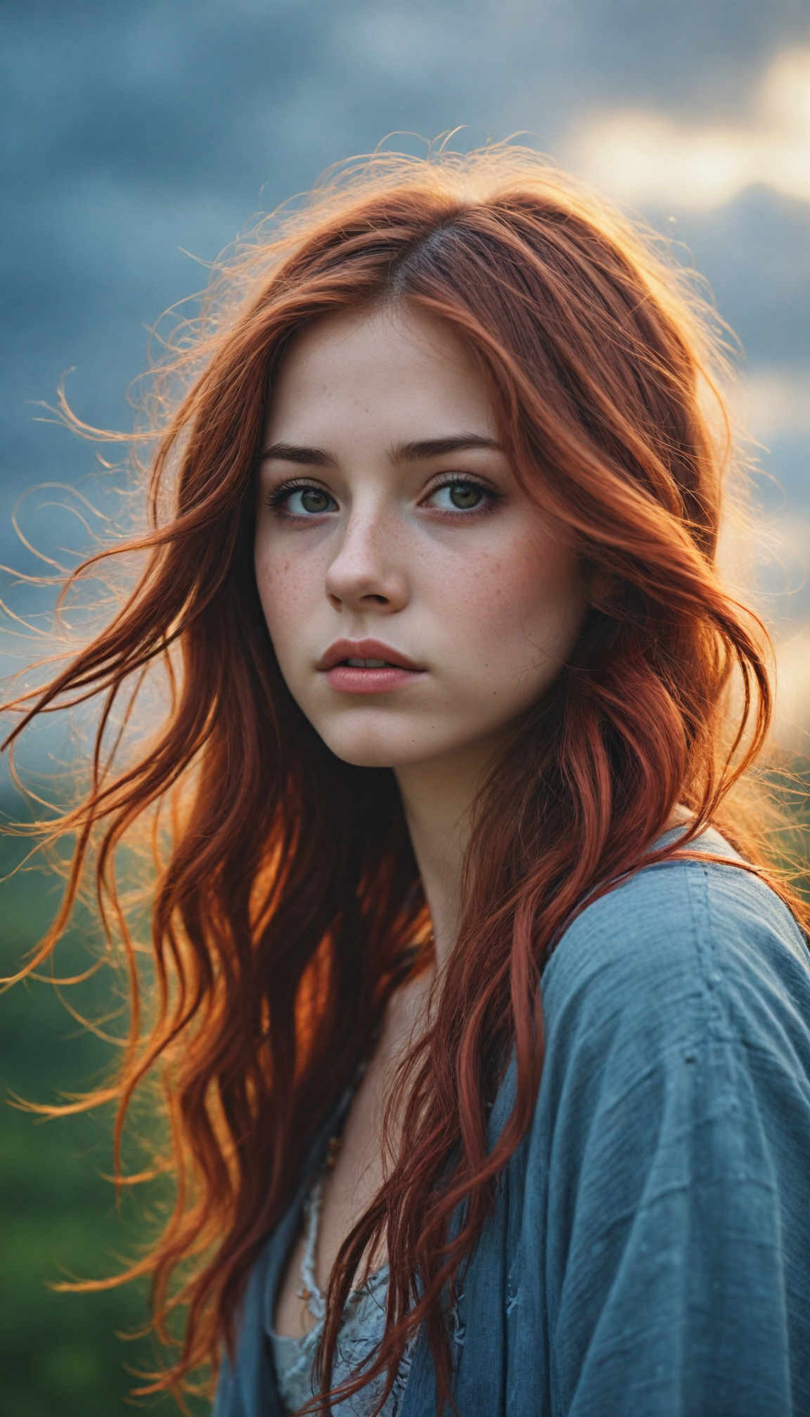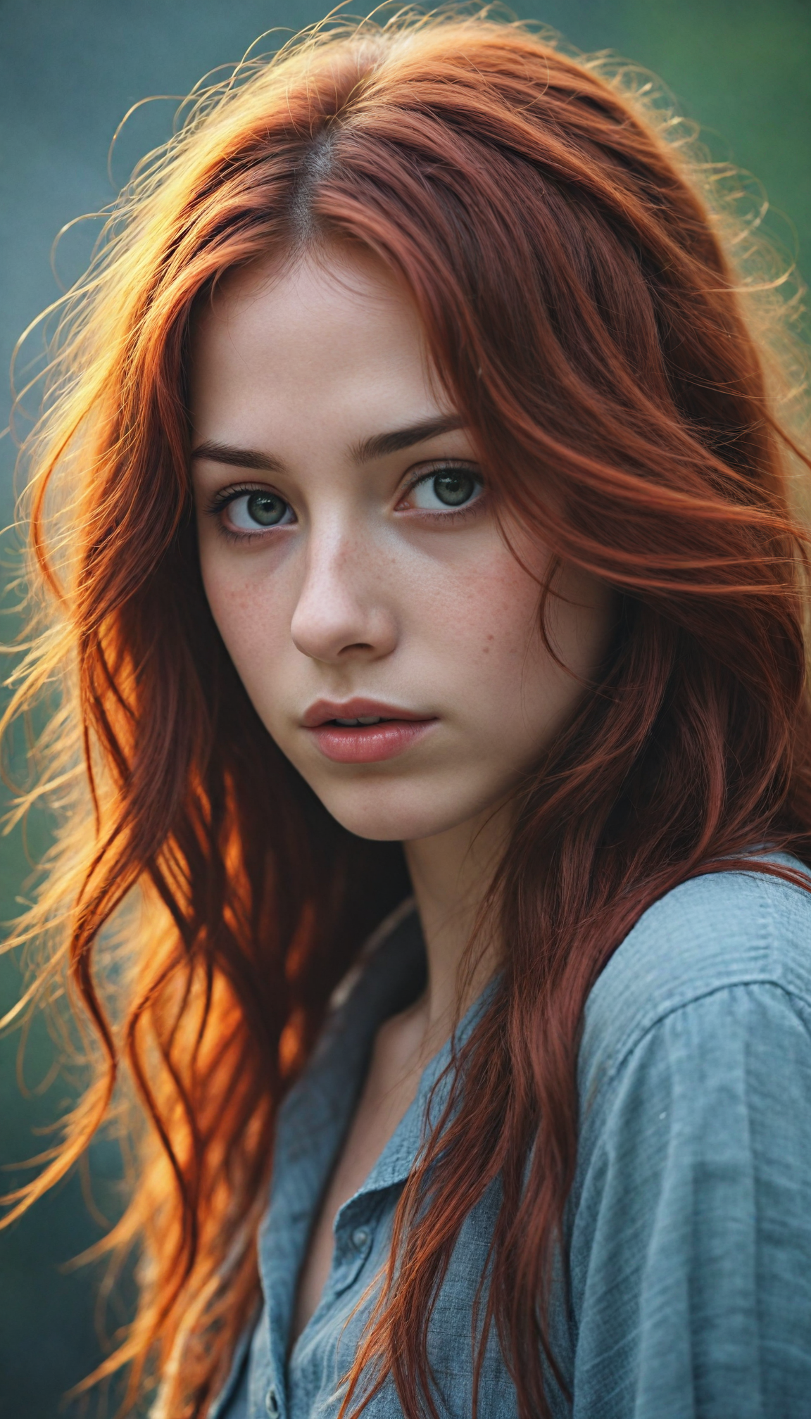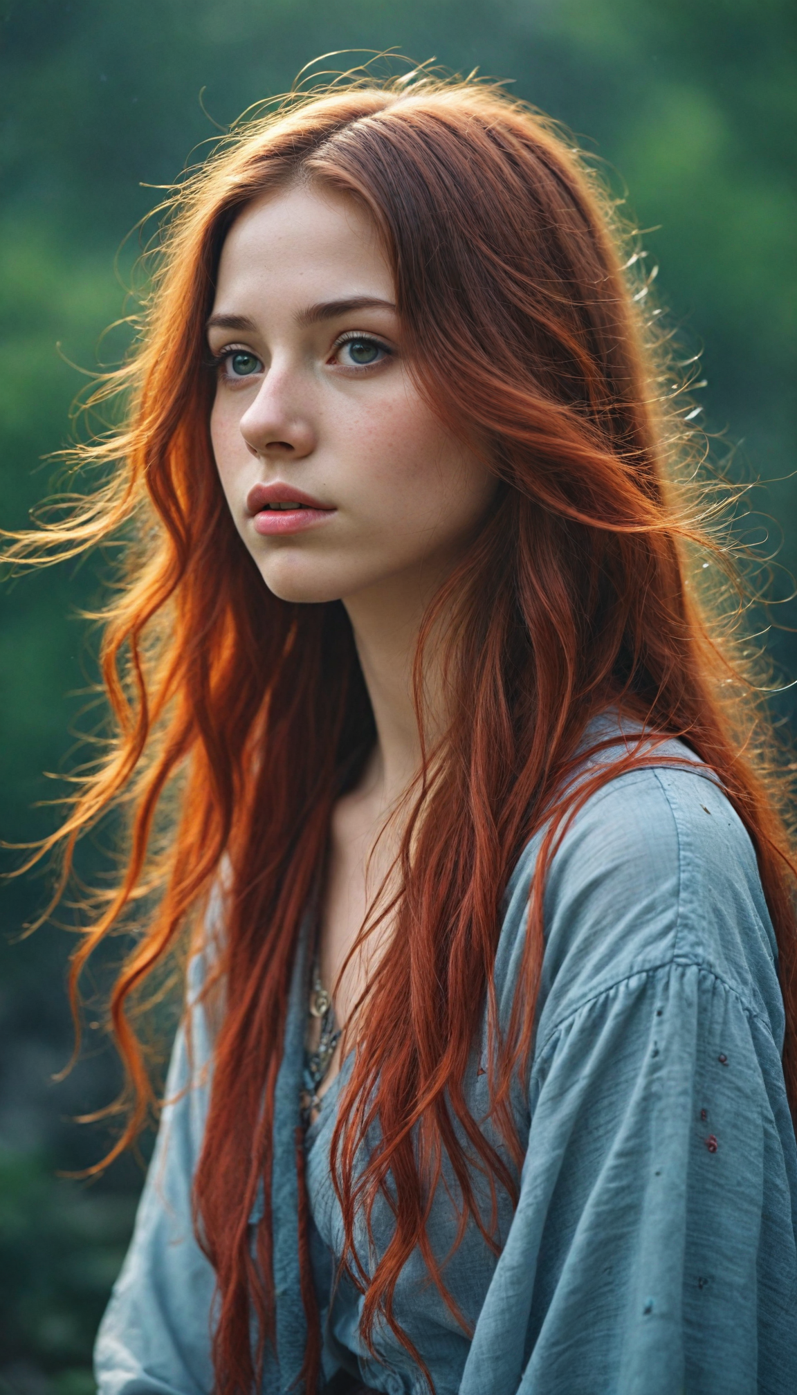 hyper-realistic, intricately detailed portrait of a stunning young Asian woman with flowing, soft red hair cascading down her shoulders, caught in an ethereal glow. Her enchanting round eyes sparkle with depth and emotion, inviting the viewer into her world. She wears a delicate, flowing white tank top that hints at elegance, accessorized with shimmering silver earrings. The background features a dreamlike bokeh of soft pastel colors, blending seamlessly to enhance her beauty, with hints of floral motifs echoing a whimsical fairytale vibe. The lighting is warm and inviting, casting gentle shadows that accentuate her features, creating a sense of serenity and charm