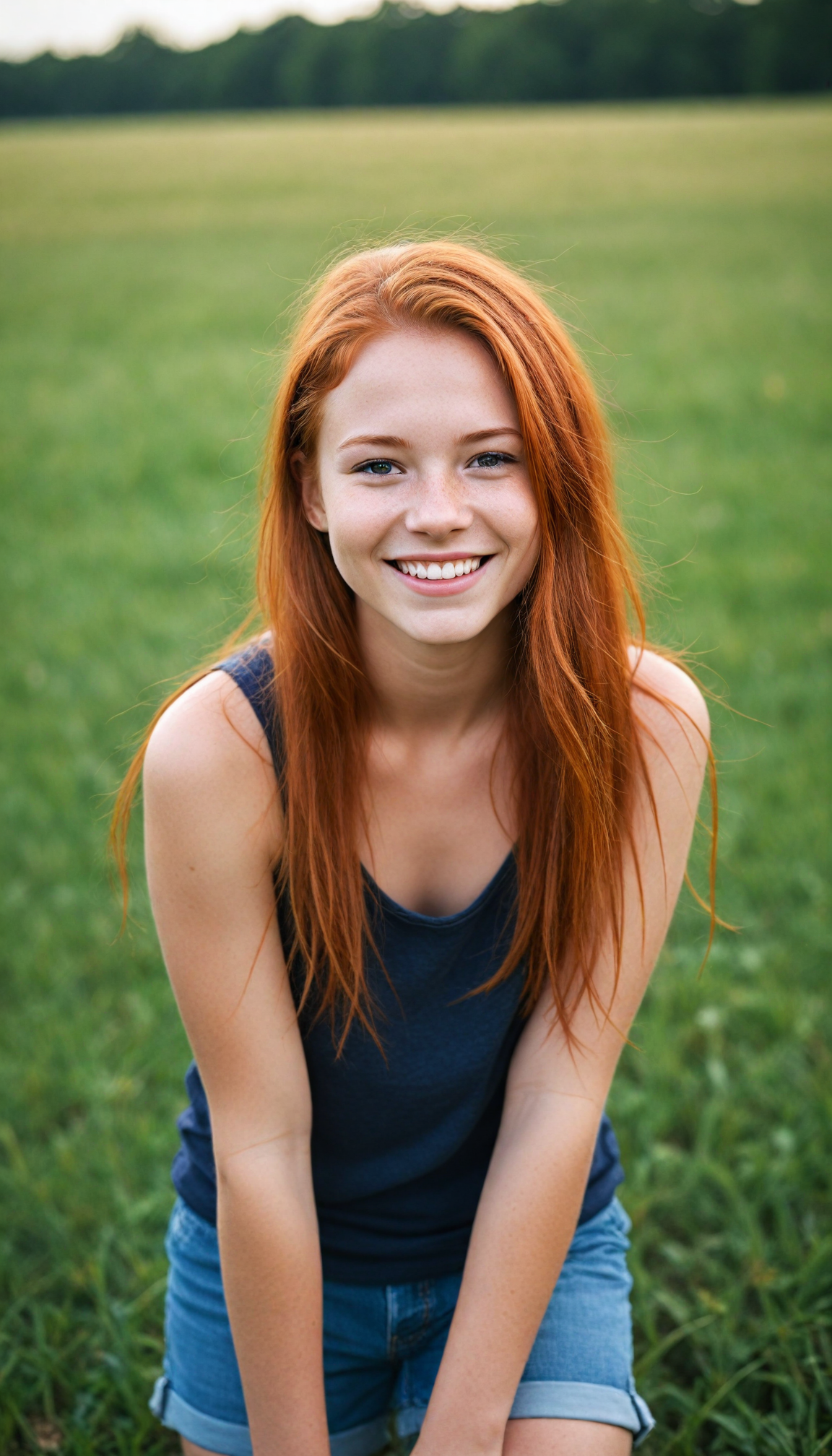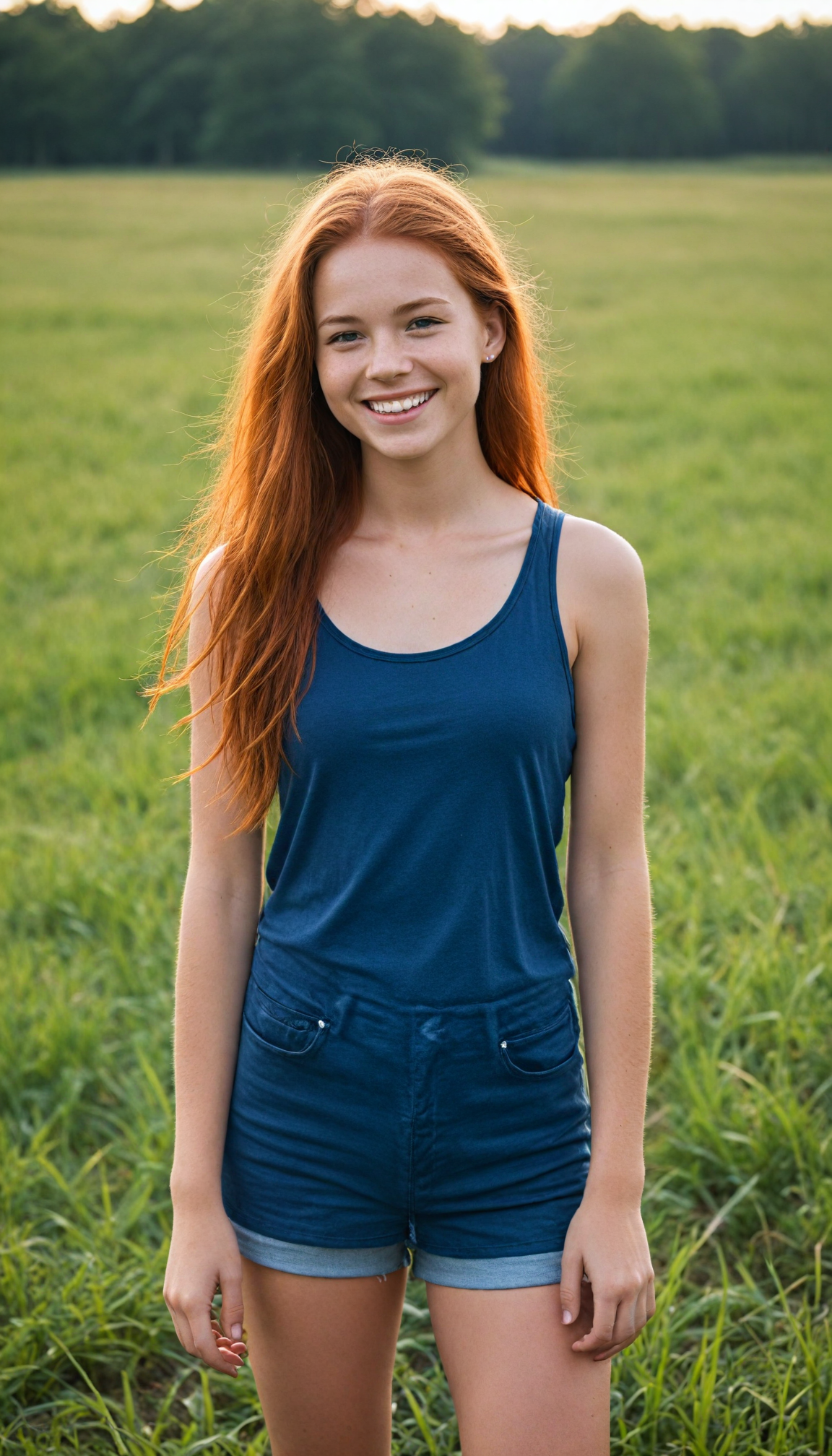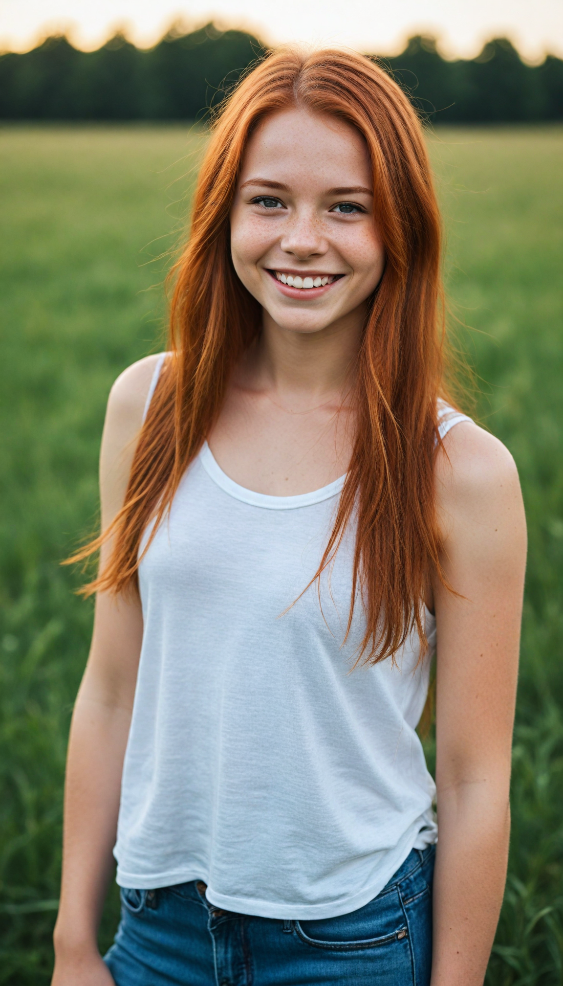 a (cute little red-haired teen girl), straight long hair, smile very happy, stands confidently in a field, she wears a thin tank top, perfect body (perfect portrait)