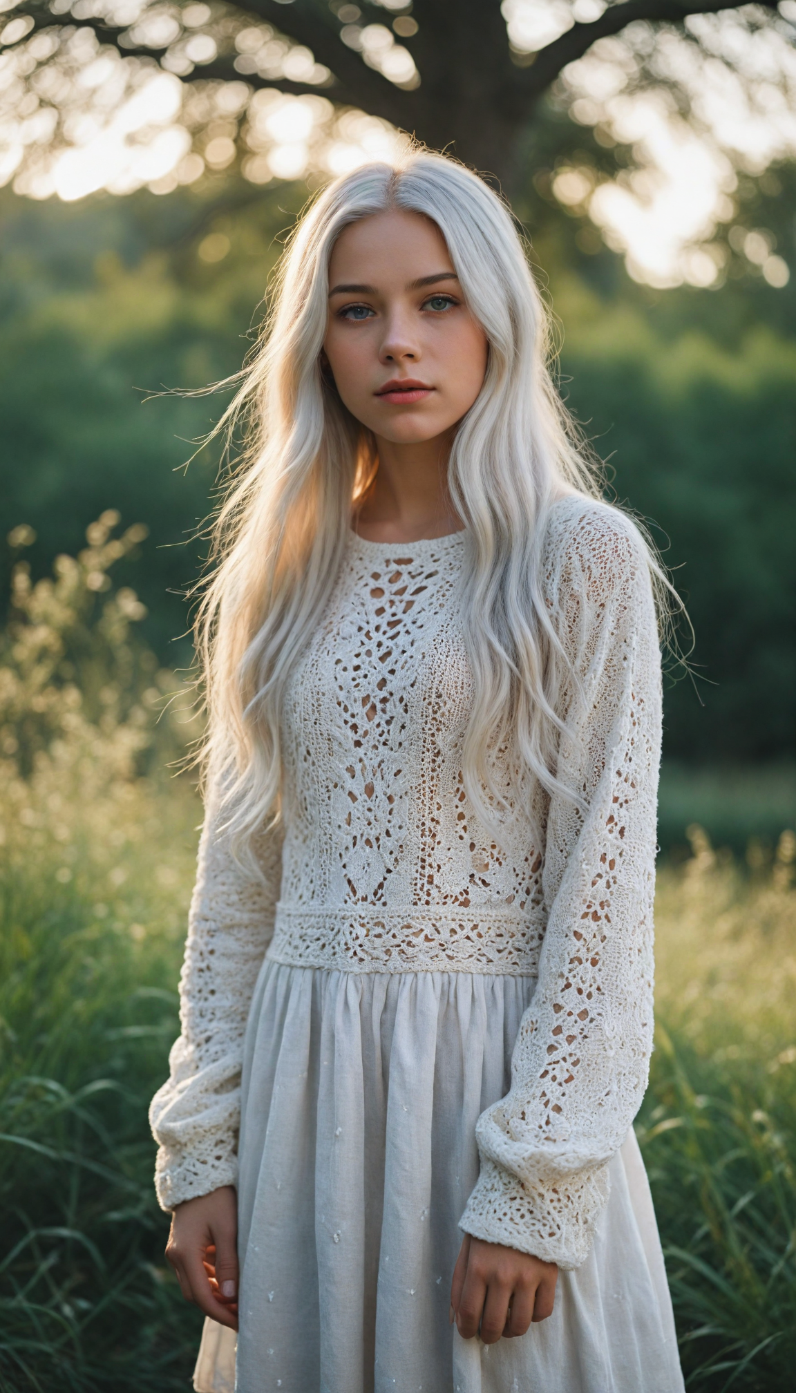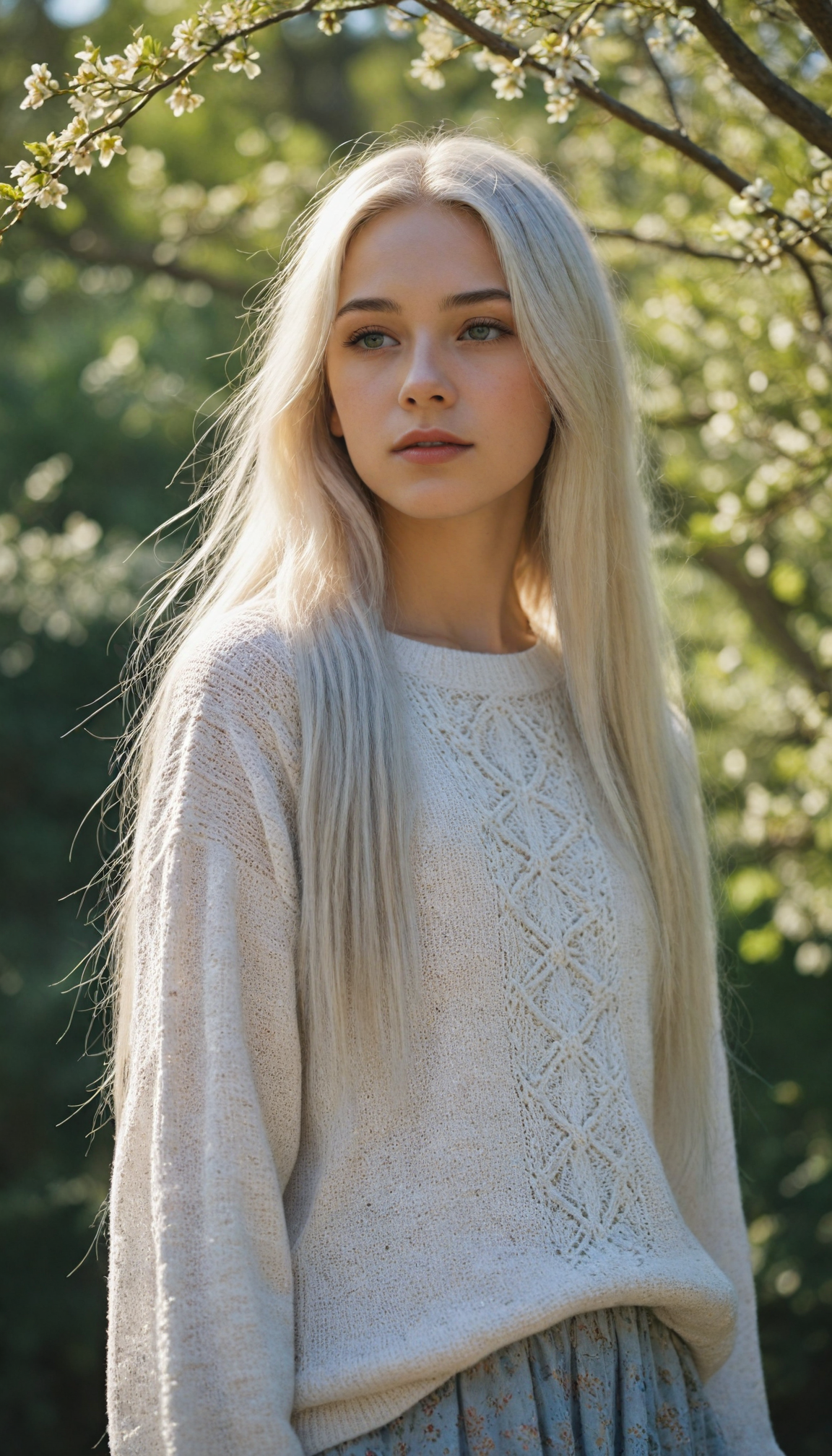 a whimsical young teen girl with cascading long straight white hair, wearing an exquisitely detailed super fine wool sweater adorned with intricate motifs, set against a dreamy pastel landscape; the scene is bathed in soft golden sunlight, evoking a magical, fairy-tale aura, in the style of classic children’s book illustrations combined with a touch of contemporary realism.