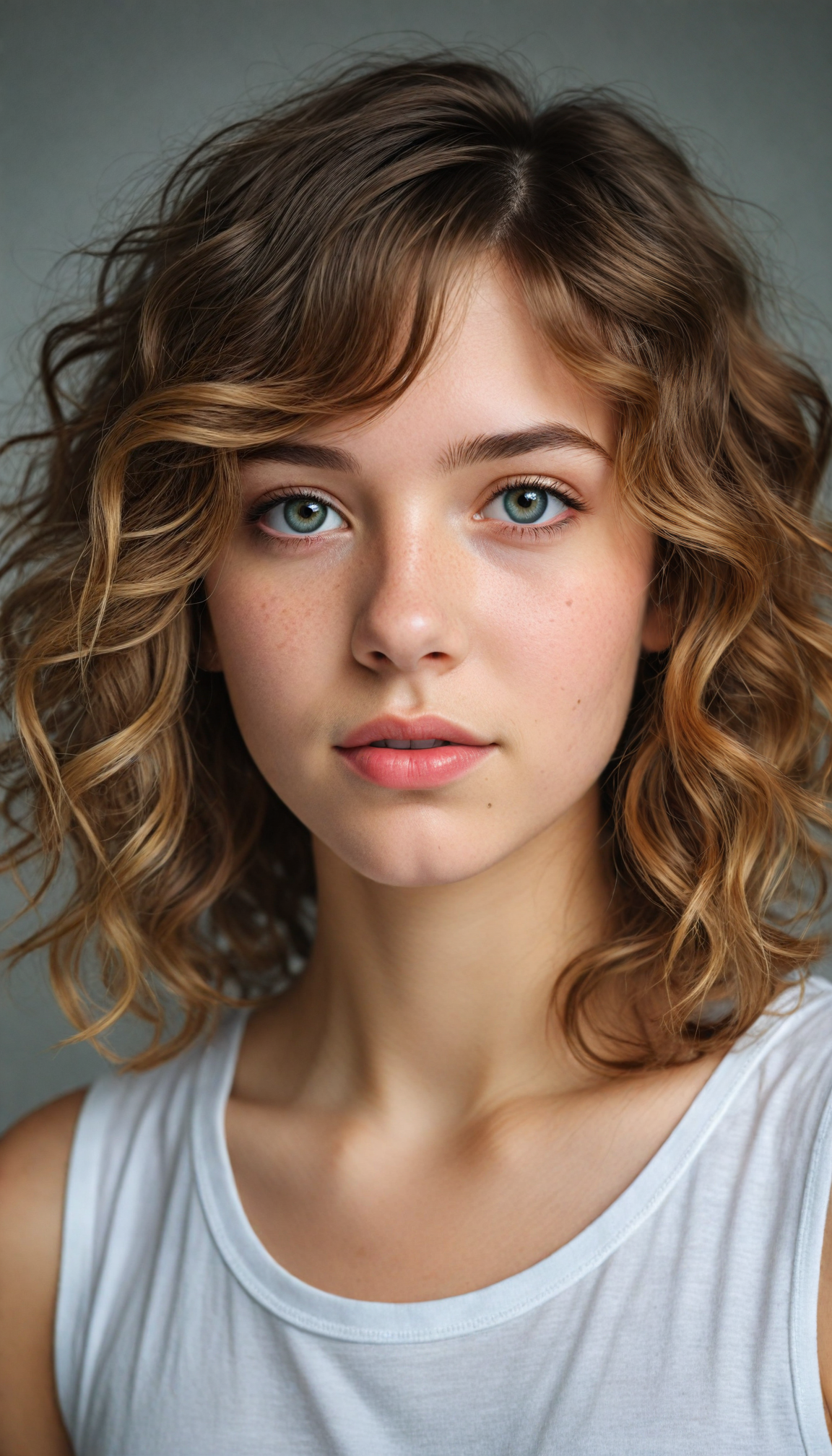 a (beautifully drawn full body portrait) of a (young teen girl with long, messy, straight hair), capturing a (stunningly realistic) curl pattern), advanced facial features that exude cuteness, like (baby-doll eyes), a cropped bang haircut that frames her face, hair color that mimics (hazelnut) tones, a detailed yet angelic complexion, looking directly into the camera, a (side profile portraits), with impeccably drawn curves and contours that match her figure, against a (softly contrasting white backdrop), a short, sleeveless top and super short, cuffed pants that accentuate her (flawless anatomical proportions)