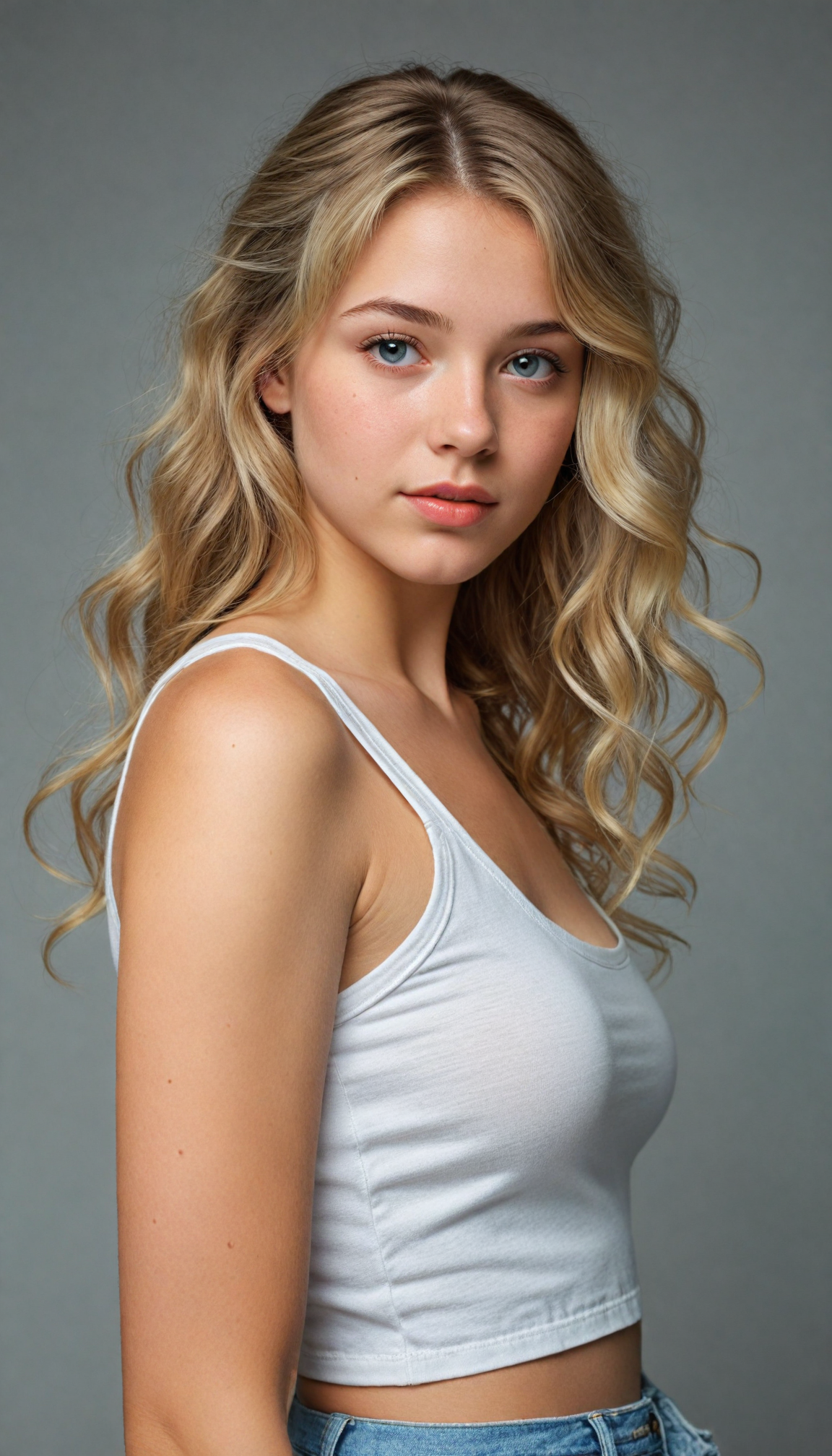 a (beautifully drawn full body portrait) of a (young teen girl with long, jet straight summer blond hair), capturing a (stunningly realistic) curl pattern, advanced facial features that exude cuteness, like (baby-doll eyes), a cropped bang haircut that frames her face, hair color that mimics (hazelnut) tones, a detailed yet angelic complexion, looking directly into the camera, a (side profile portraits), with impeccably drawn curves and contours that match her figure, against a (softly contrasting white backdrop), a short, sleeveless top and super short, cuffed pants that accentuate her (flawless anatomical proportions)