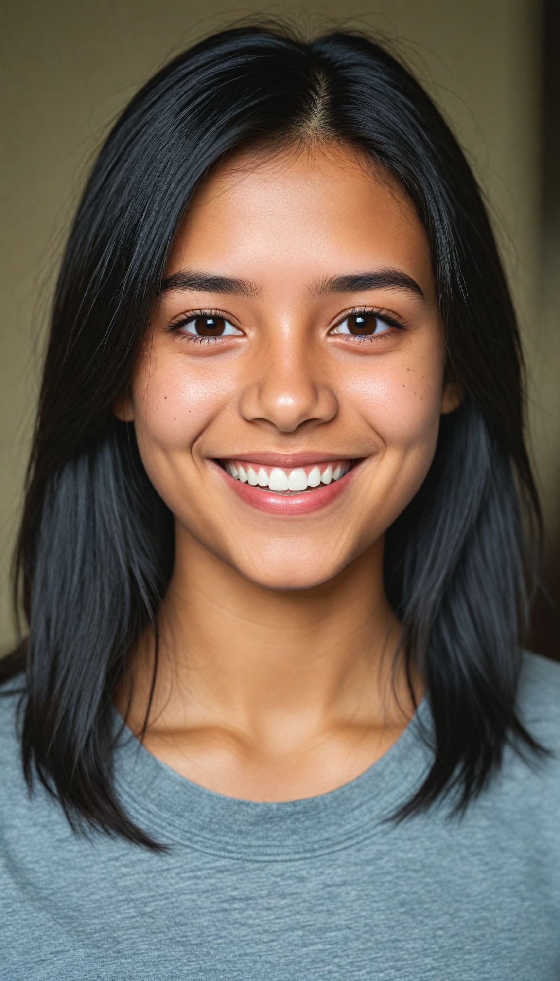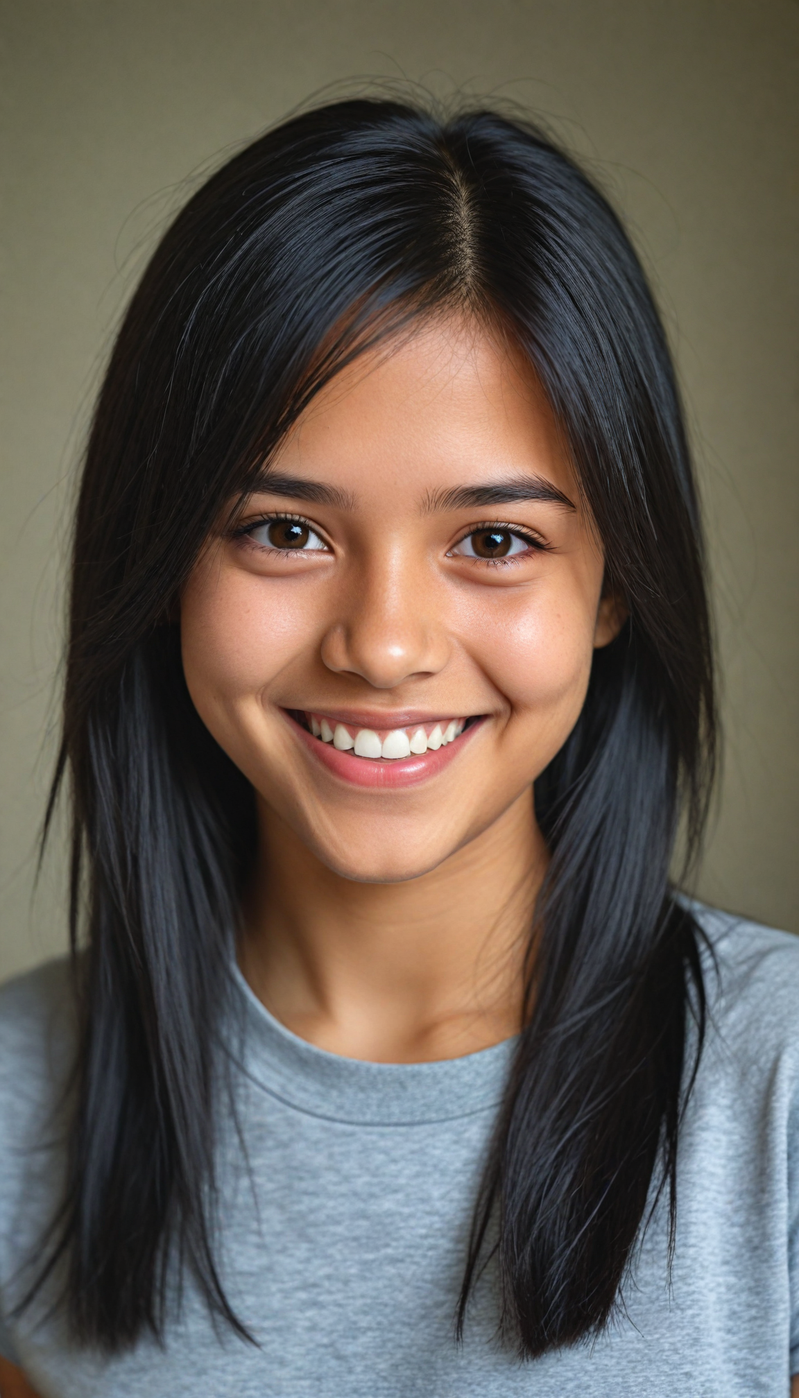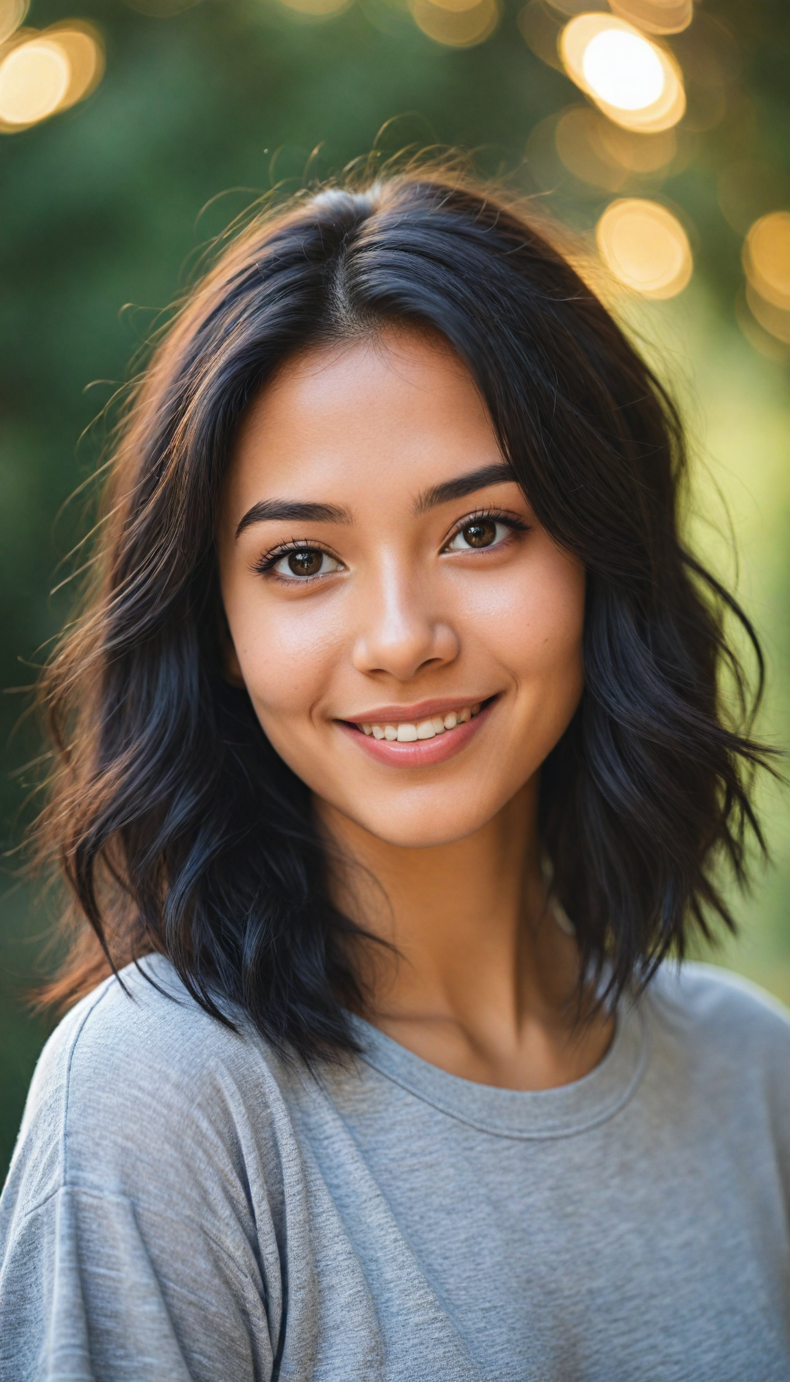 captivating portrait of an enchanting young exotic girl with a playful smile, wearing a soft grey t-shirt that contrasts with her flowing, intricately detailed black straight hair cascading around her shoulders. Her expressive brown eyes sparkle with joy and mischief, framed by delicate lashes, while her perfectly curved silhouette subtly blends into the soft, warm background reminiscent of a dreamy sunset. The composition captures an ethereal quality, enhanced by gentle bokeh effects that add a sense of whimsy, inspired by the warmth of impressionist art and the charm of contemporary portrait photography.