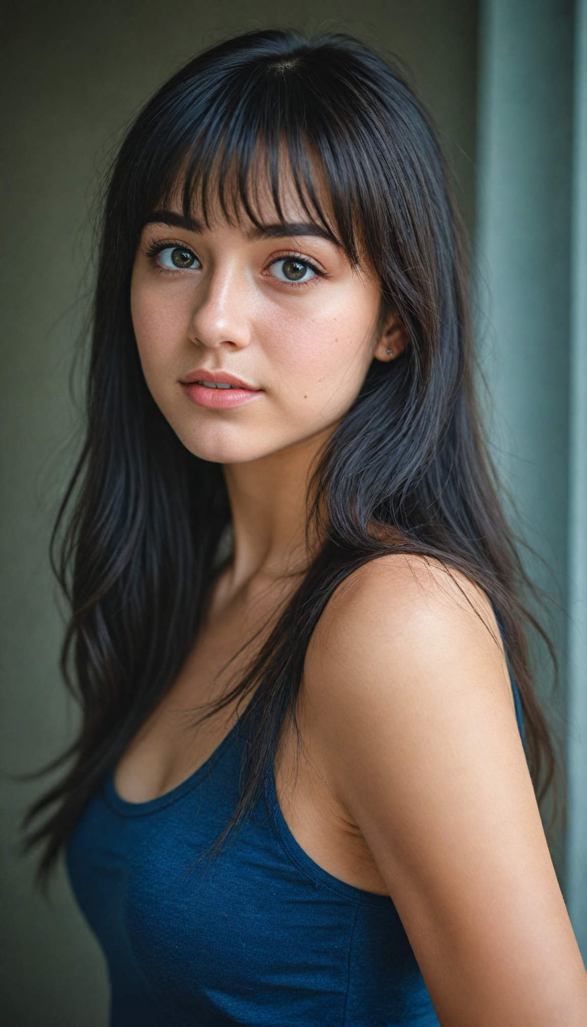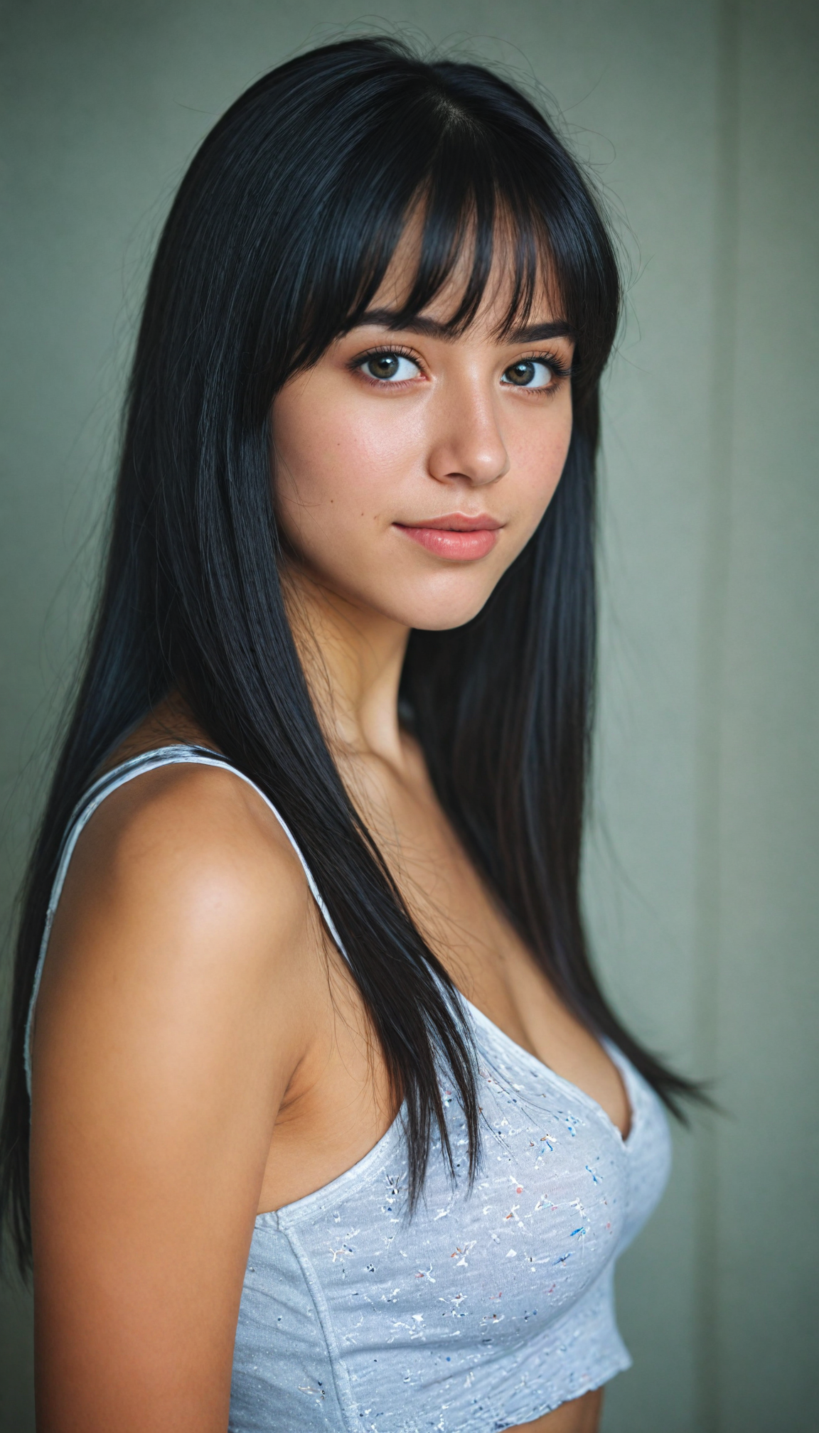 a (young girlie), wears a short cropped black tank top, straight soft long black hair, (round face), full kissable lips, round eyes, perfect skin