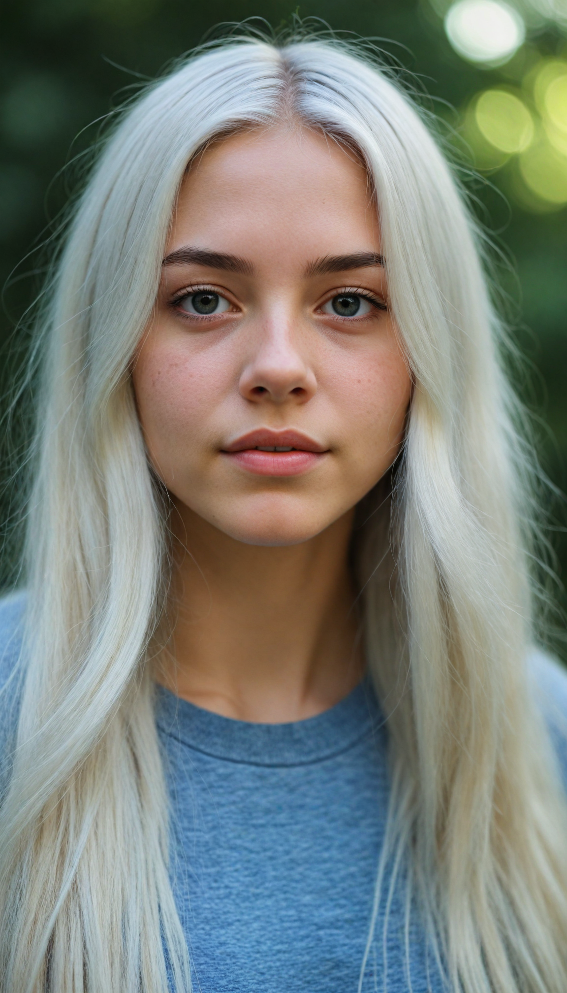 detailed and realistic photo from a young teenage girl, straight long jet soft white hair, natural backdrop