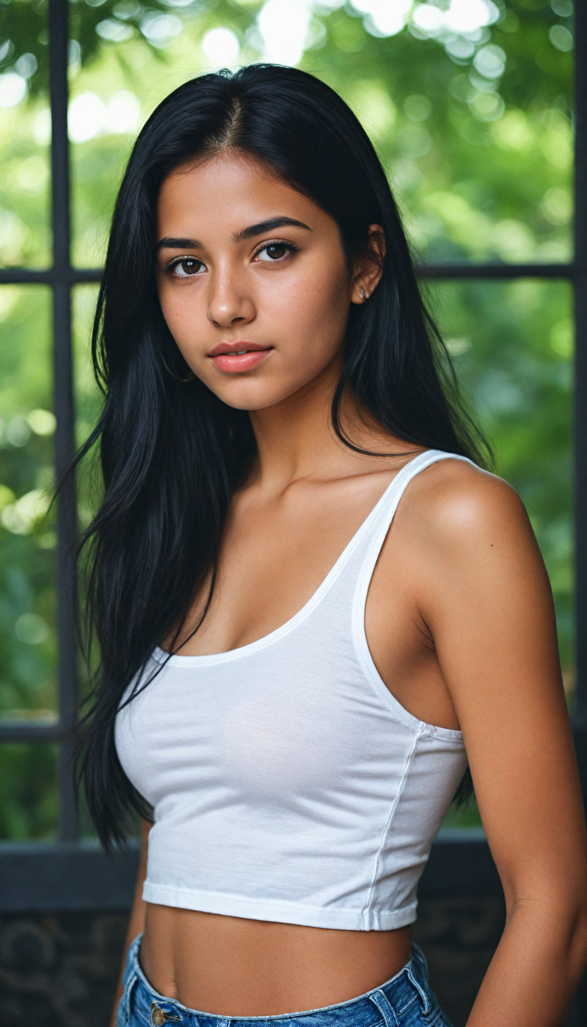 a (stunningly gorgeous) (detailed and realistic portrait) featuring a cute Arab teen girl who wears a (white short cropped tank top), long straight obsidian black hair, she has a perfect curved body