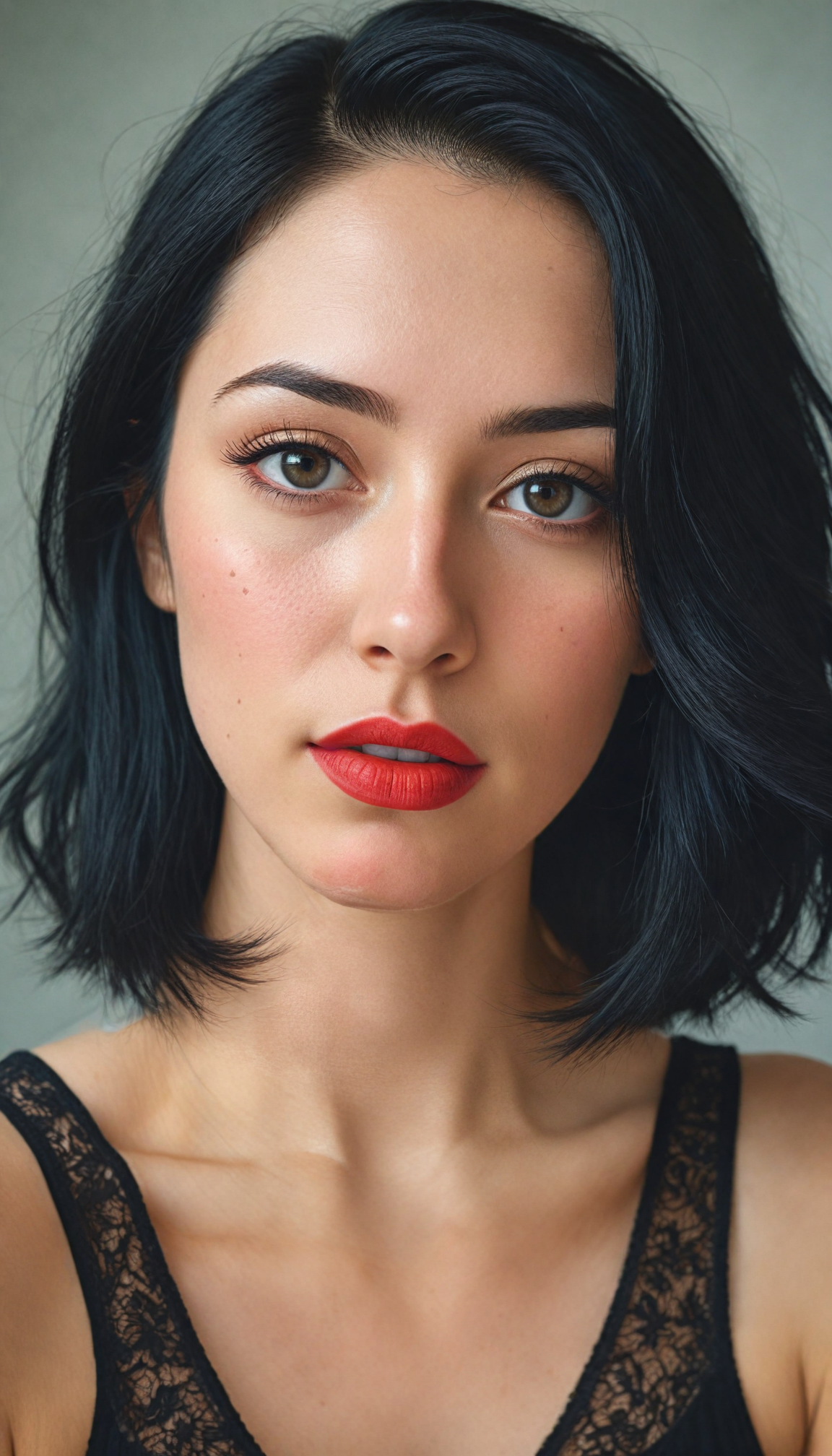a captivating and intriguing portrait of a young girl with straight black hair cascading over her shoulders, her round face framed delicately by soft highlights. She wears striking black eyeliner that accentuates her mesmerizing dark eyes, paired with vibrant red lips that exude allure. Dressed in a stylish black cropped tank top with subtle lace details, she poses confidently against a stark white background that emphasizes her features. The image captures an ethereal light, creating soft shadows that add depth, while a hint of melancholy plays in her seductive gaze, reminiscent of a vintage photographic style combined with modern aesthetics