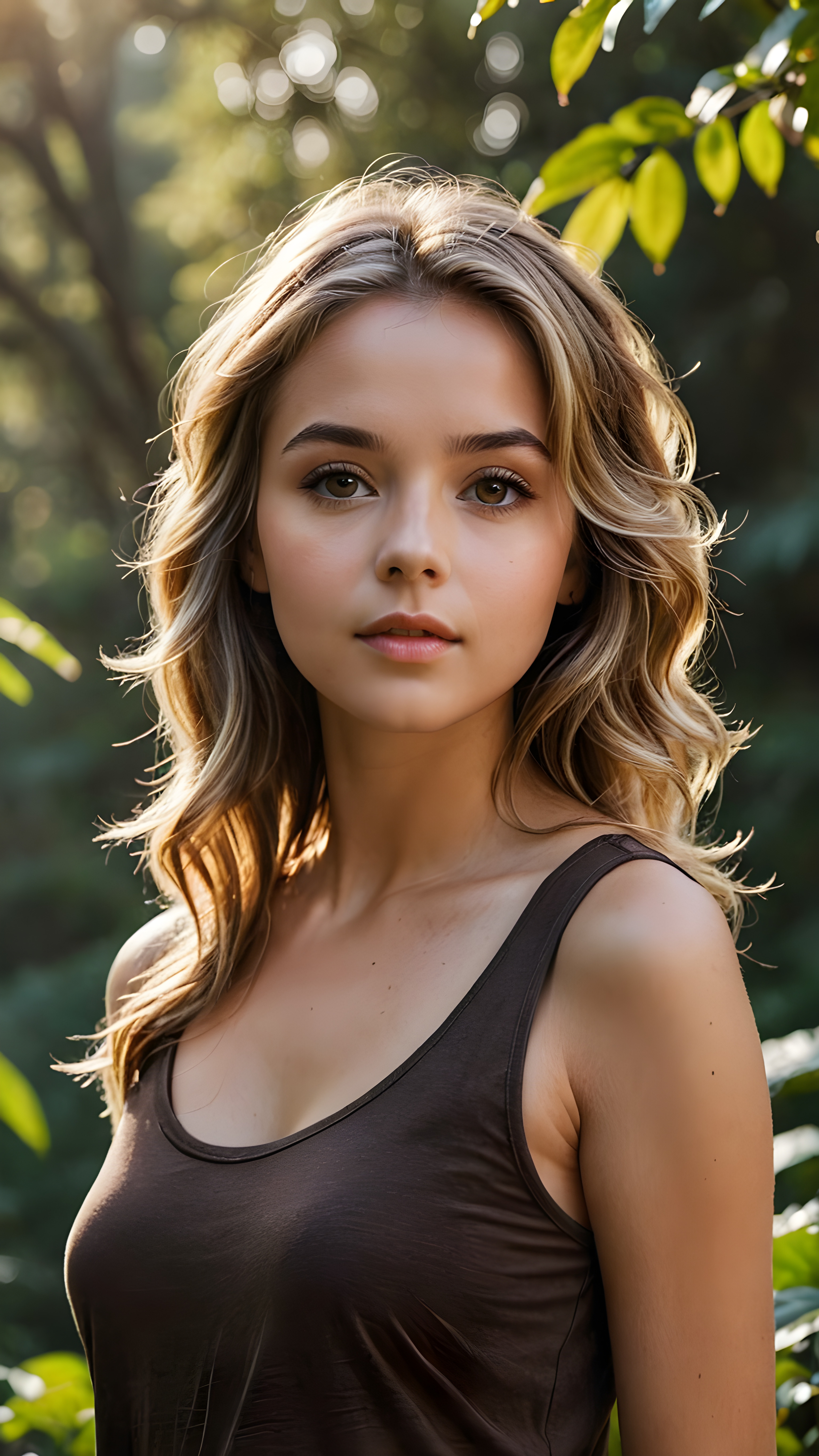 a beautiful (((girl))), with thin but defined figures, dressed in a short, sleeveless, ((dark brown t-shirt)), luxurious, flowing, long, dark blonde waves framing her gently angled face with soft, naturally wavy blonde hair and piercing, brown eyes, set against a backdrop of a (nature-filled) (HD photography) scene, with intricate details and vivid colors that capture the essence of a realistic and natural environment