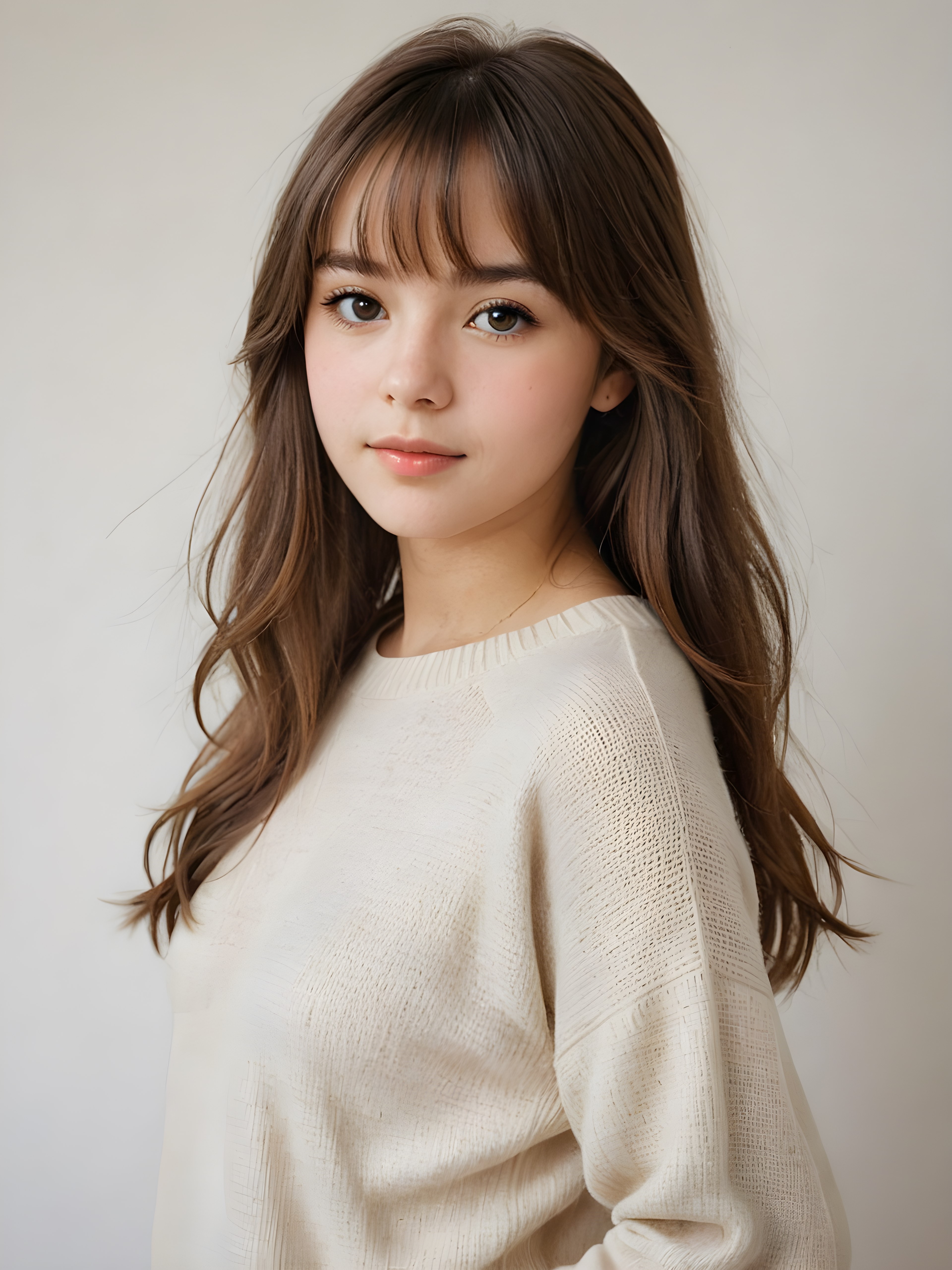 a breathtakingly realistic (((portrait))), capturing the essence of a youthful teen girl with a flawlessly proportioned upper body, long, straight soft hair, bangs cut, aged 15, wears a thin sweater, posed confidently before the viewer, ((a white canvas as a background)), ((side view))