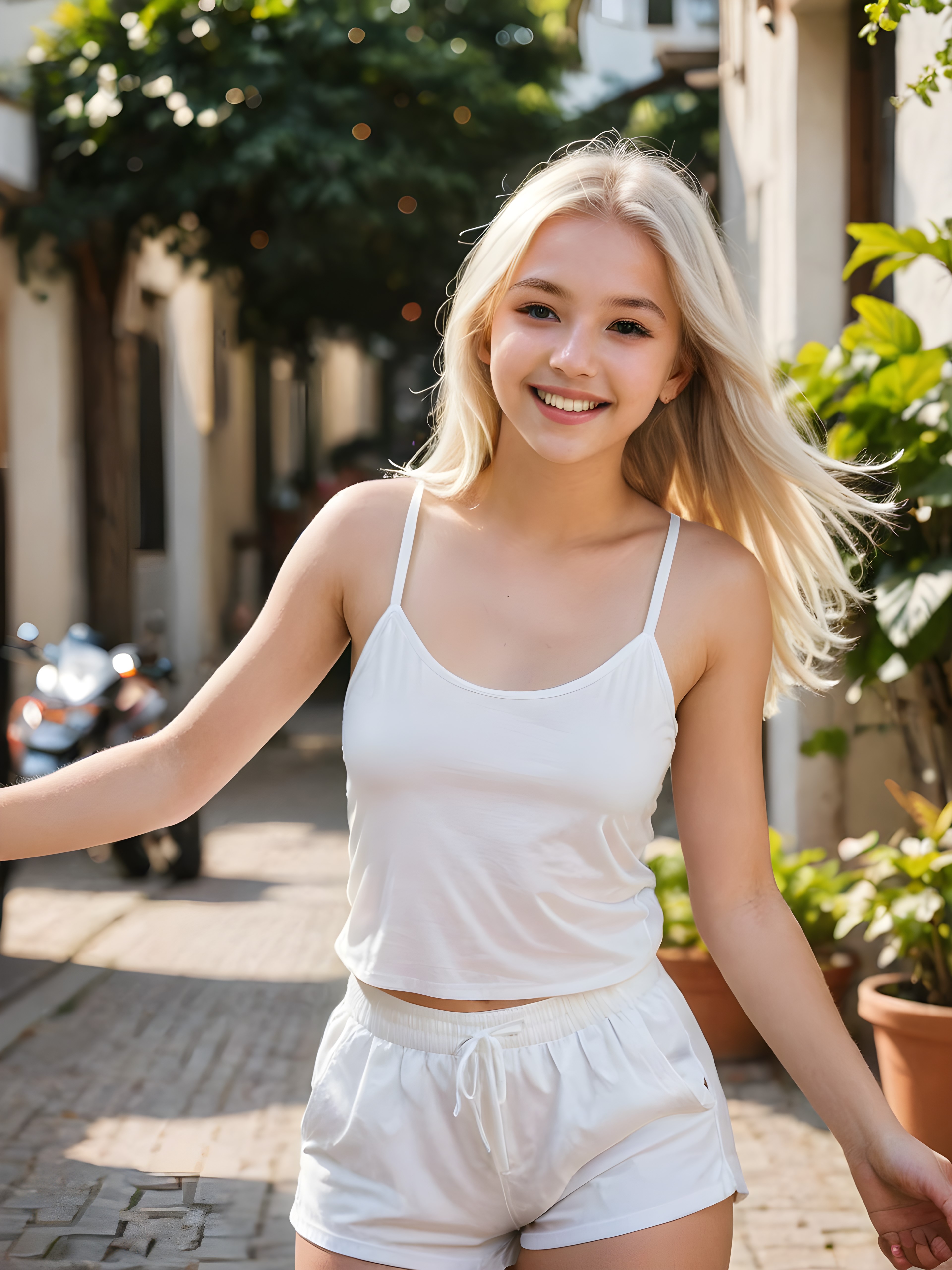 a realistic and detailed portrait of teen girl, 14 years old, in a plunge neck ((short white crop tank top)), ((short pants)), ((angelic round face)), ((white soft long straight hair)) ((in a (((carefree, happy expression)))